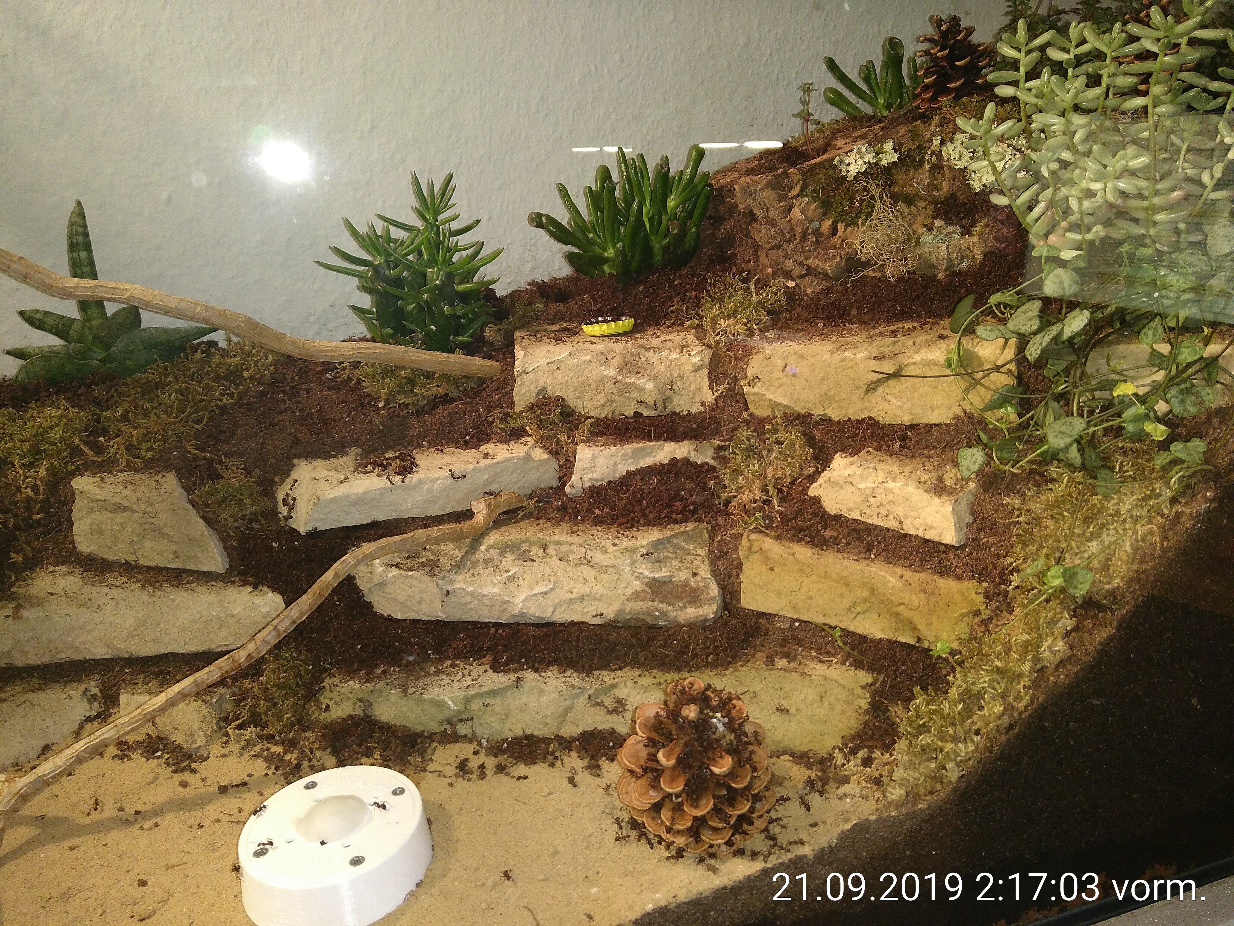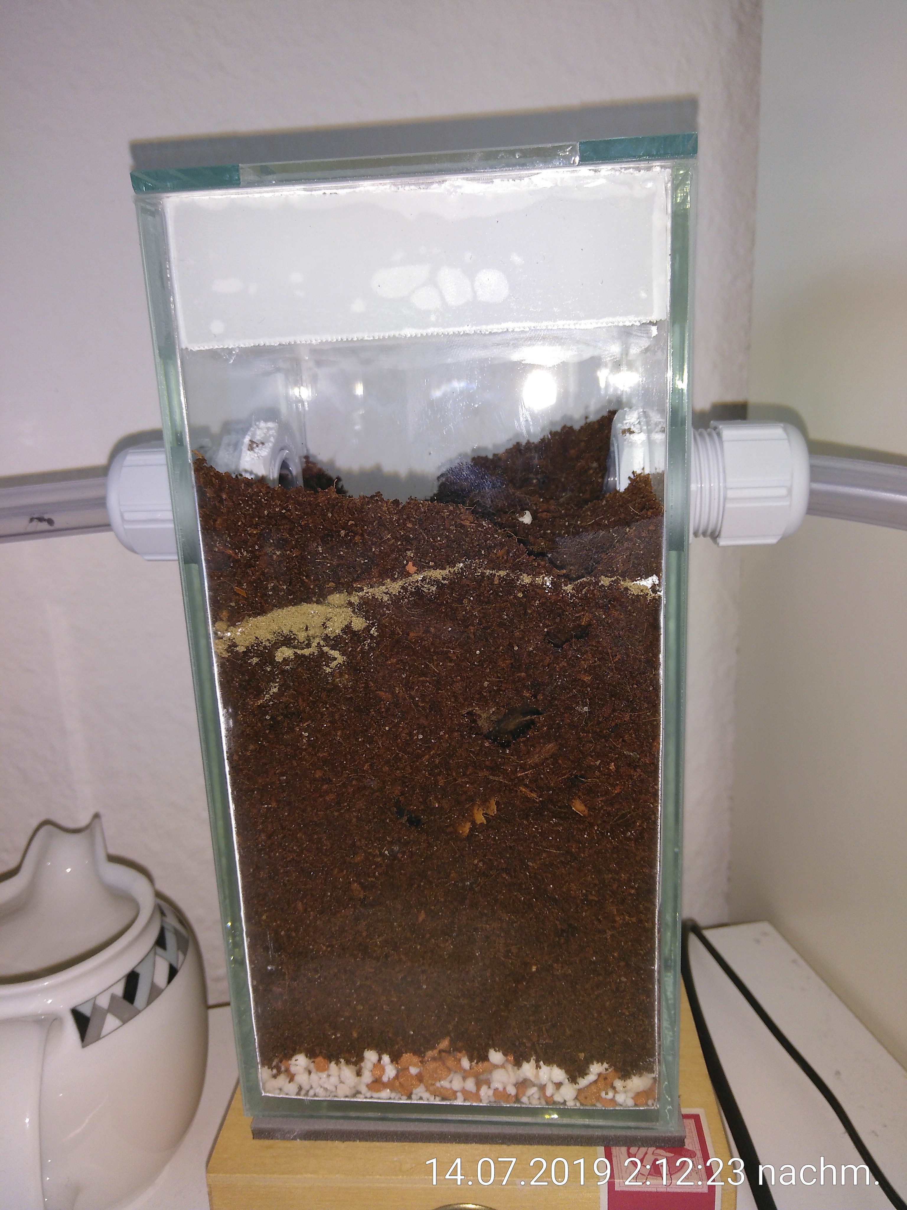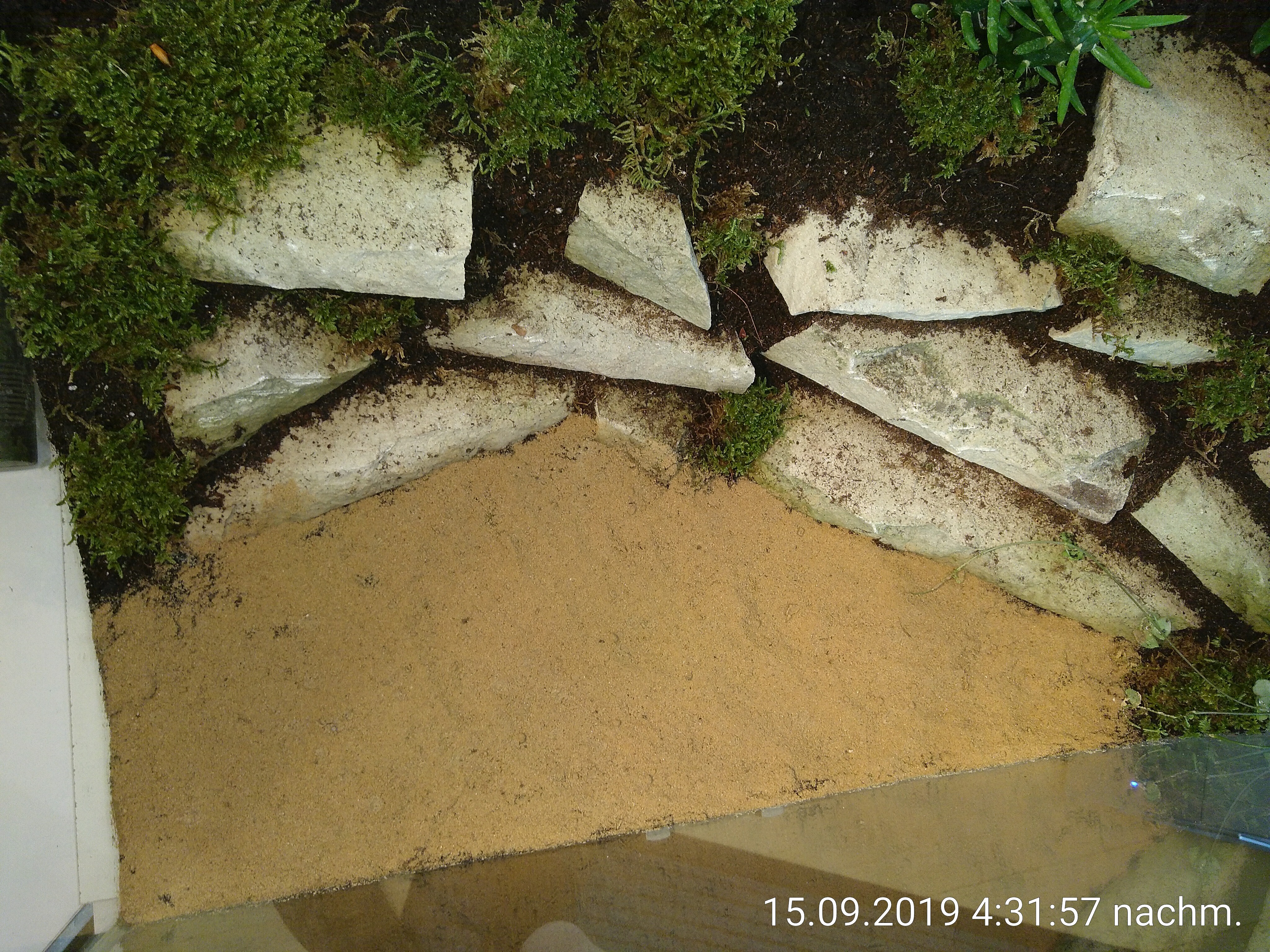 Die nächsten 2 Tage habe ich leider keine Fotos gemacht. Aber der helle Bereich war mehrere cm hoch mit Erde bedeckt und die meisten Steine waren „verschwunden“. Zum Glück habe ich damals den Lehmboden befeuchtet, bevor ich sie reingelassen habe. So kann ich ihn leicht mit einem Pinsel ausfegen. Sie haben aber die Angewohnheit, den Boden so schnell wie möglich komplett zu bedecken. Darum fege ich schon lange nicht mehr so gründlich und nehme immer nur das Gröbste raus. Ich vermute, sie spüren auf dem harten Boden Erschütterungen eher und mögen das nicht. Ist aber nur ne Theorie. Fragen kann ich sie ja nicht. Insgesamt habe ich aus dem Becken schon einen Putzeimer voll Erde raus geholt, natürlich vermischt mit ihren Abfällen.
