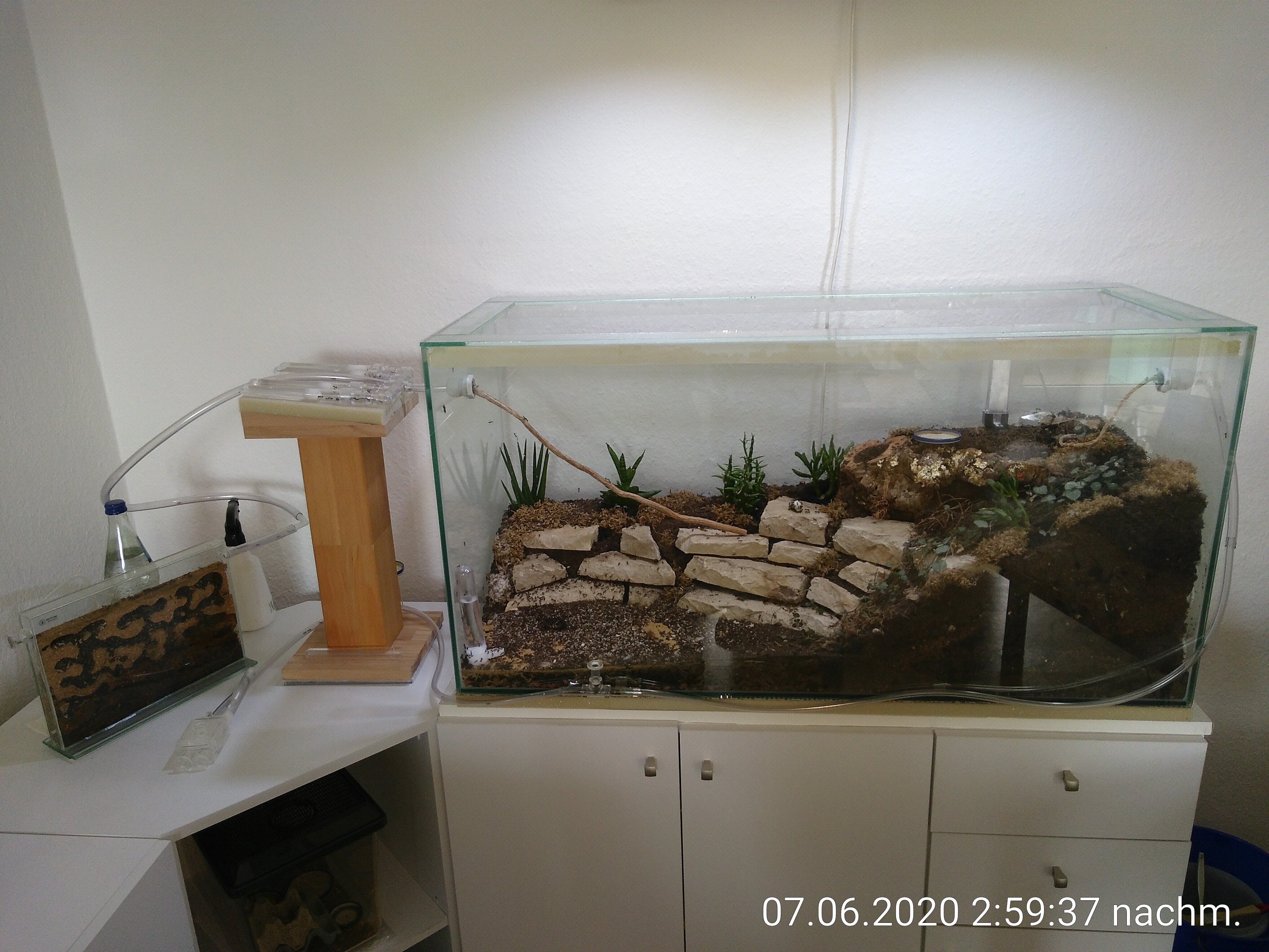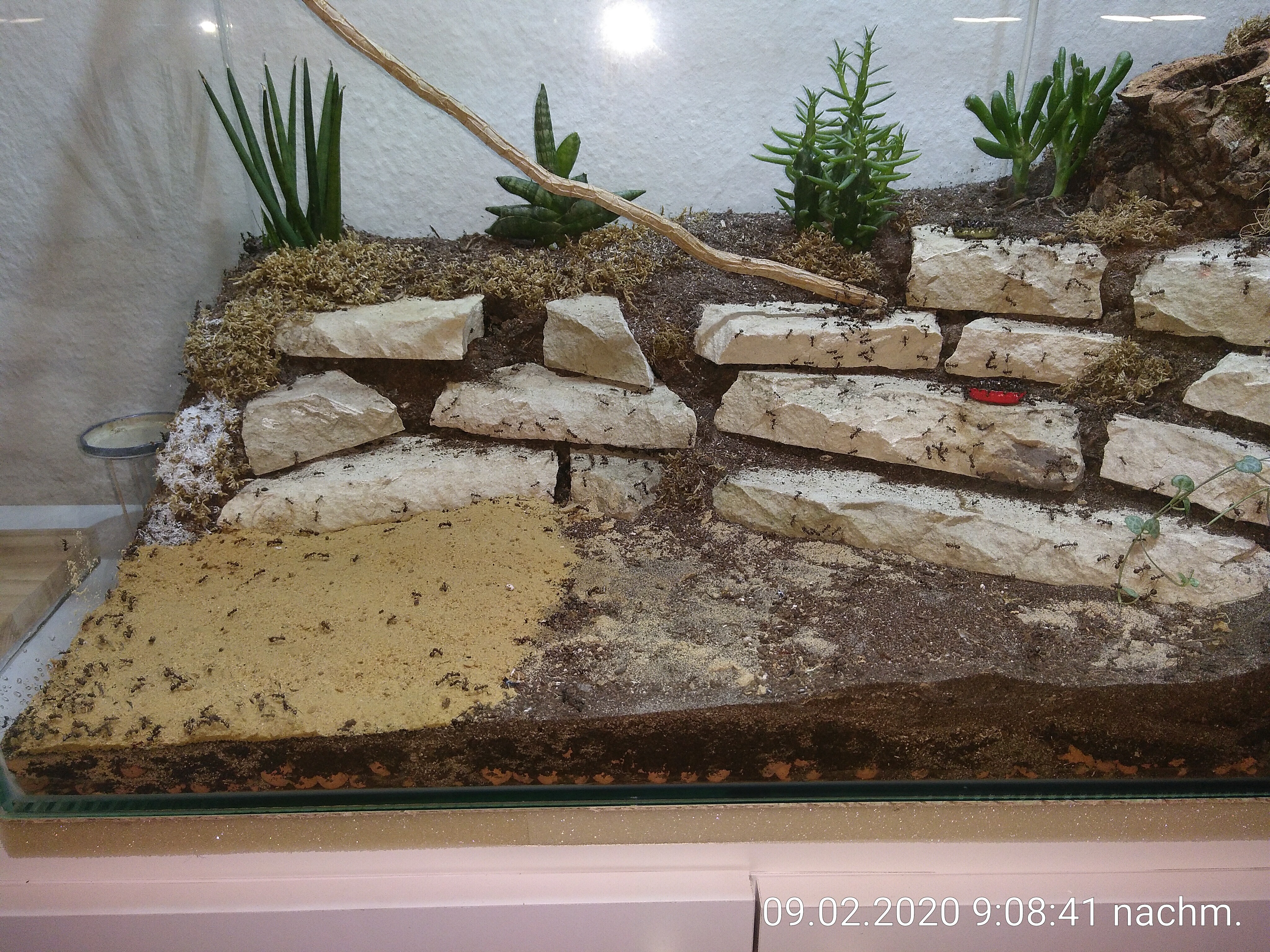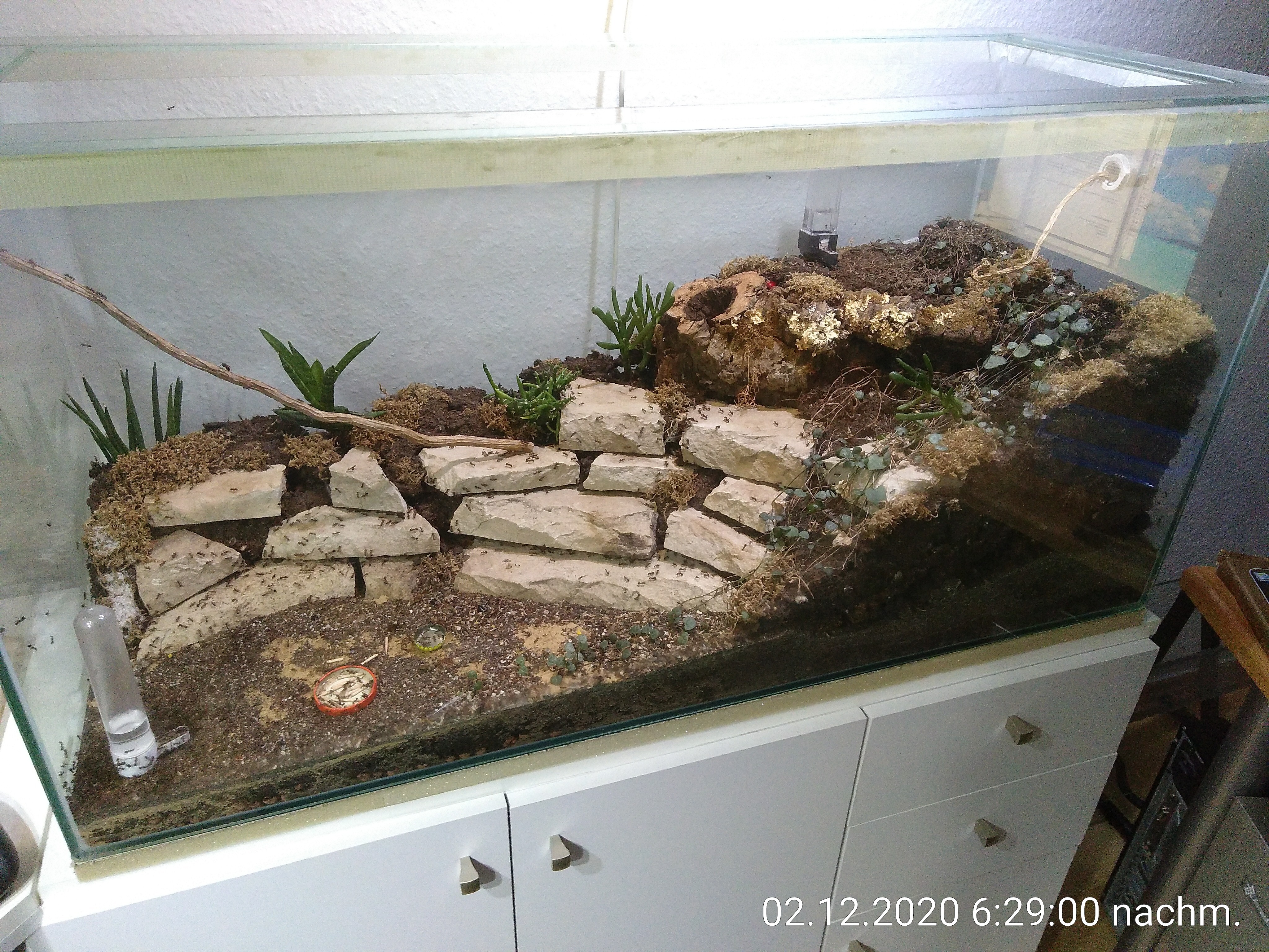 Die nächsten 2 Tage habe ich leider keine Fotos gemacht. Aber der helle Bereich war mehrere cm hoch mit Erde bedeckt und die meisten Steine waren „verschwunden“. Zum Glück habe ich damals den Lehmboden befeuchtet, bevor ich sie reingelassen habe. So kann ich ihn leicht mit einem Pinsel ausfegen. Sie haben aber die Angewohnheit, den Boden so schnell wie möglich komplett zu bedecken. Darum fege ich schon lange nicht mehr so gründlich und nehme immer nur das Gröbste raus. Ich vermute, sie spüren auf dem harten Boden Erschütterungen eher und mögen das nicht. Ist aber nur ne Theorie. Fragen kann ich sie ja nicht. Insgesamt habe ich aus dem Becken schon einen Putzeimer voll Erde raus geholt, natürlich vermischt mit ihren Abfällen.