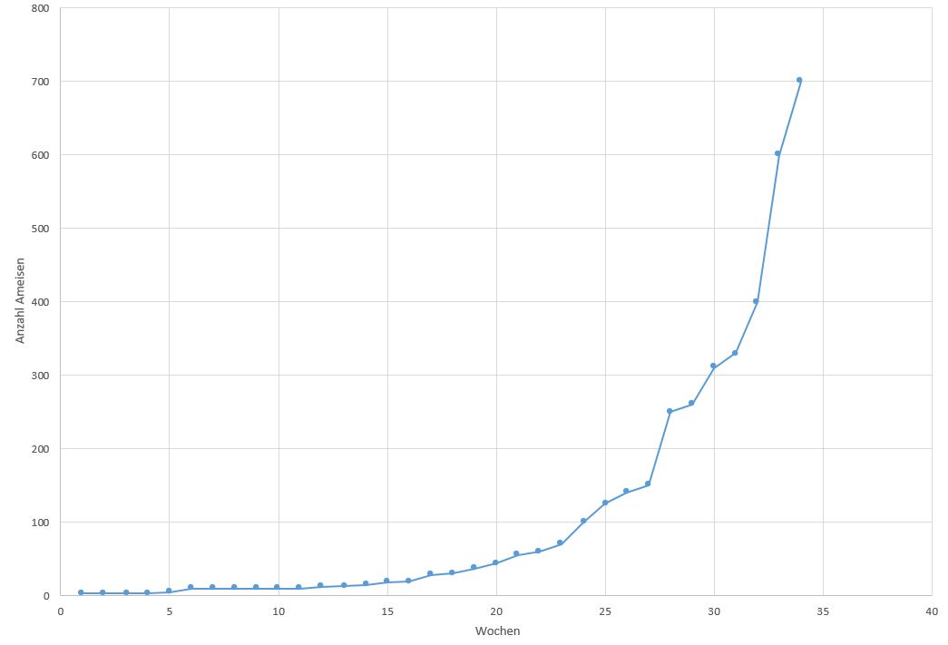 Und wie ihr alle wahrscheinlich auch, habe ich am Anfang immer schön die Arbeiterinnen gezählt, bis es eben nicht mehr ging. Auch grobes Schätzen ging irgendwann nicht mehr. Bis zu dem Zeitpunkt habe ich das Wachstum mal für mich in einem Diagramm festgehalten. Ich glaube, Bilder sagen mehr als Worte...