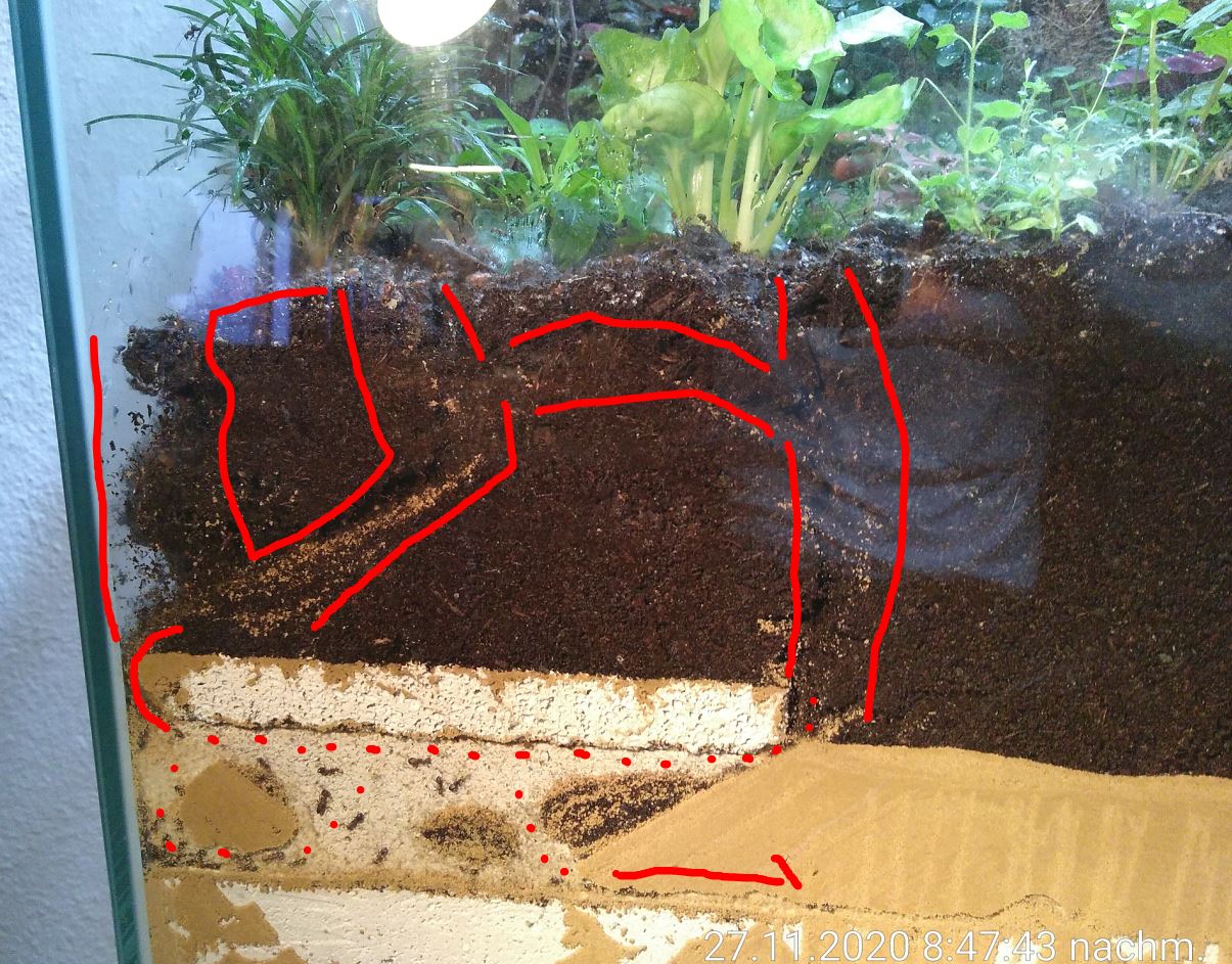 Aber jetzt zu ihren Grabungen. Auf den Bildern sind die Aktivitäten leider nur schwer zu sehen, ich habe die sichtbaren Gänge daher mal rot eingezeichnet.