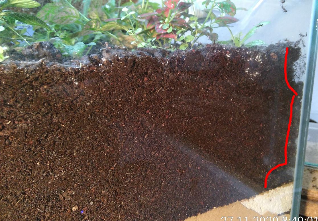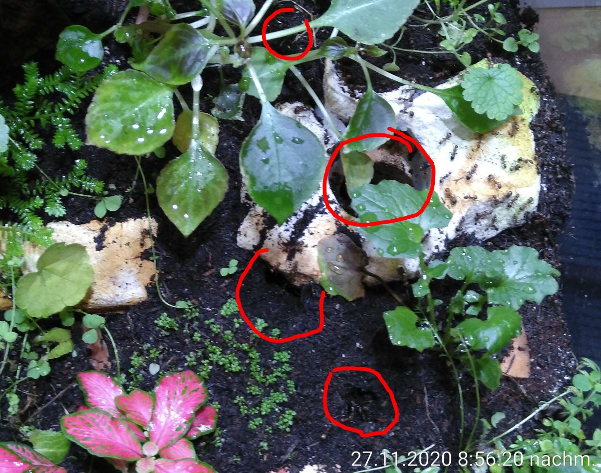 Angefangen haben sie links in der Ecke und direkt am Haupt-Nesteingang. Und dort ist nach wie vor auch die größte Aktivität zu beobachten. Den Aushub scheinen sie u.a. auch ins Steinnest zu bringen. Ich finde zumindest nicht genügend davon an der Oberfläche. Ein guter Teil ist aber im Bereich um den Haupteingang verteilt worden. Eine Pflanze, das kleine Moos, wird das wohl nicht überleben. Ich habe mir vorgenommen, möglichst wenig einzugreifen, zumindest so lange die Pflanzen nicht zu hoch werden. Das soll ein Urwald werden.