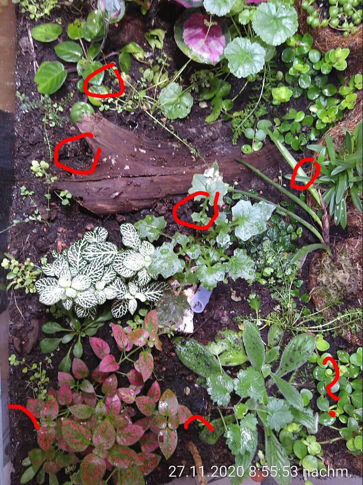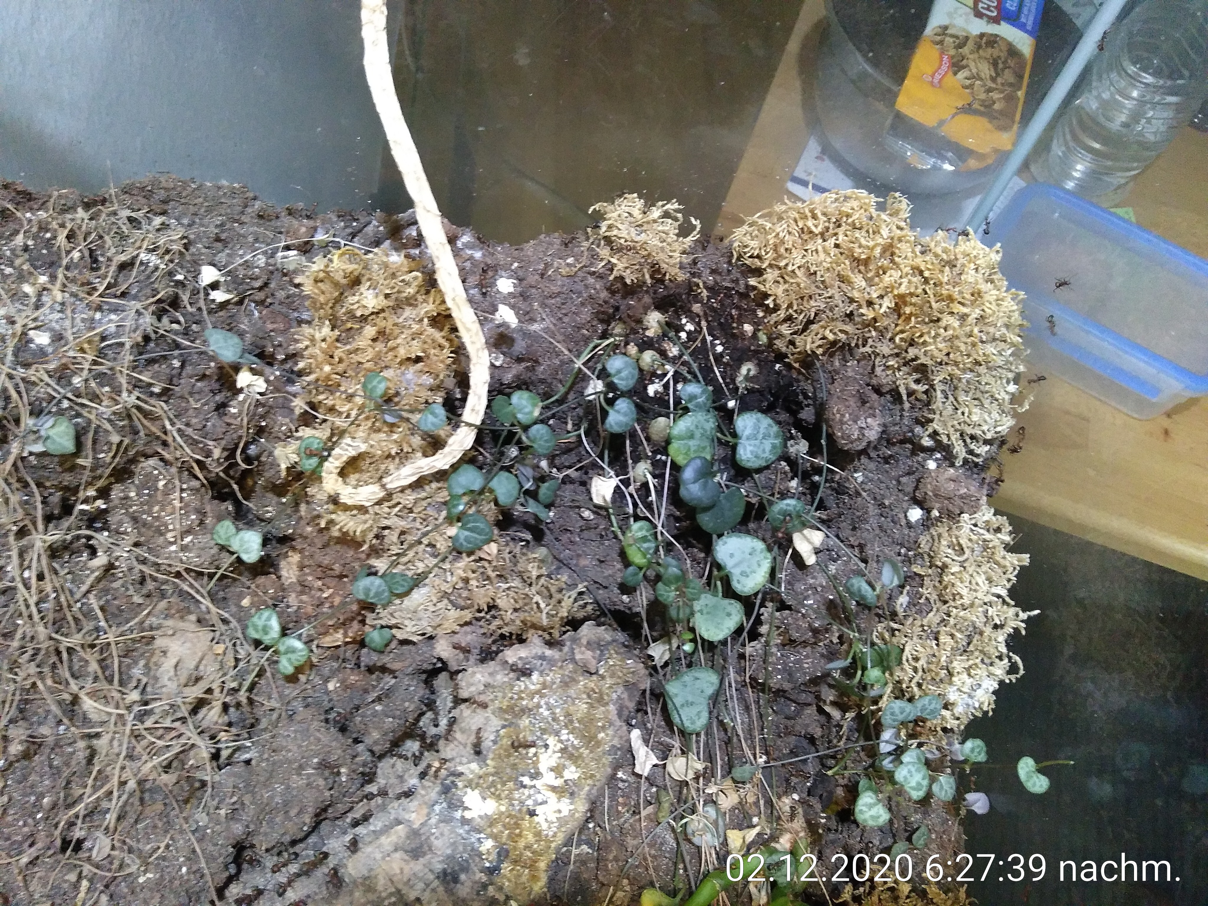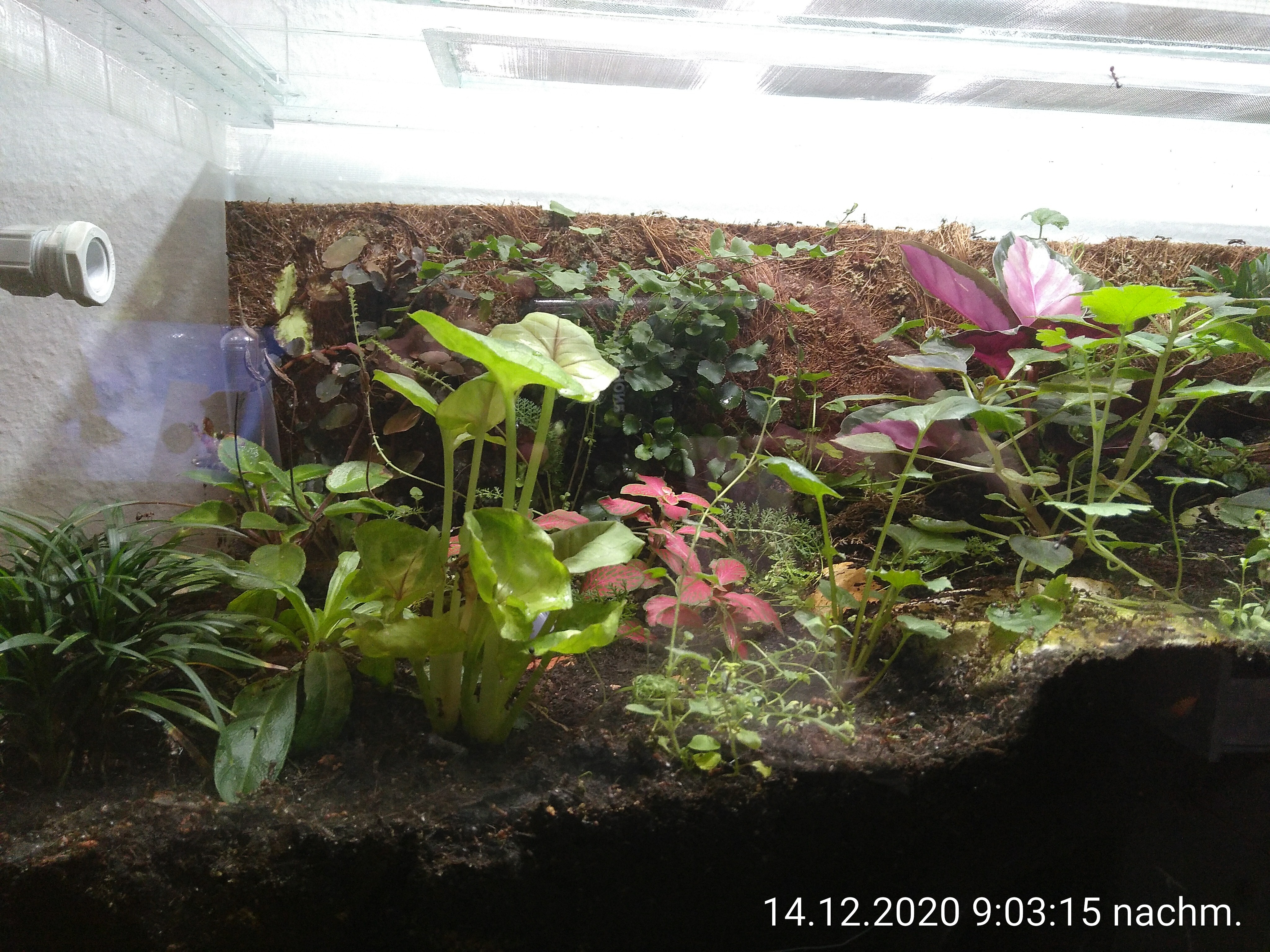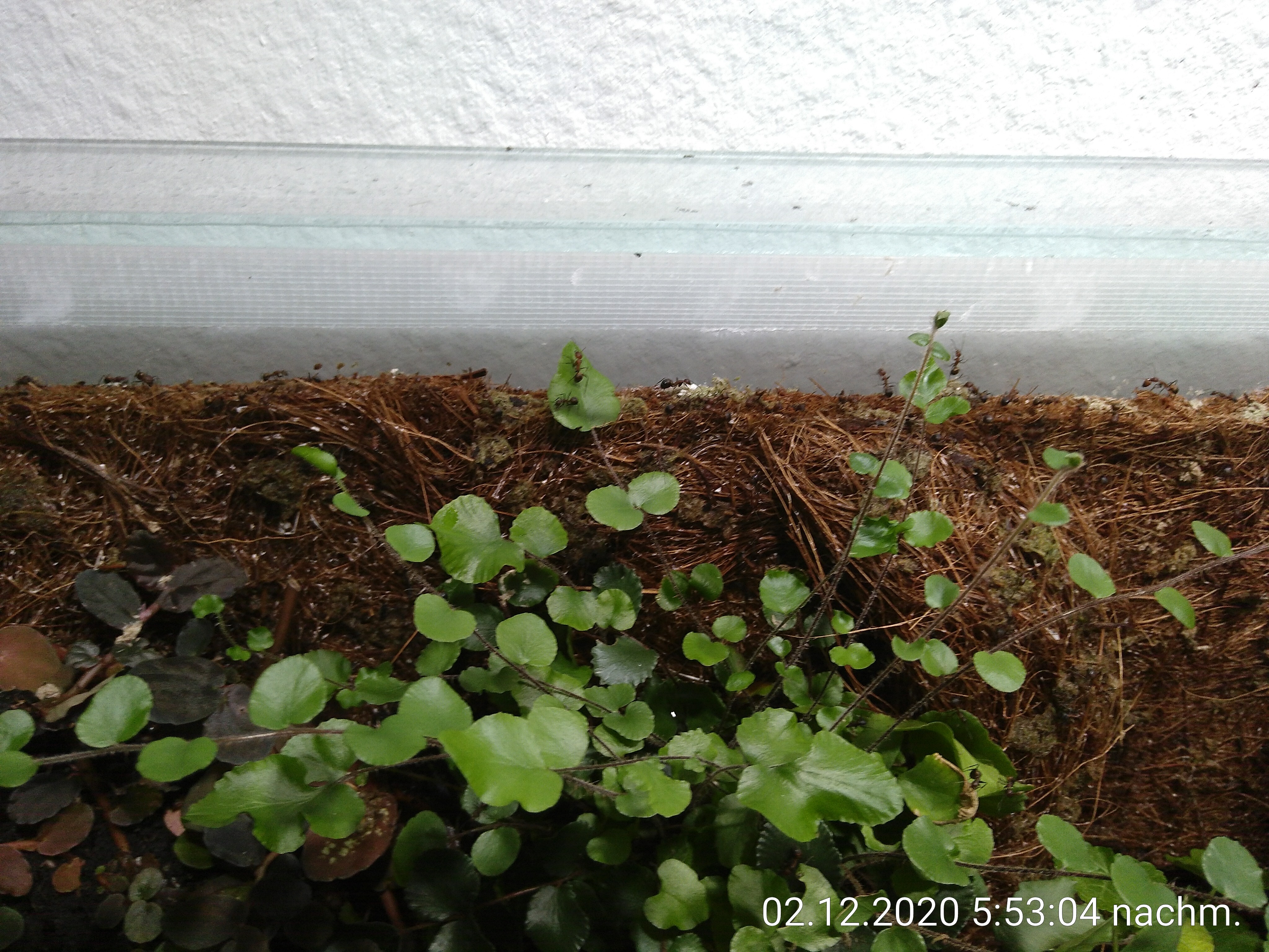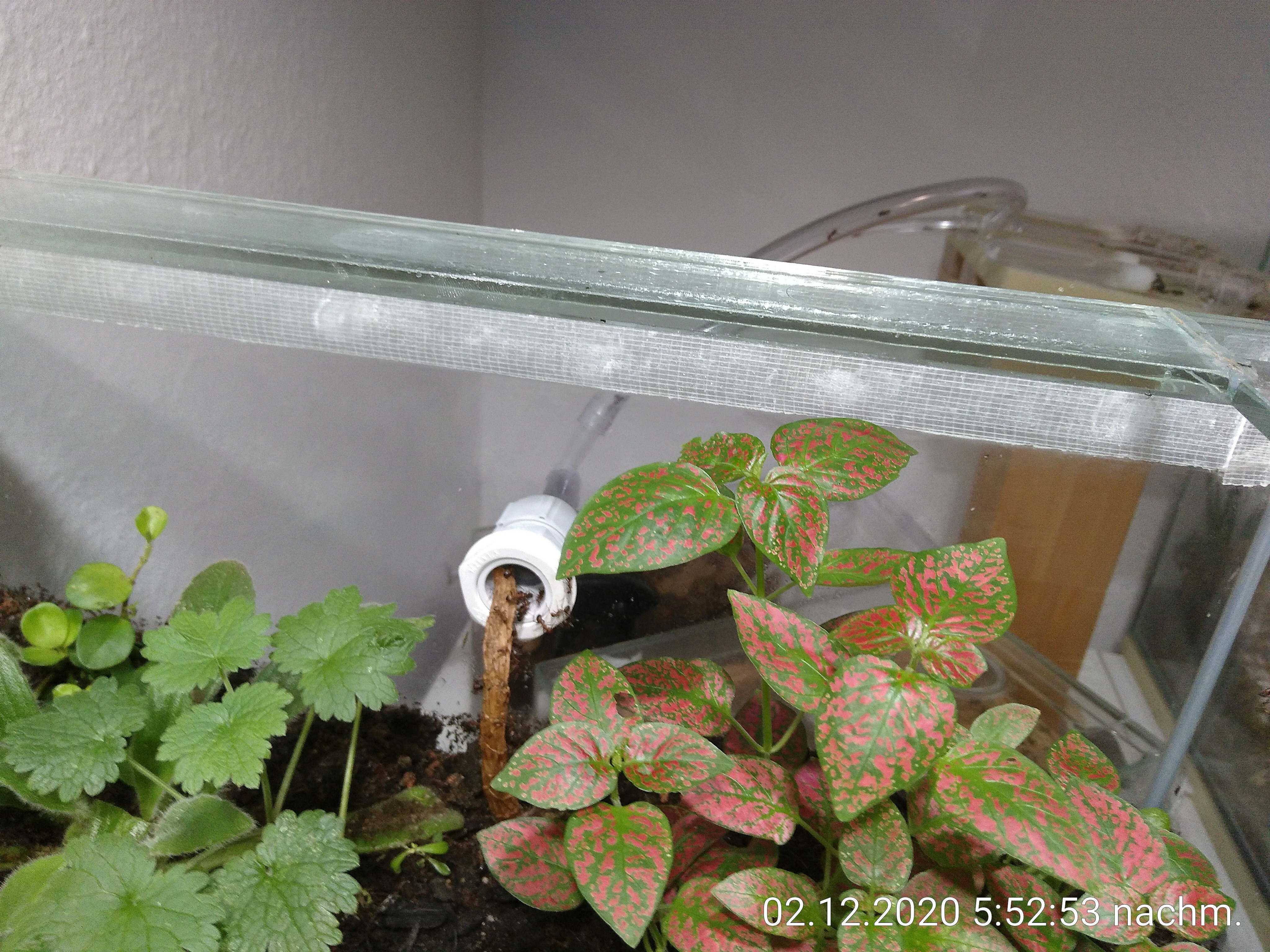 Im neuen Becken ist in den letzten Tagen nicht viel berichtenswertes passiert. Obwohl... Ein paar der Pflanzen gehen in den letzten Tagen richtig ab und tendieren gegen Deckel. Die Ranke an der Rückwand kann ich einfach „verbiegen“ und lenken, sollte kein Problem sein. Die Pflanze in der Mitte muss ich wohl beschneiden, genau wie die ganz rechts mit den rötlichen Blättern. Schade, die ist echt schön, die hätte ich wohl besser links im Becken positioniert, aber Sicherheit geht vor. Ameisen am Deckel habe ich schließlich jetzt schon mehr als ich will.