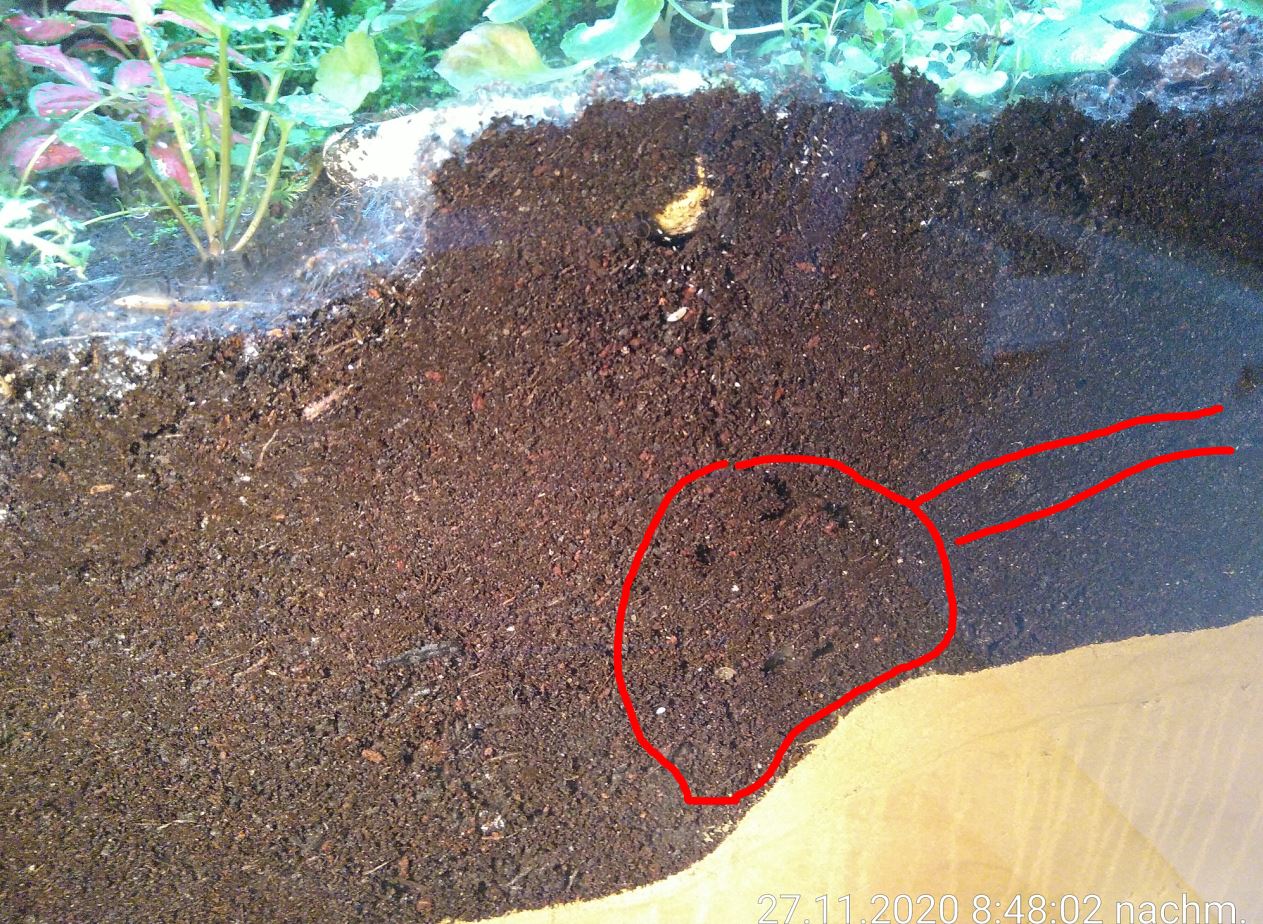 Ich hatte zwar im Stillen gehofft, dass sie den Platz unter der Erde und die Oberfläche bevölkern und die Pflanzen weitestgehend in Ruhe lassen. Aber eigentlich wusste ich es. Sie werden graben. Und das können sie jetzt wieder ausgiebig. Und ich werde sie nicht daran hindern. Wie und warum sollte ich auch? Ich freue mich, dass ich ihnen anscheinend etwas gebaut habe, das sie gerne mögen und wo sie sich austoben können. Ich hoffe, es kommt ihrer Art zu leben, möglichst nahe. Da sie in der Natur weit verbreitet und laut Literatur Opportunisten sind, leben sie irgendwo in Südostasien bestimmt auch in einer ähnlichen Umgebung. Genau wie beim alten Becken. Hoffentlich.