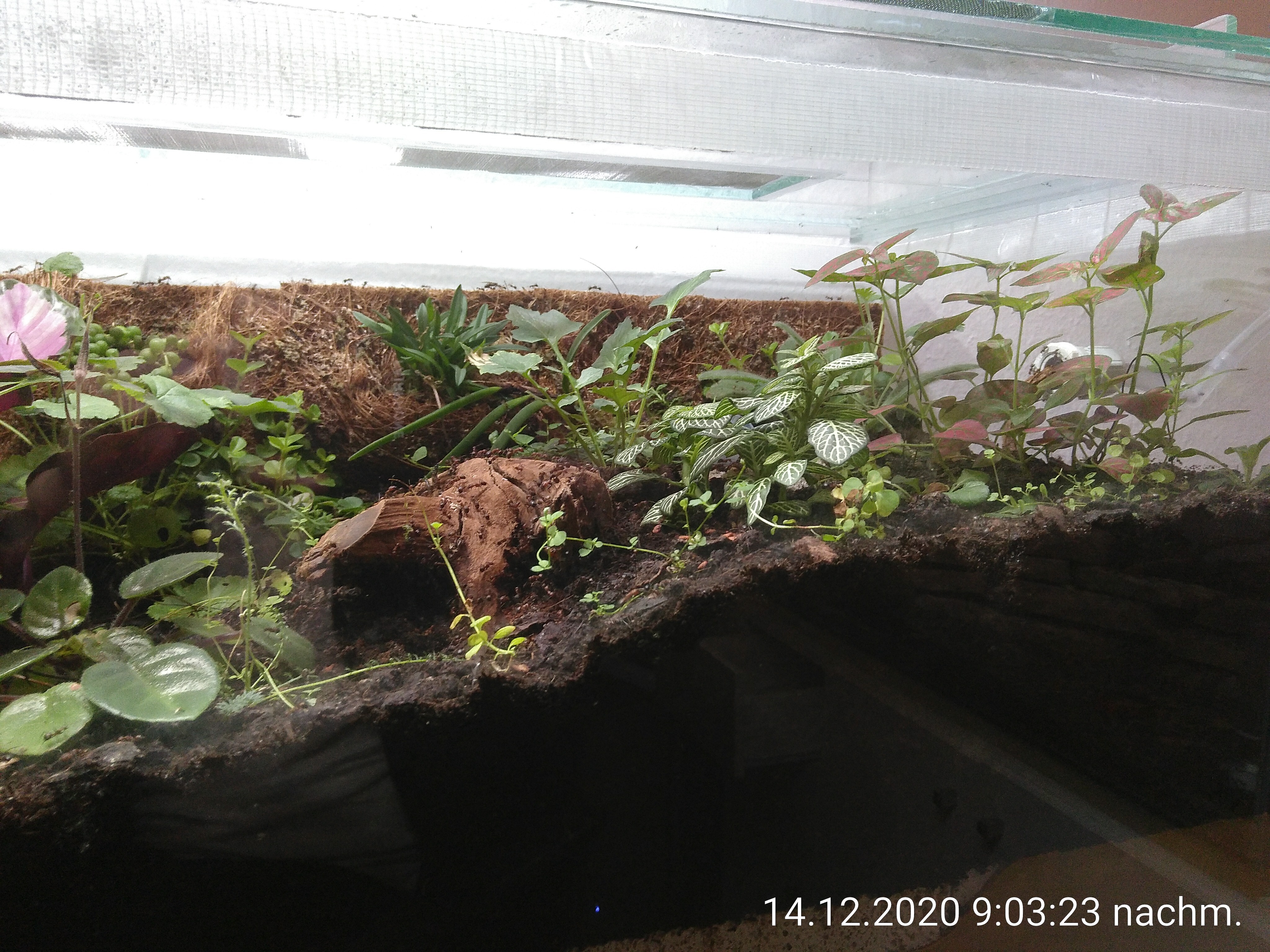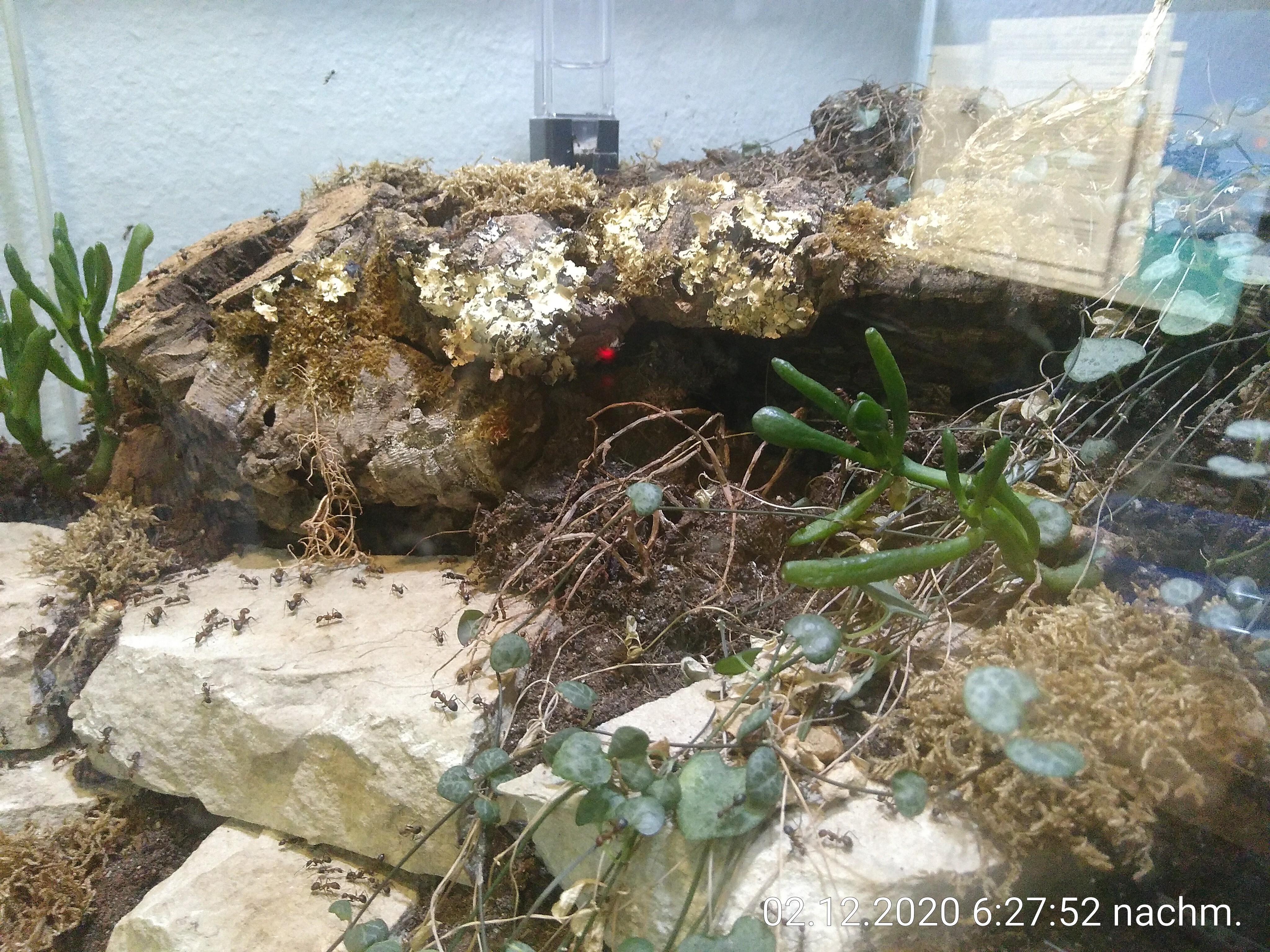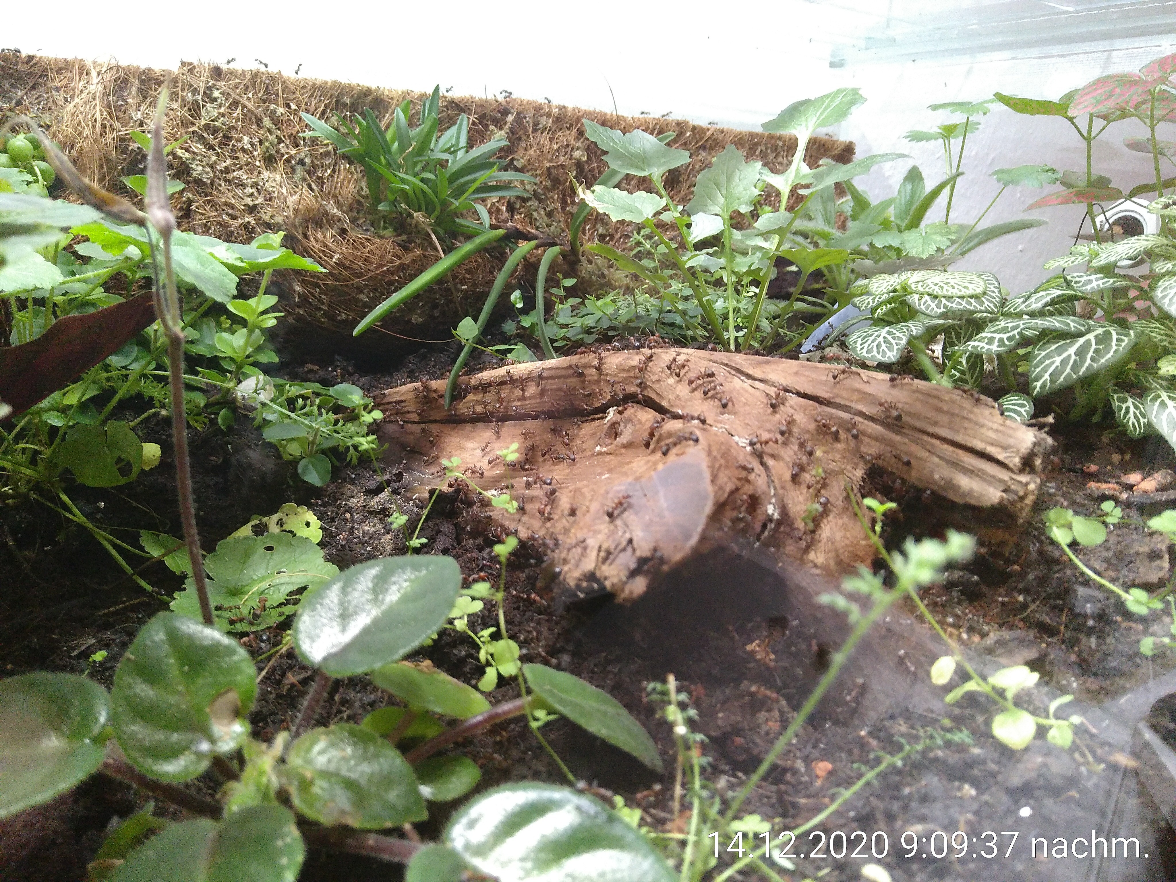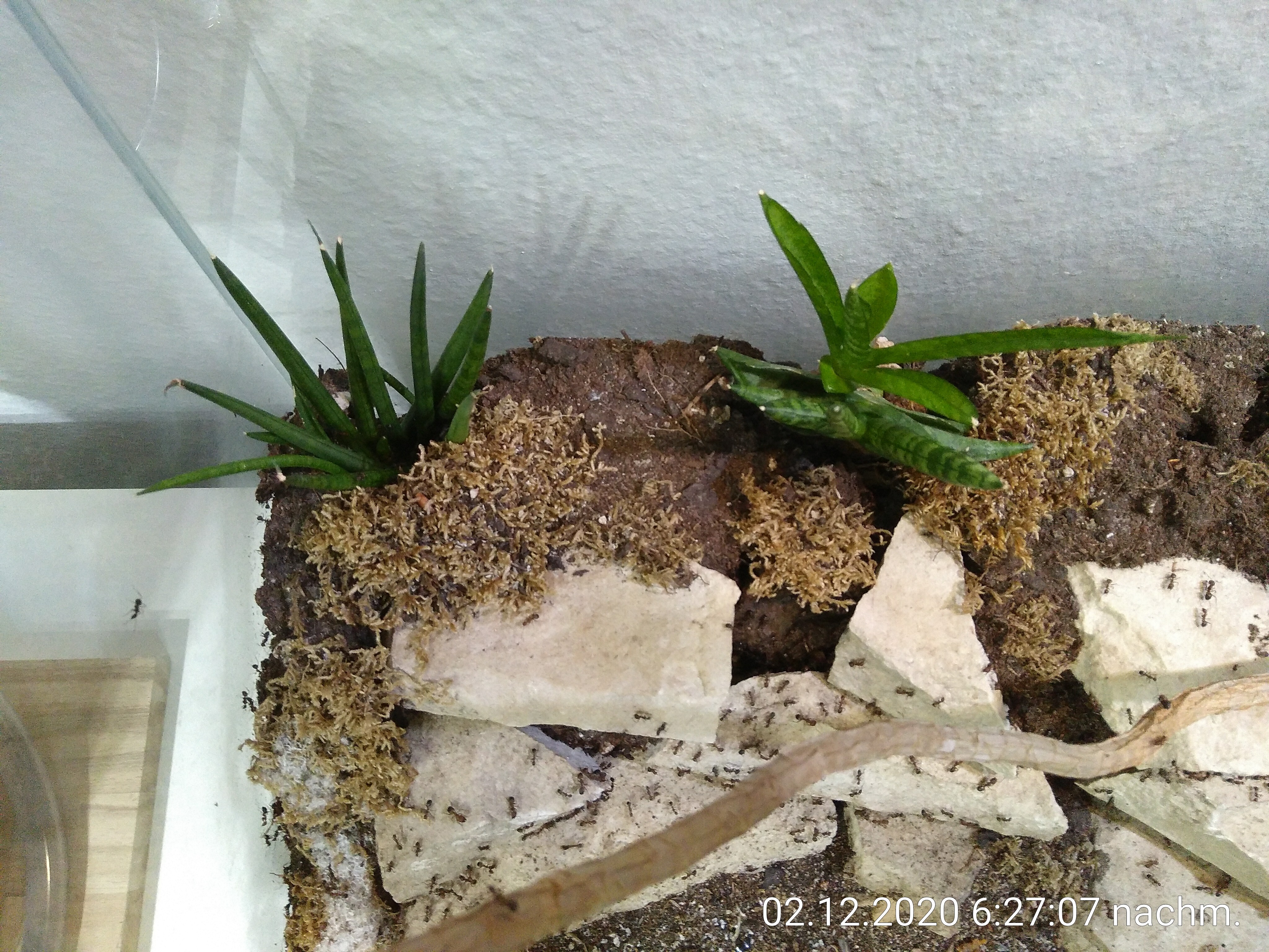Ich habe das Wachstum dieser Pflanze etwas unterschätzt. Gestern waren es noch ein paar Ameisenlängen bis zum Deckel. Aber heute Abend waren ca. 30 ungeflügelte Arbeiterinnen am Deckel. Ich musste zum ersten mal meine Ameisenpinzette benutzen! Das war bisher echt noch nie nötig! Zum Glück sind meine Nicos, wie immer eigentlich, sehr kooperativ gewesen. Ich habe den Deckel umgedreht auf den Boden gelegt und sie nach und nach wieder ins Becken gebracht. Keine einzige hat versucht, den Deckel zu verlassen oder auch nur auf die Unterseite zu klettern. Danke Nicos!