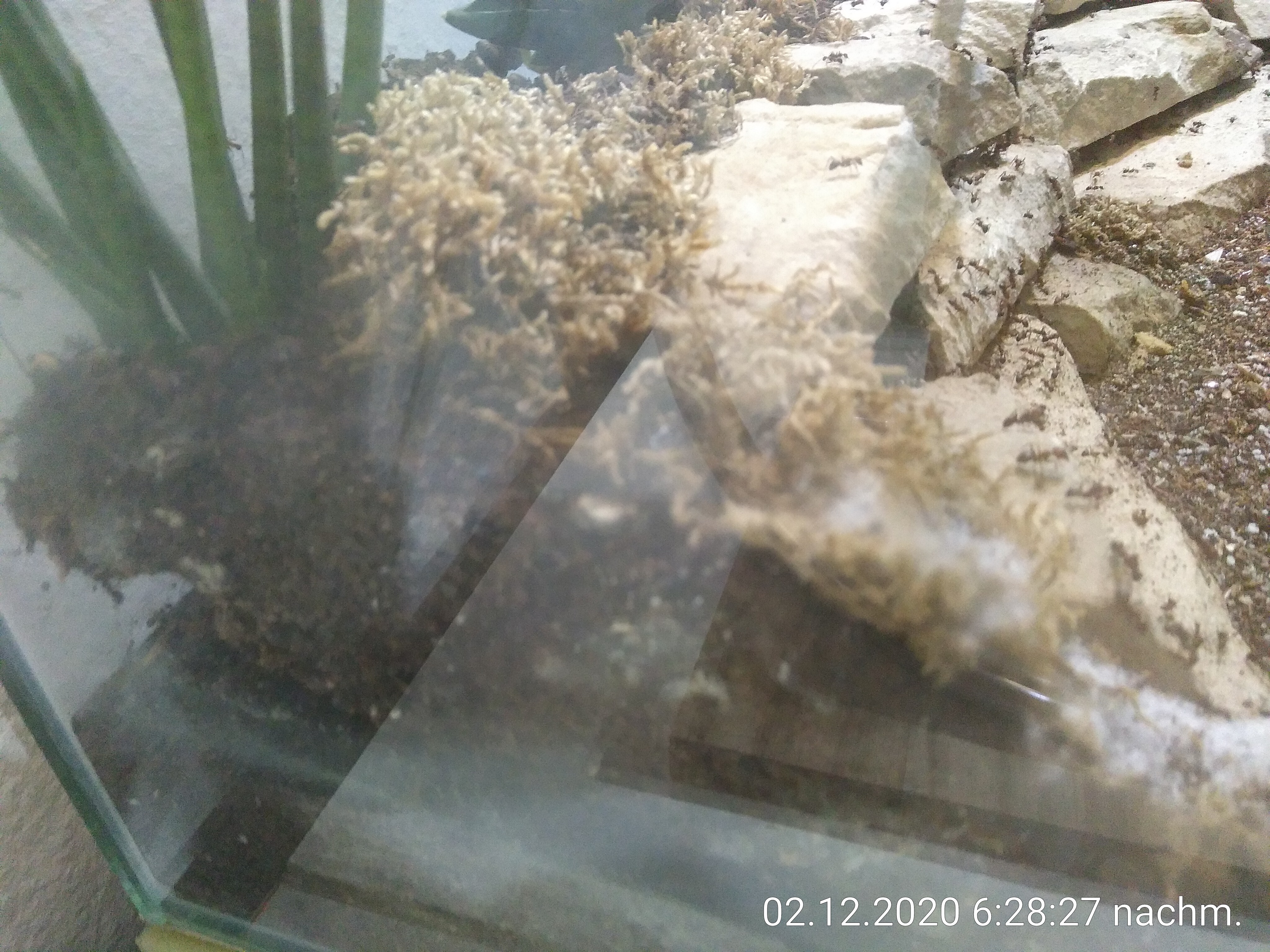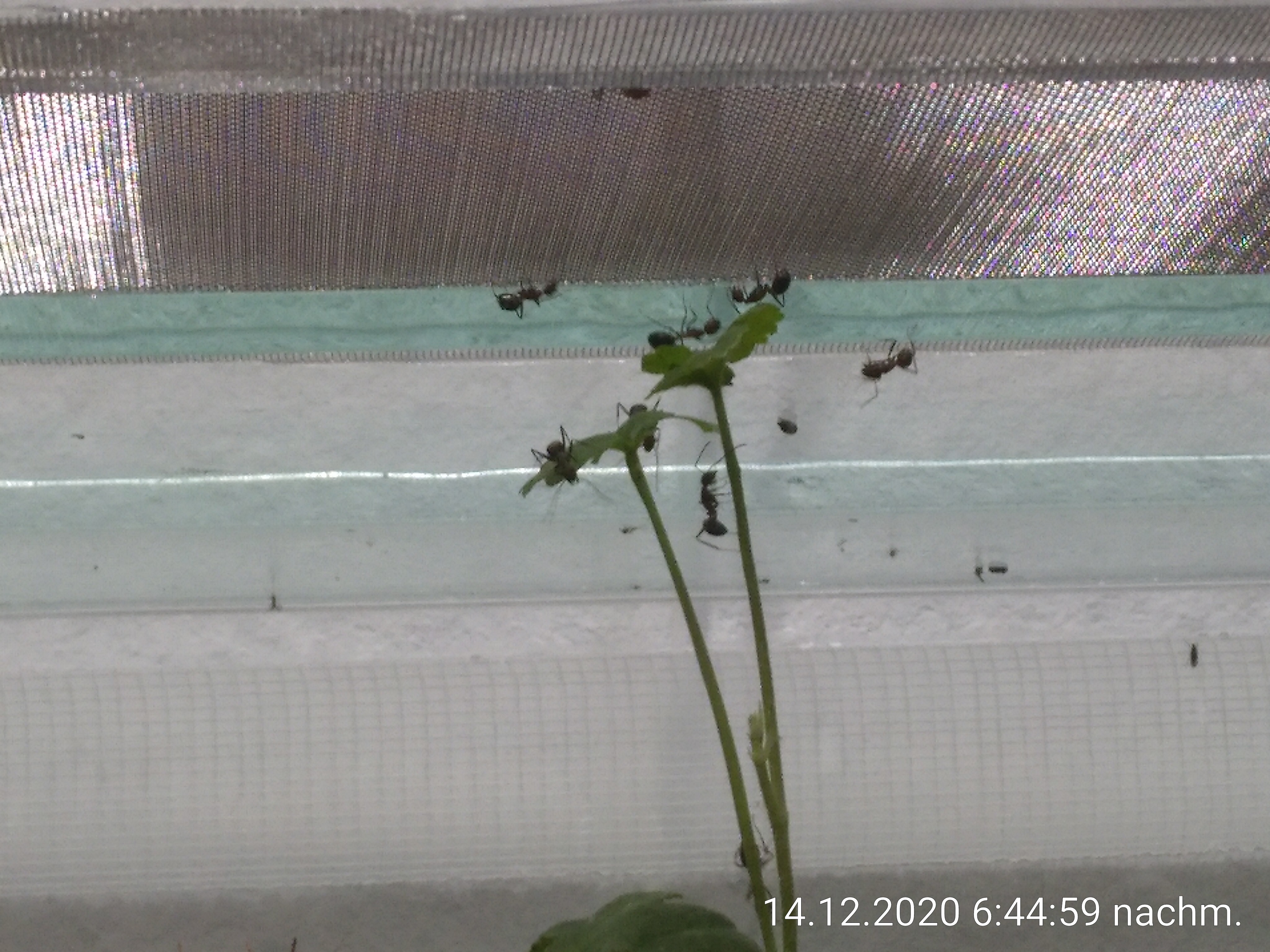 Ansonsten will ich schon lange mal testen, wie sie auf Läuse reagieren. Das müsste im neuen Becken doch endlich mal gehen. Viele Ameisen stehen ja drauf, z.B. auch die auf meinem Balkon. Da habe ich übrigens noch eine „Freilandfarm“ im Blumenkasten. Im Moment ist da aber natürlichWinterruhe angesagt. Nächsten Frühling mache ich mal Fotos. Bestimmt kann mir jemand bei der Bestimmung helfen. Ist auf jeden Fall eine kleine Spezies.