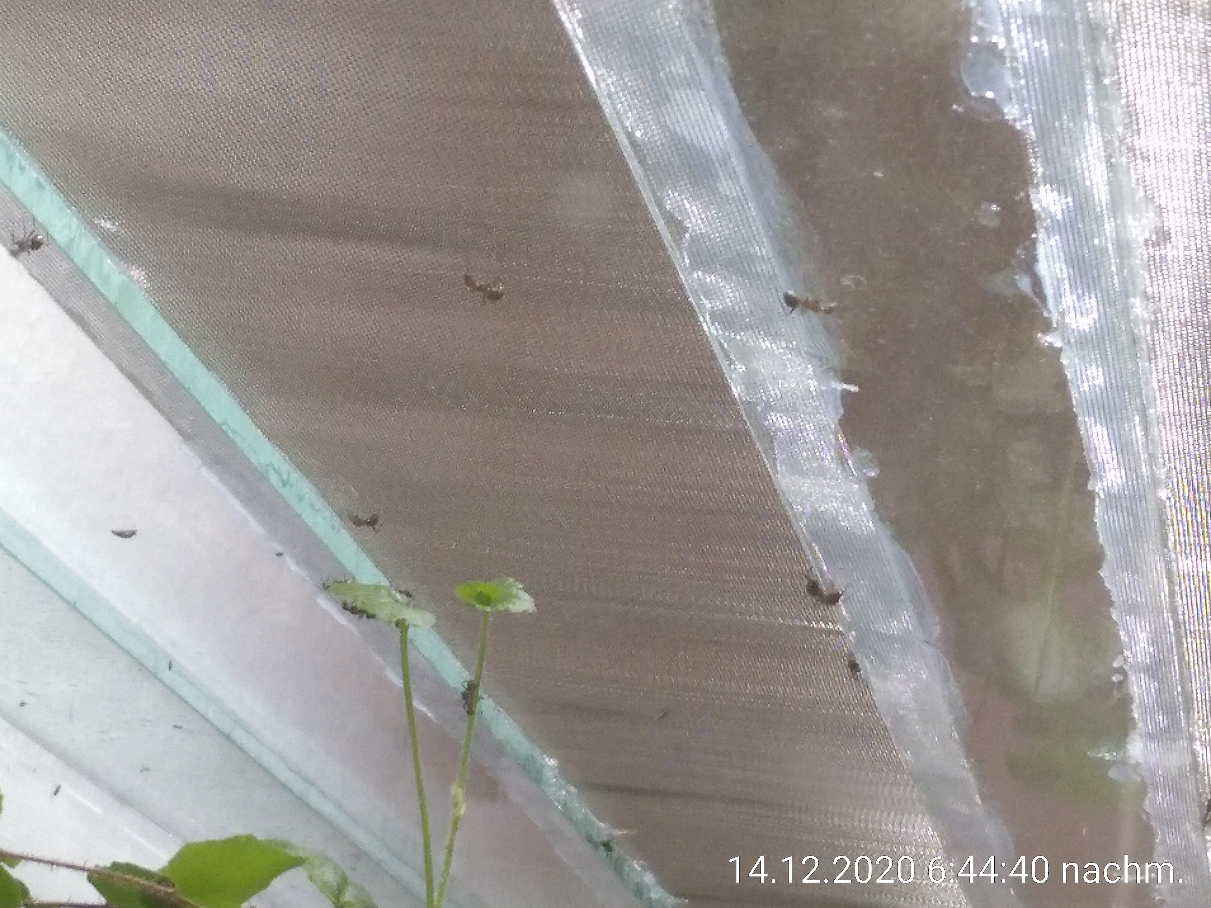 Und damit habe ich auch schon das erste „Problem“. Genau wie beim alten Becken, habe ich auch hier Rahmen und Deckel. Tagsüber ist das Becken immer zu, weil sie immer noch täglich schwärmen (dazu gibt’s auch noch irgendwann einen eigenen Beitrag). Im alten Becken war das stressfrei. Nachmittags den wieder Deckel abnehmen und fertig. Beim neuen Becken habe ich seit dem ersten Tag nach dem Schwärmen, also eigentlich nur wildem Rumkrabbeln, immer mehrere Männchen unter dem Gitter sitzen. Wenn ich den Deckel dann abnehme, besteht die Gefahr, dass sie einfach weg fliegen... Zum Glück tun sie das nicht.