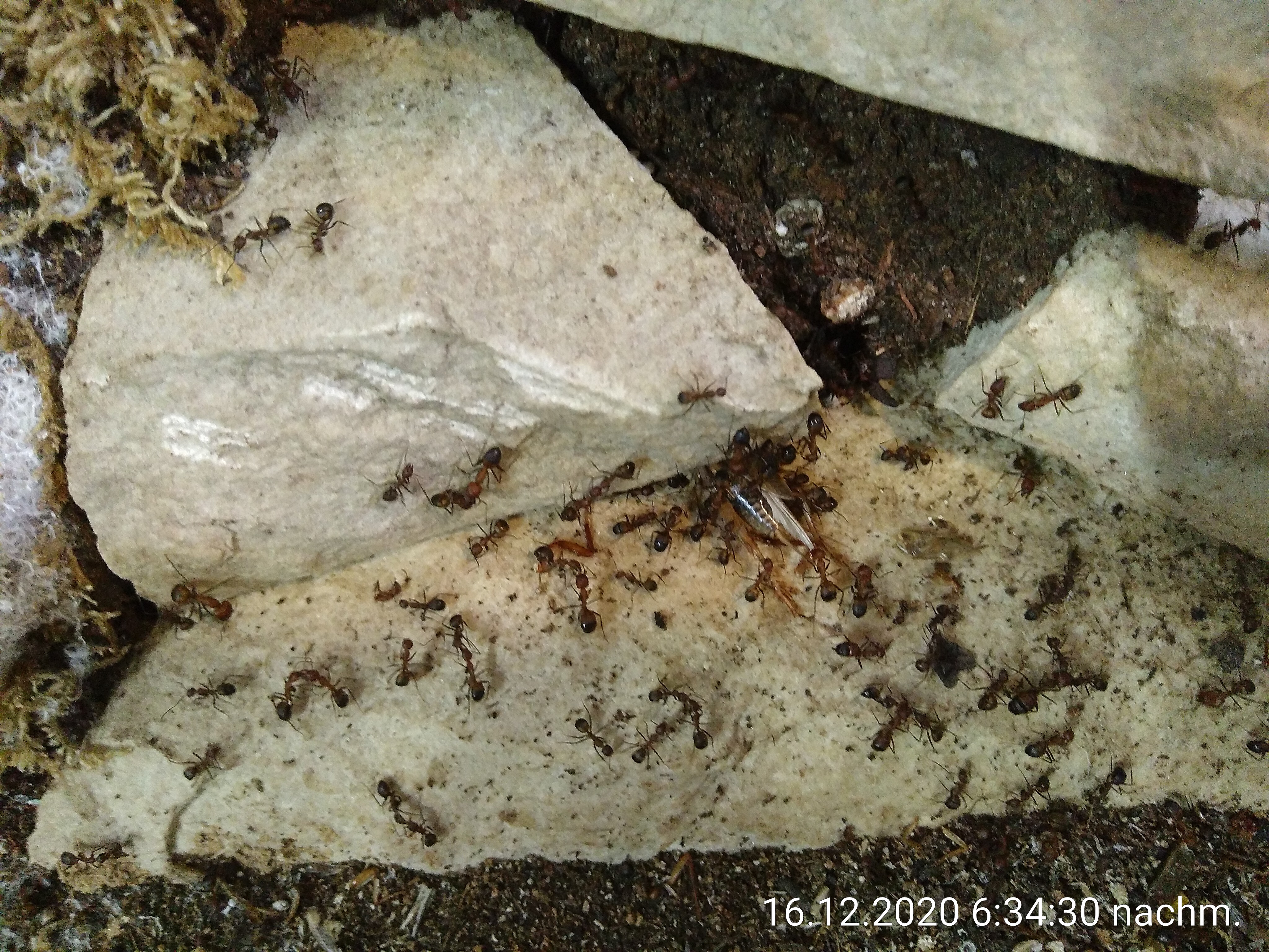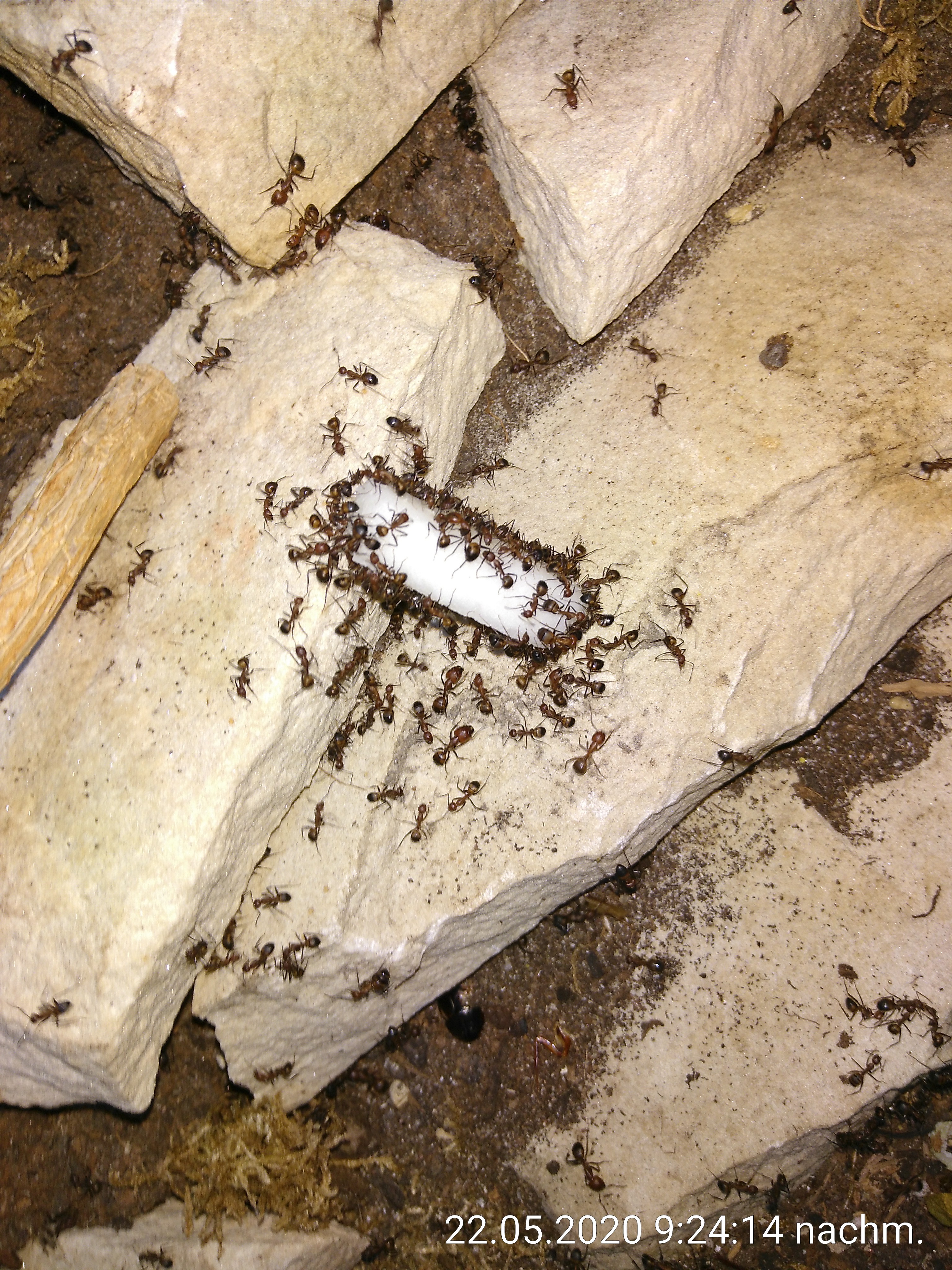 In den ersten Monaten haben sie sich noch bewegende Beute nicht angerührt. Sobald ein Bein von einem Heimchen auch nur gezuckt hat, sind sie panisch davon gerannt. Das hat erst aufgehört als sie mindestens 100 waren, eher später. Heute macht sie das nur noch gieriger. Wenn sich die Beute noch bewegt, gehen sie erst richtig drauf! Ich gebe ihnen aber eigentlich nie lebende Heimchen oder so, das Killen übernehme ich. So geht’s halt schneller für die Heimchen oder was sonst so dran glauben muss. Auch alles andere, was mir so in die Wohnung fliegt, wird gern genommen. Ob Nachtfalter, Wespen oder Mücken. Und natürlich diese ganzen Viecher, die ich nicht mit Namen kenne. Die einzige Ausnahme bisher waren Raupen, die mochten sie nicht. Vielleicht waren sie auch giftig und die Ameisen klüger als ich. Wer weiß? Rind und Schwein sowie Garnelen mögen sie auch. Fisch habe ich noch nie probiert, fällt mir jetzt erst auf. Das werde ich bald testen. Dann gibt’s noch Eier. Darauf reagieren sie sehr unterschiedlich. Manchmal stürzen sie sich auf das Eigelb, manchmal auf das Eiweiß. Aber in 60 bis 70 % der Fälle ignorieren sie es fast komplett. Komisch...