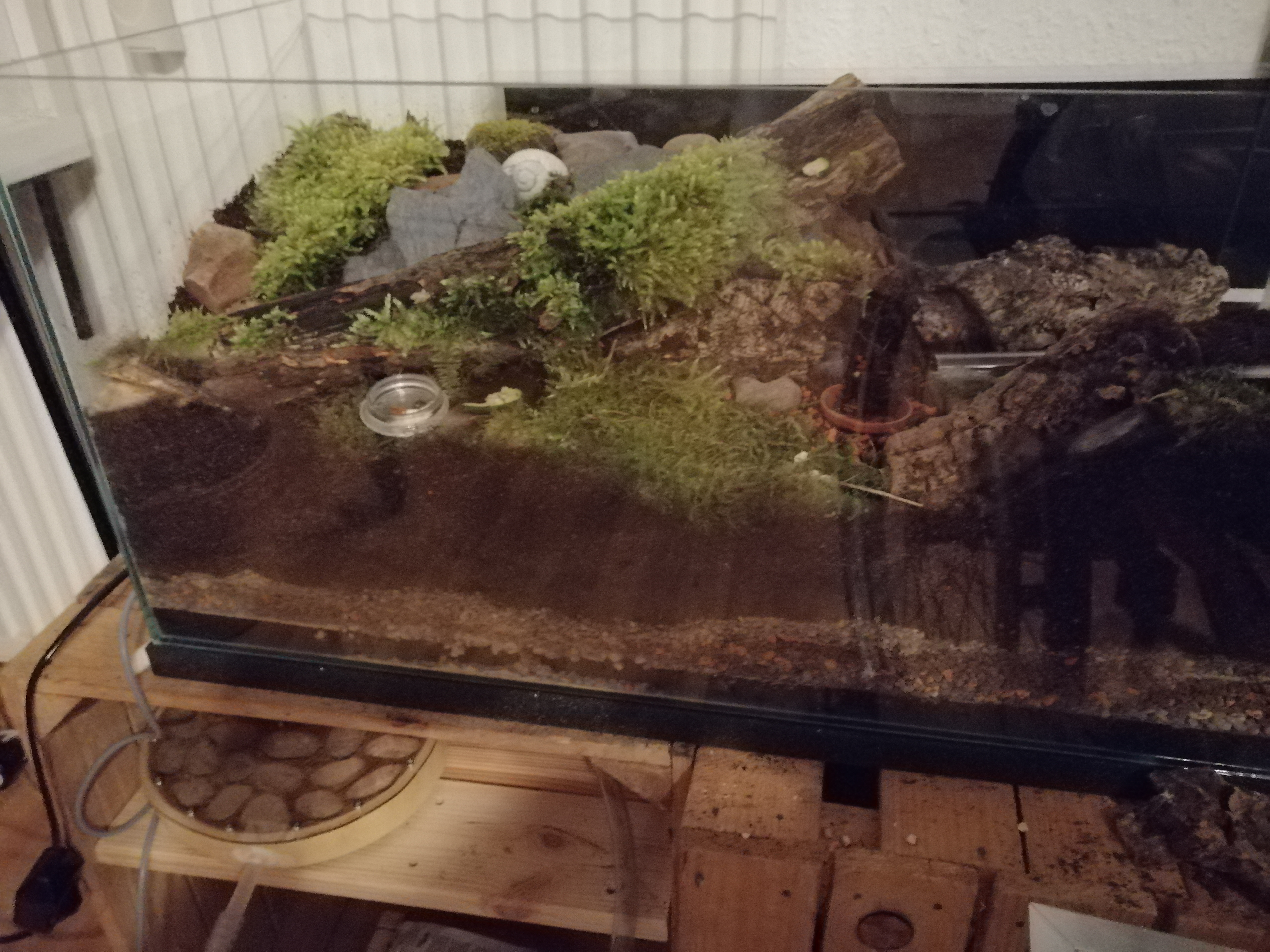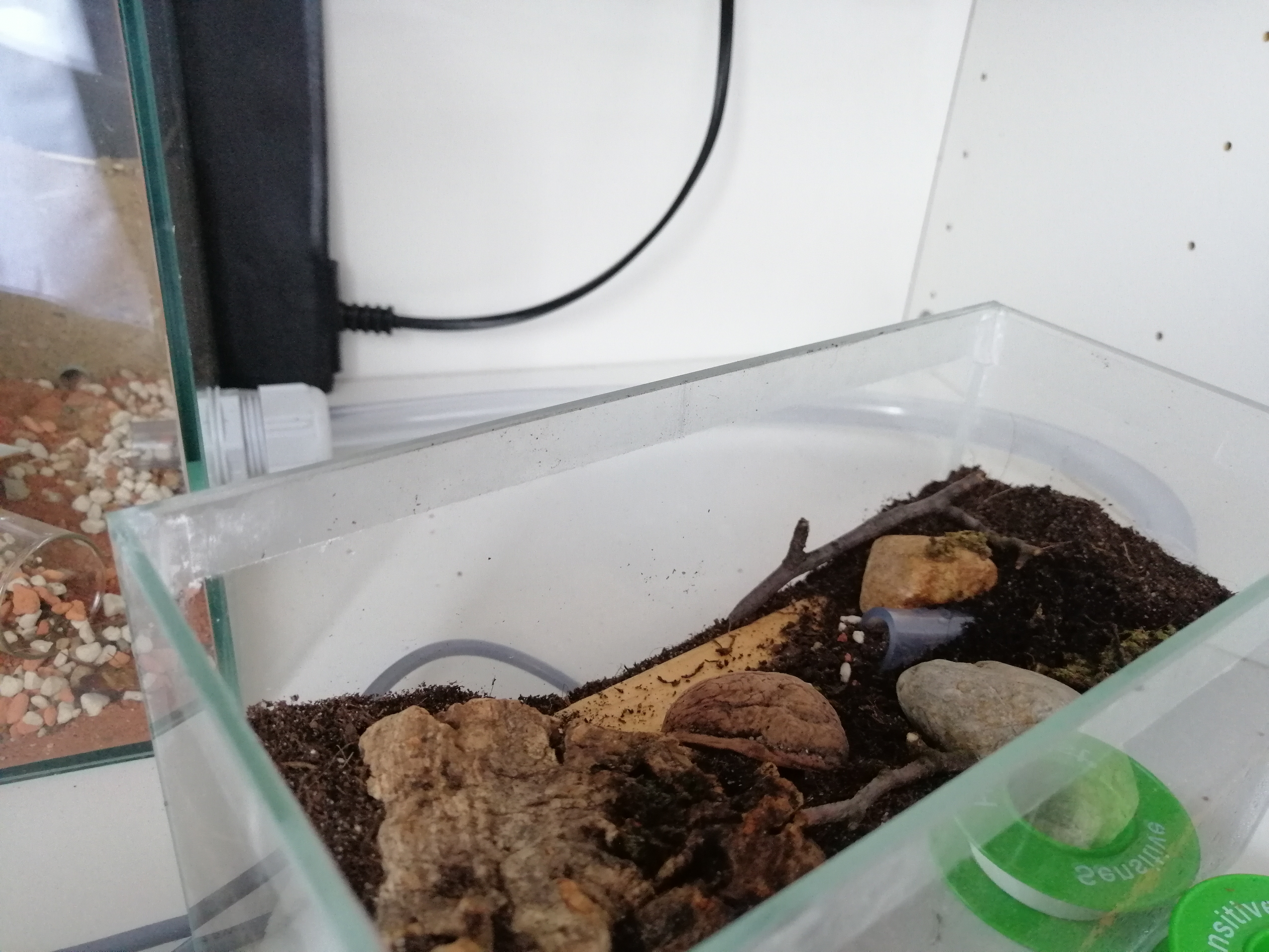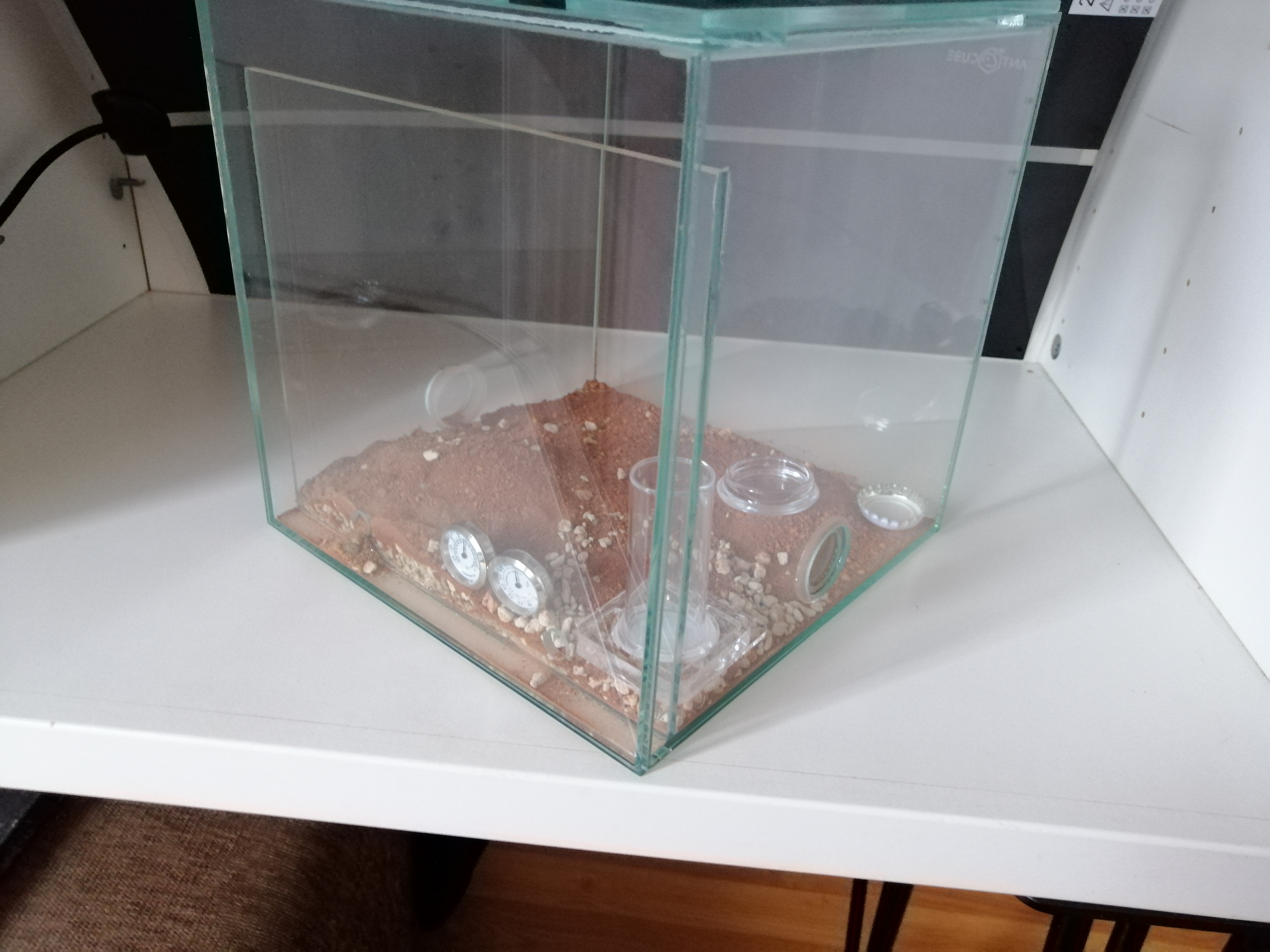 Die Hälfte der Futterarena wird von unten mit einem Heizkabel erwärmt. Die Arena habe ich mit Deckel bei myantz bestellt. Der Deckel ist leider schlecht verarbeitet. Die Gaze lösen sich schon leicht von der Halterung. Trotz dessen ist der Deckel fast immer auf der Arena und sorgt so für eine hohe Luftfeuchtigkeit.