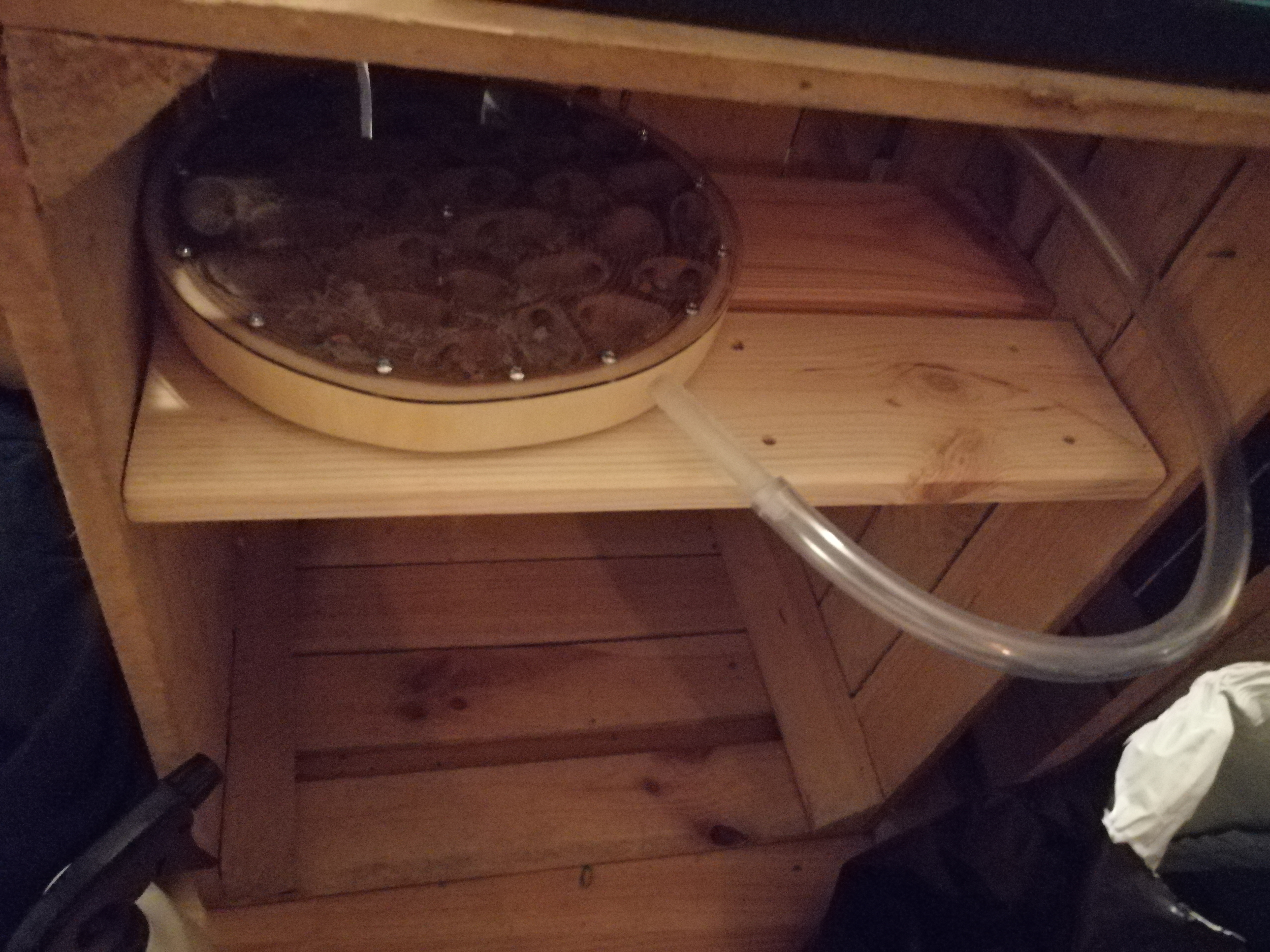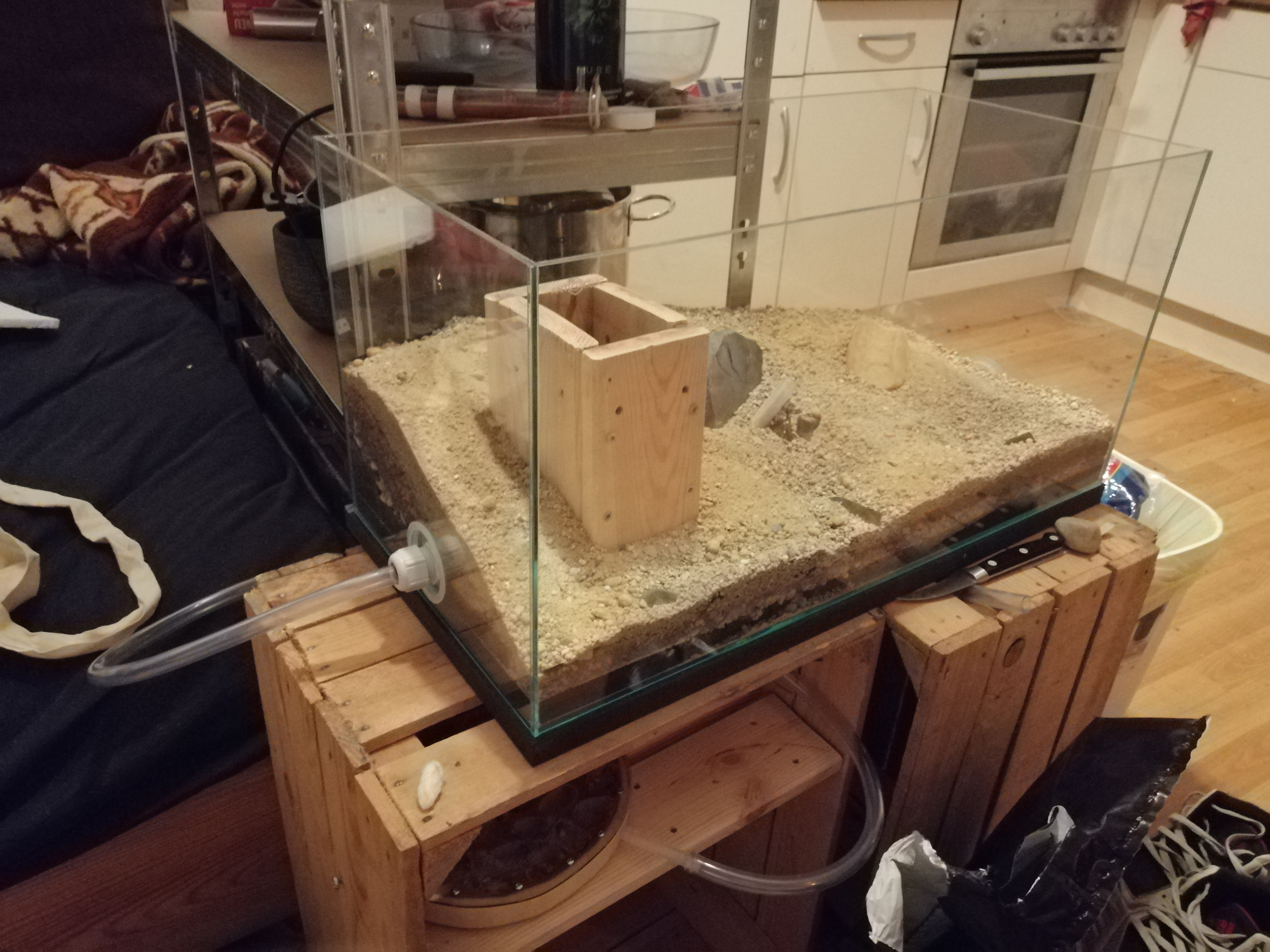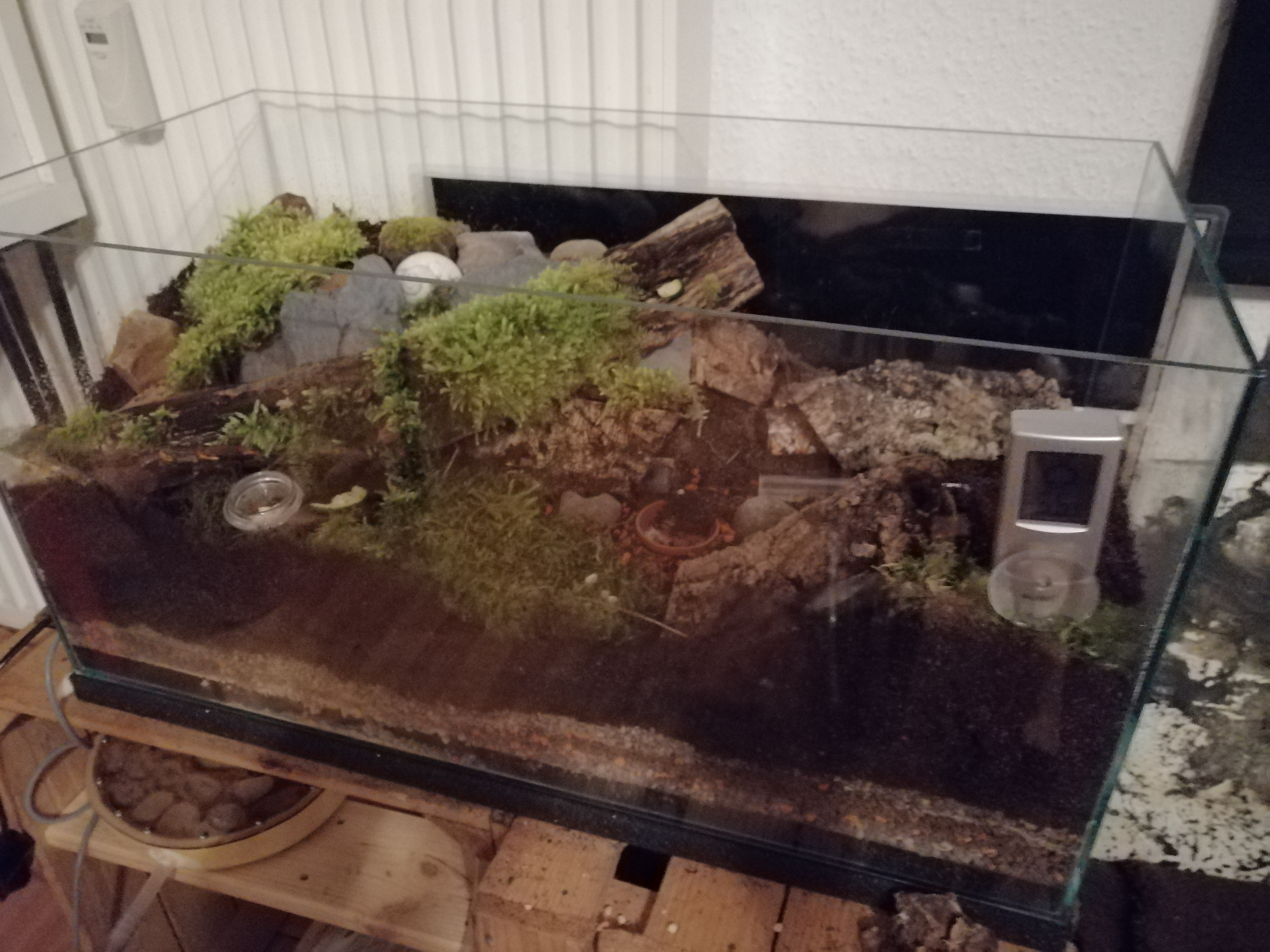 Die Hälfte der Futterarena wird von unten mit einem Heizkabel erwärmt. Die Arena habe ich mit Deckel bei myantz bestellt. Der Deckel ist leider schlecht verarbeitet. Die Gaze lösen sich schon leicht von der Halterung. Trotz dessen ist der Deckel fast immer auf der Arena und sorgt so für eine hohe Luftfeuchtigkeit.