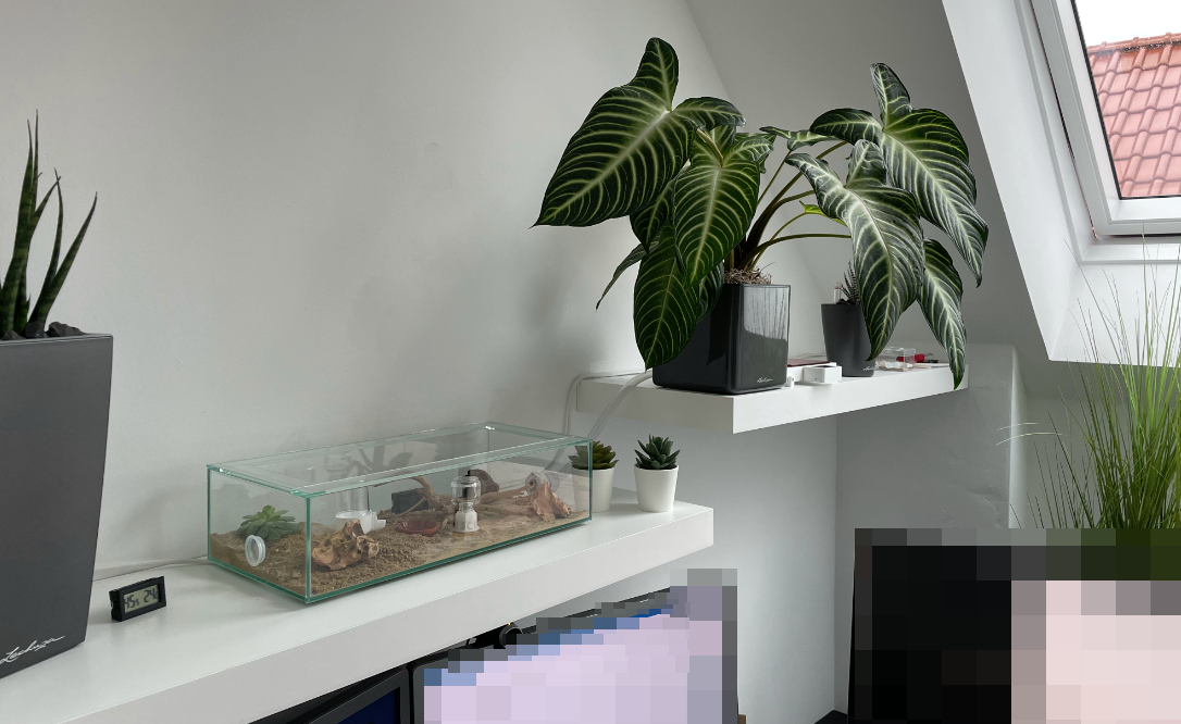 Ich habe nun versucht die Anlage mit meinen verfügbaren Mitteln für die fellah zu optimieren d.h. ich habe das untere Wandboard nun für die Arena anstatt das obere und das obere ist nun für das Nest zuständig. Das ganze versuche ich mit Pflanzen "aufzuhübschen". Ich habe somit die Möglichkeit bei der Arena mehr in die Höhe zu wachsen d.h. bei einem zweiten Becken oder falls ich die vorhandene Arena ersetzen muss kann diese auf dem unteren Wandboard höher ausgelegt werden da hier keine Schräge vorhanden ist. Die Höhe benötige ich für große Tränken etc. falls der Deckel bleiben wird. Ich verspreche mir somit auch eine bessere Sicht in die Arena und das Nest kann natürlich trotzdem eingesehen werden aber mit etwas Umstand d.h. ich muss auf die Zehenspitzen um von oben drauf schauen zu können.
