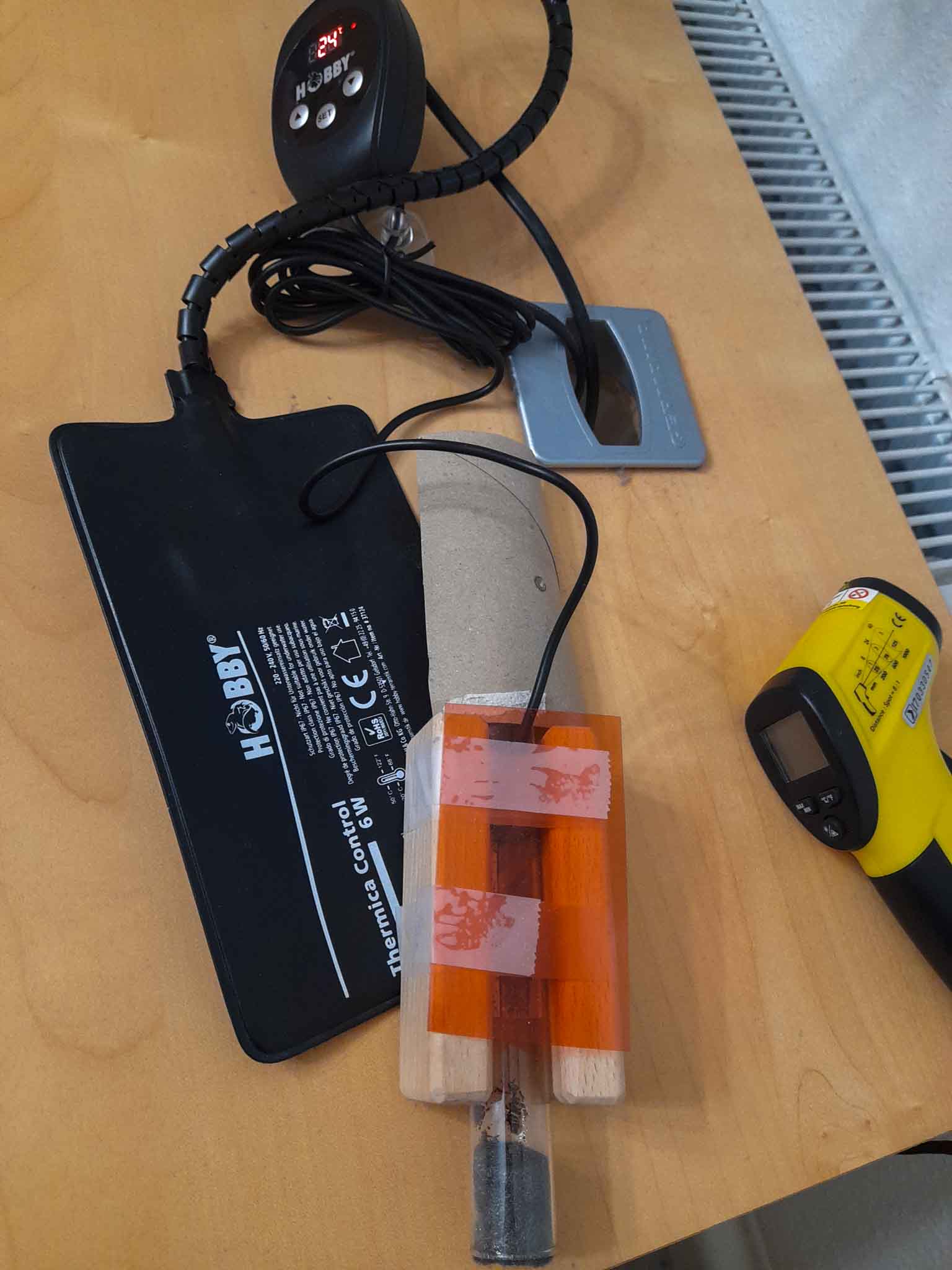 Im (neuen) Nest hat es circa 22 Grad. Das erscheint mir etwas zu wenig und lege eine Heizmatte unter. Die Temperatur danach liegt bei circa 26 Grad. Die