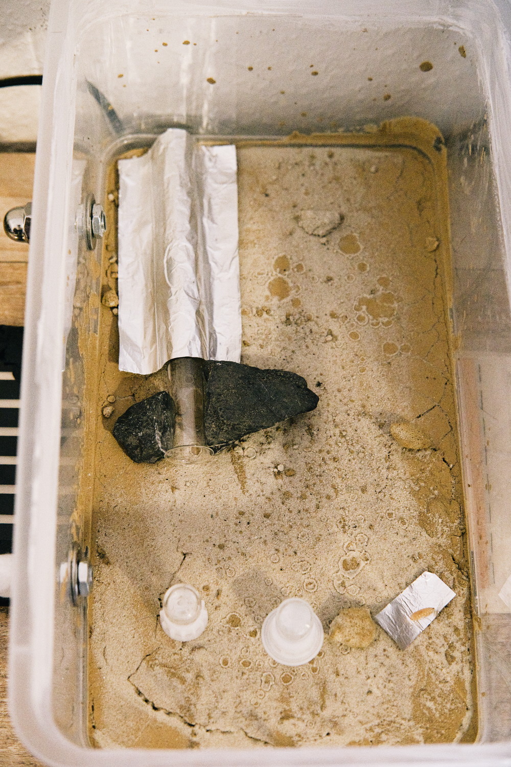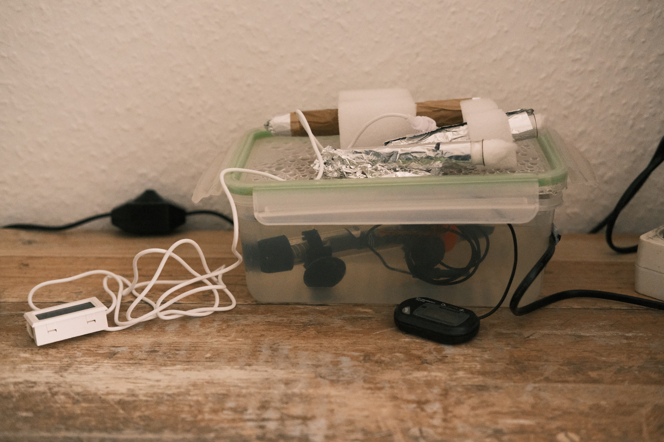 Auf den Fotos ist das Setup zu erkennen. In der Schale befindet sich ein Heizstab mit Temperaturfühler, welcher so eingestellt ist, dass die Luft über der Box passend erwärmt wird.