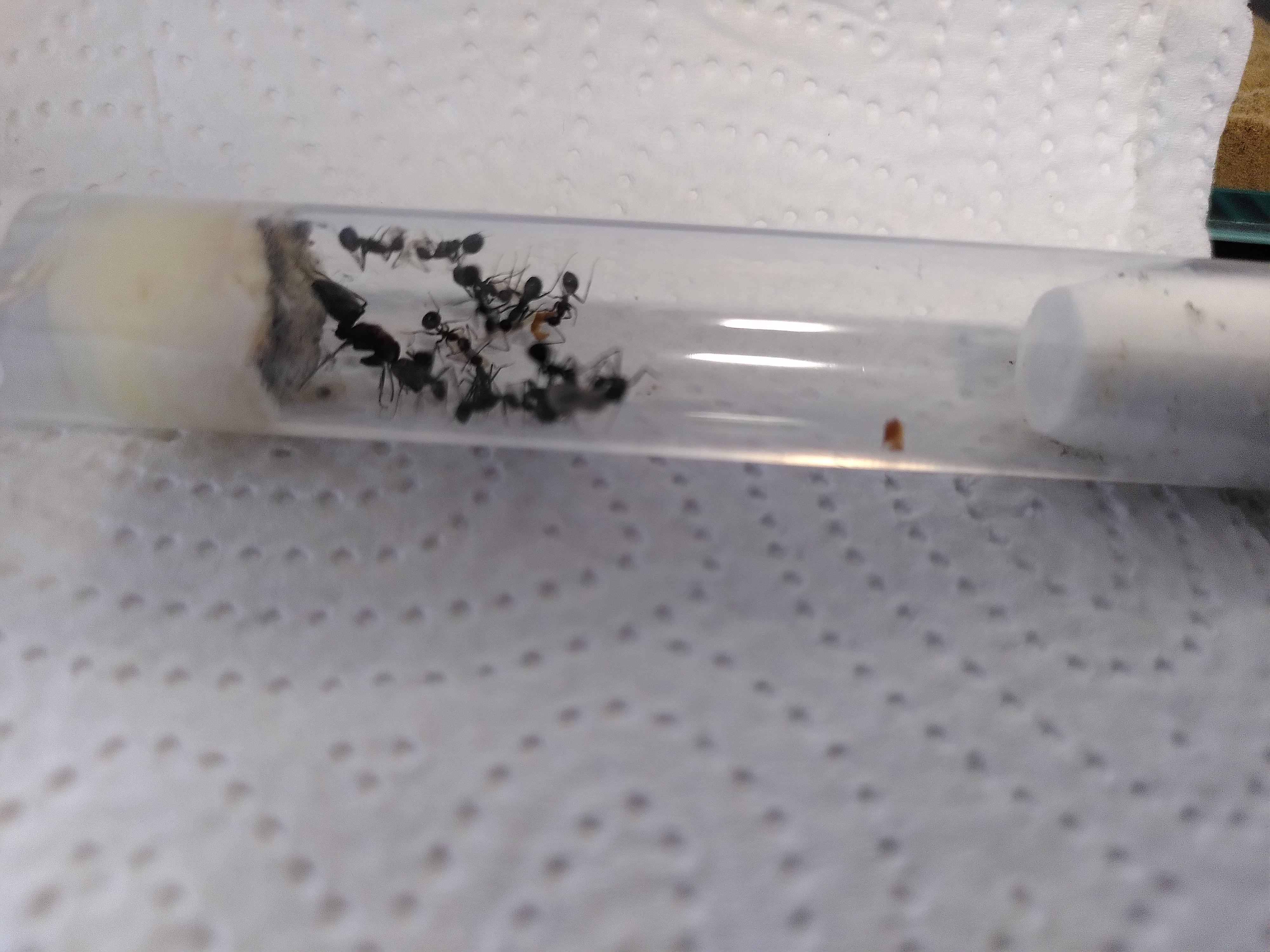 Nachmittags dann nochmal geguckt und gesehen das die Aversion vom Boden und vom Eingang zum Nest sich gelegt hatte. Kurz darauf entdeckte ich auch eine besonders mutige die den ganzen Schlauch hochgeklettert und ins Nest gelaufen ist. Auch darüber hab ich mich natürlich sehr gefreut auch wenn ich wie gesagt keinen Umzug erzwingen will und die ruhig noch ein paar Wochen im Reagenzglas verweilen können.