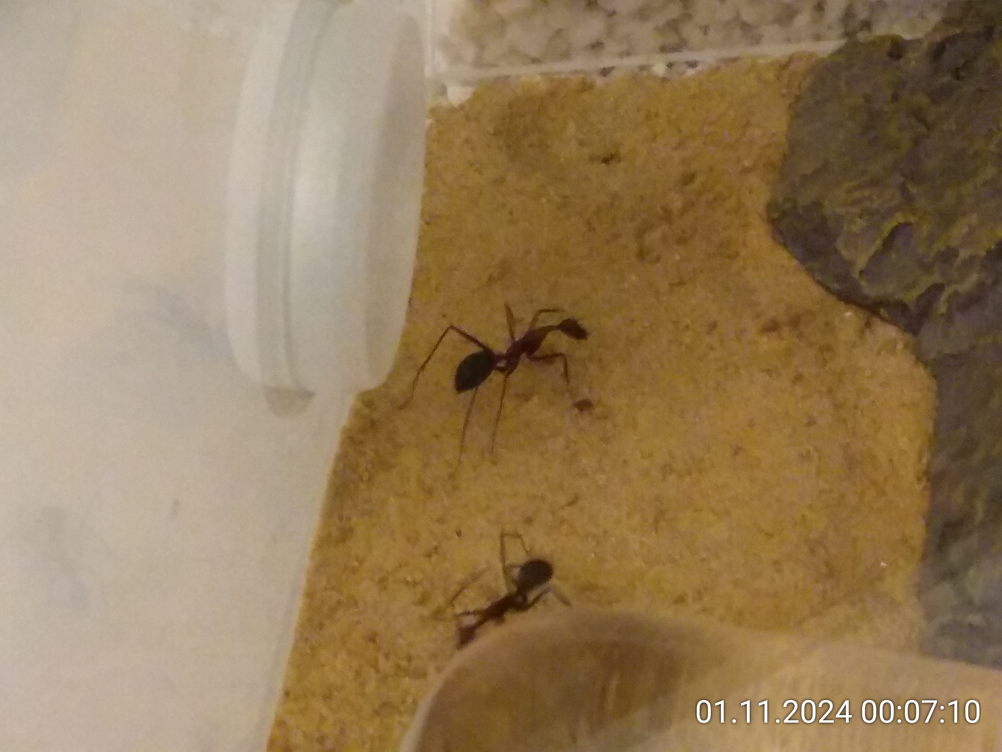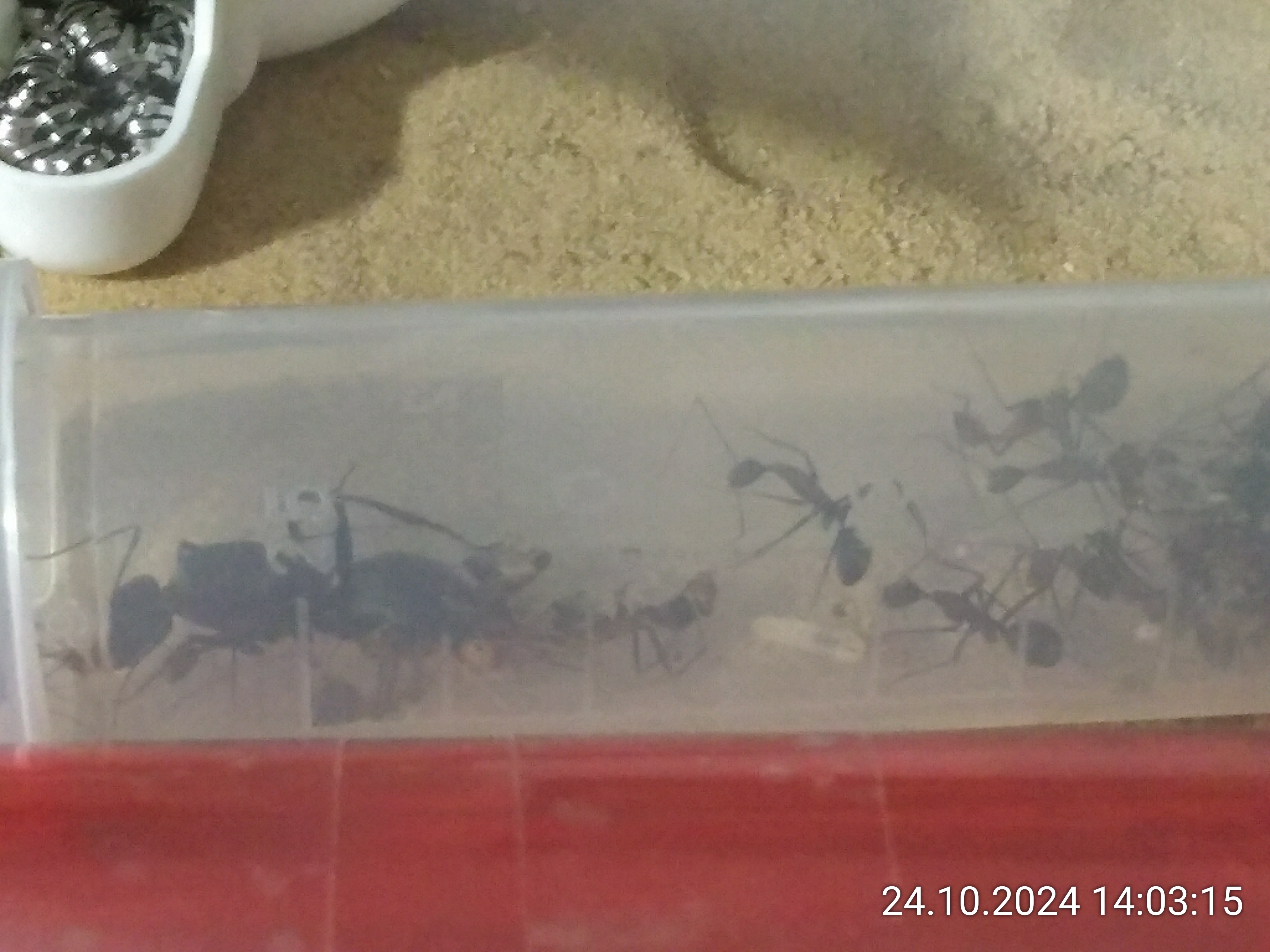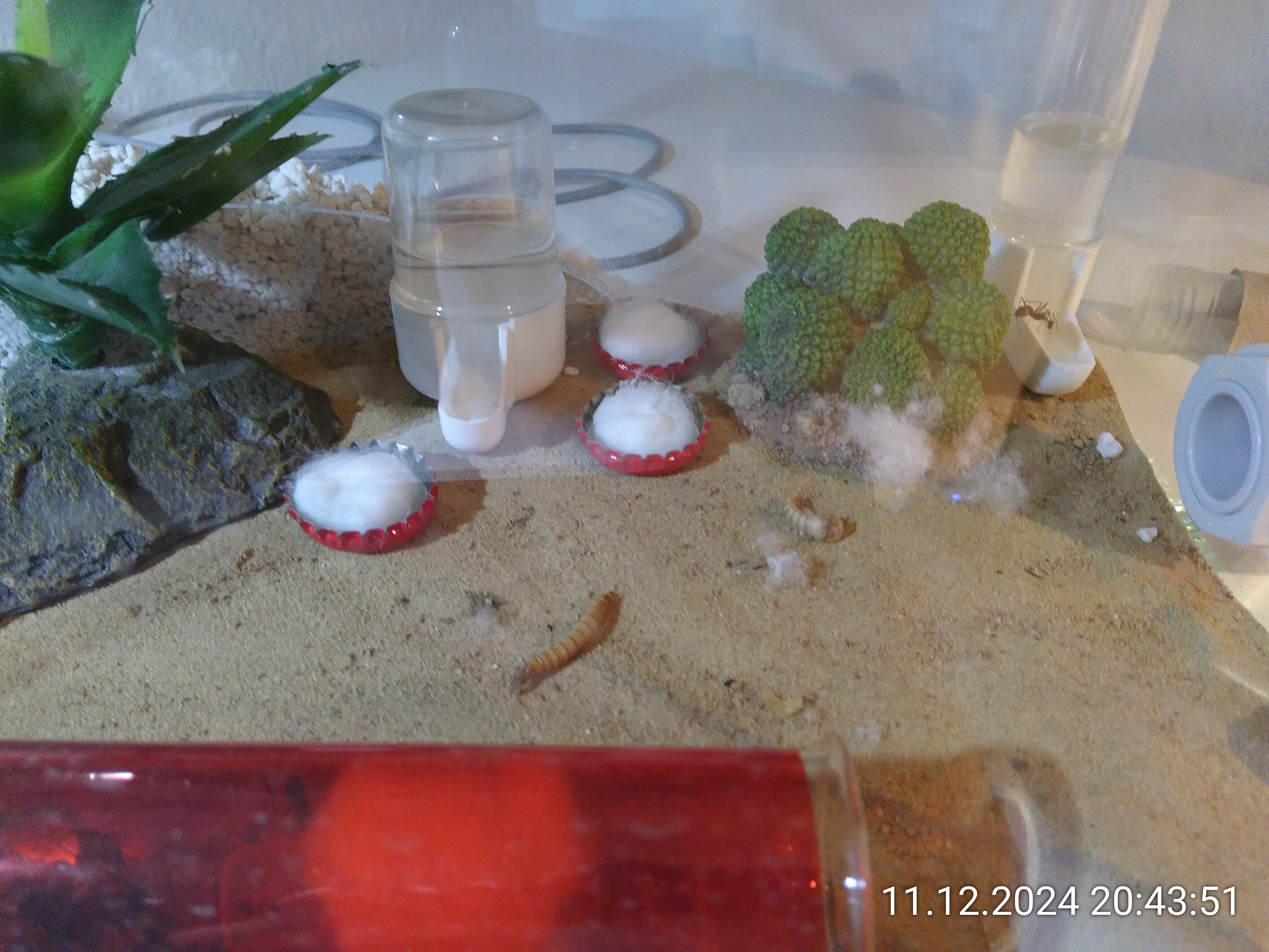 Eigentlich wollte ich ihr RG erstmal nur in ihre kleine neue Arena legen und abwarten, aber weil sie schön warm war, habe ich es auch direkt geöffnet. Und dann war Hoffen angesagt. Aber es hat nicht lange gedauert und es kam Bewegung in die kleine Kolonie. Nach wenigen Minuten waren alle aktiv. Bis auf eine, die es nicht geschafft hat.