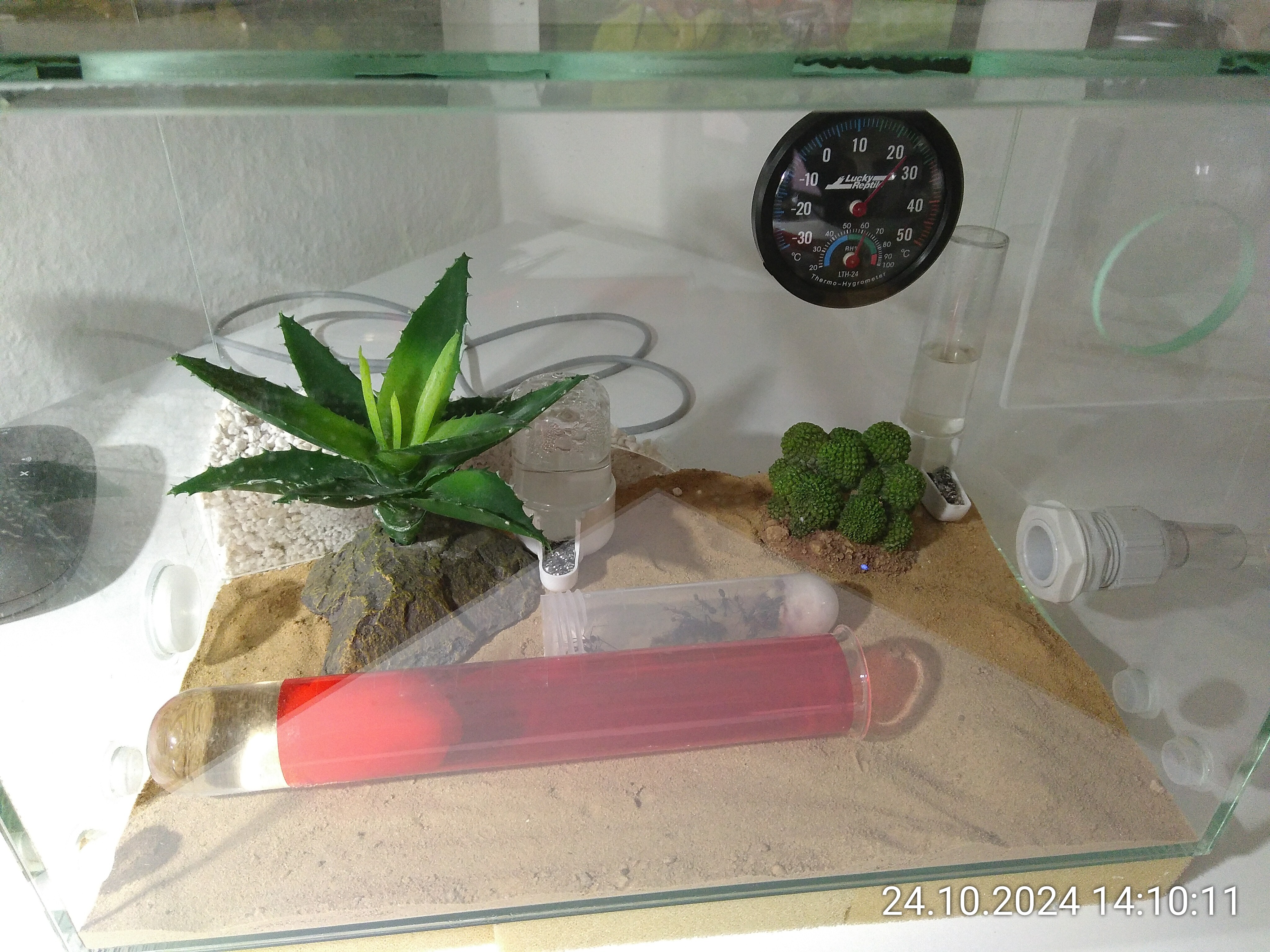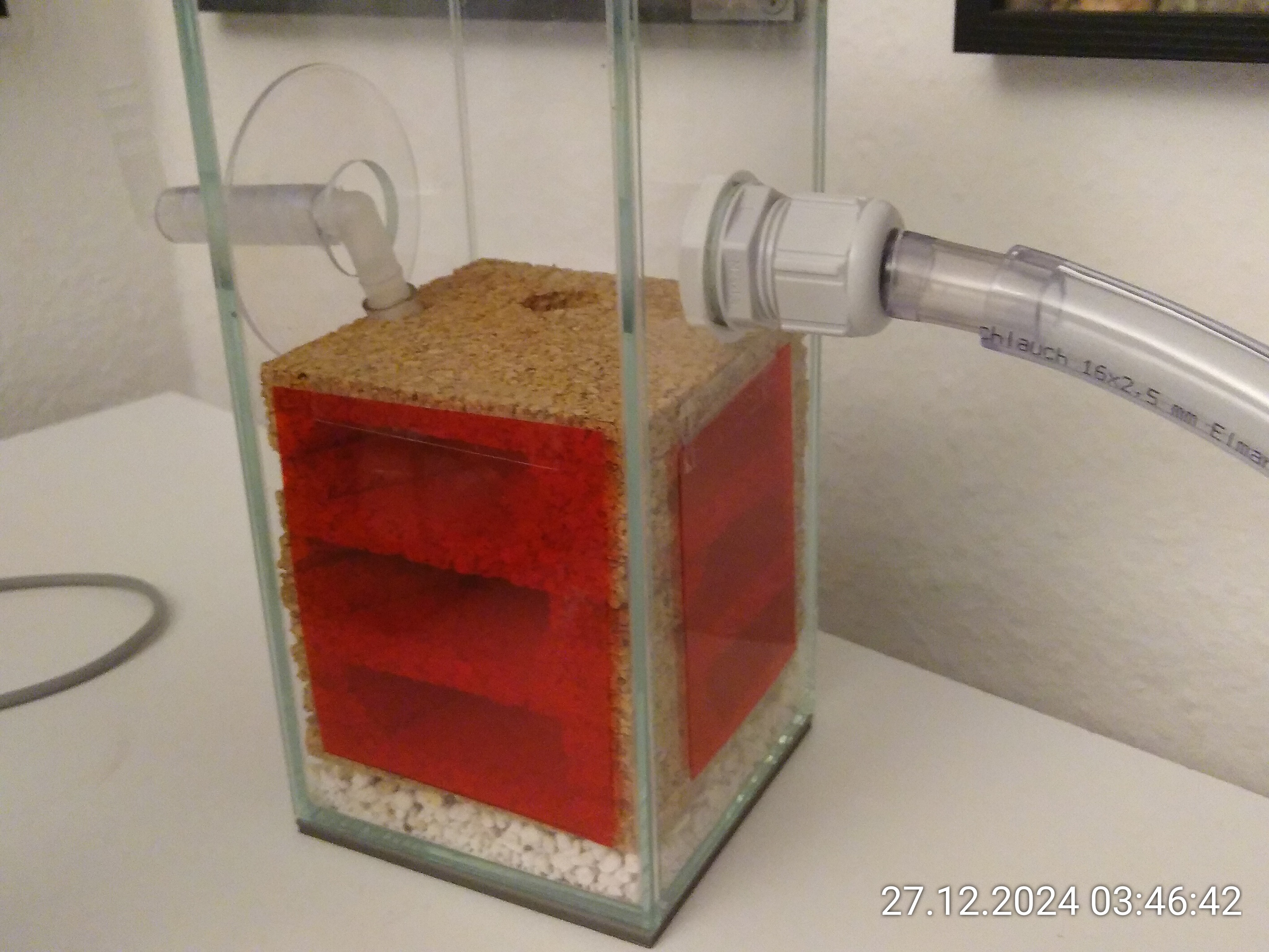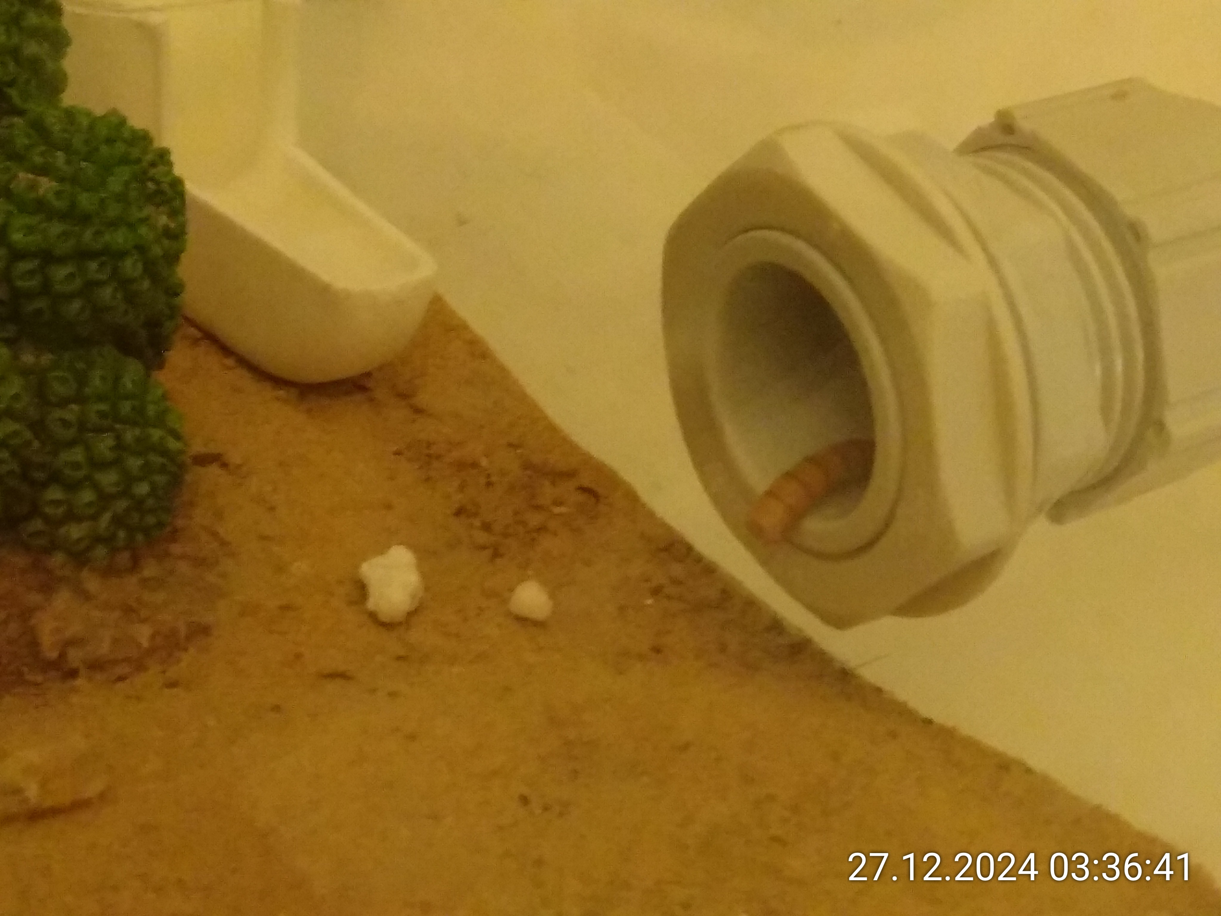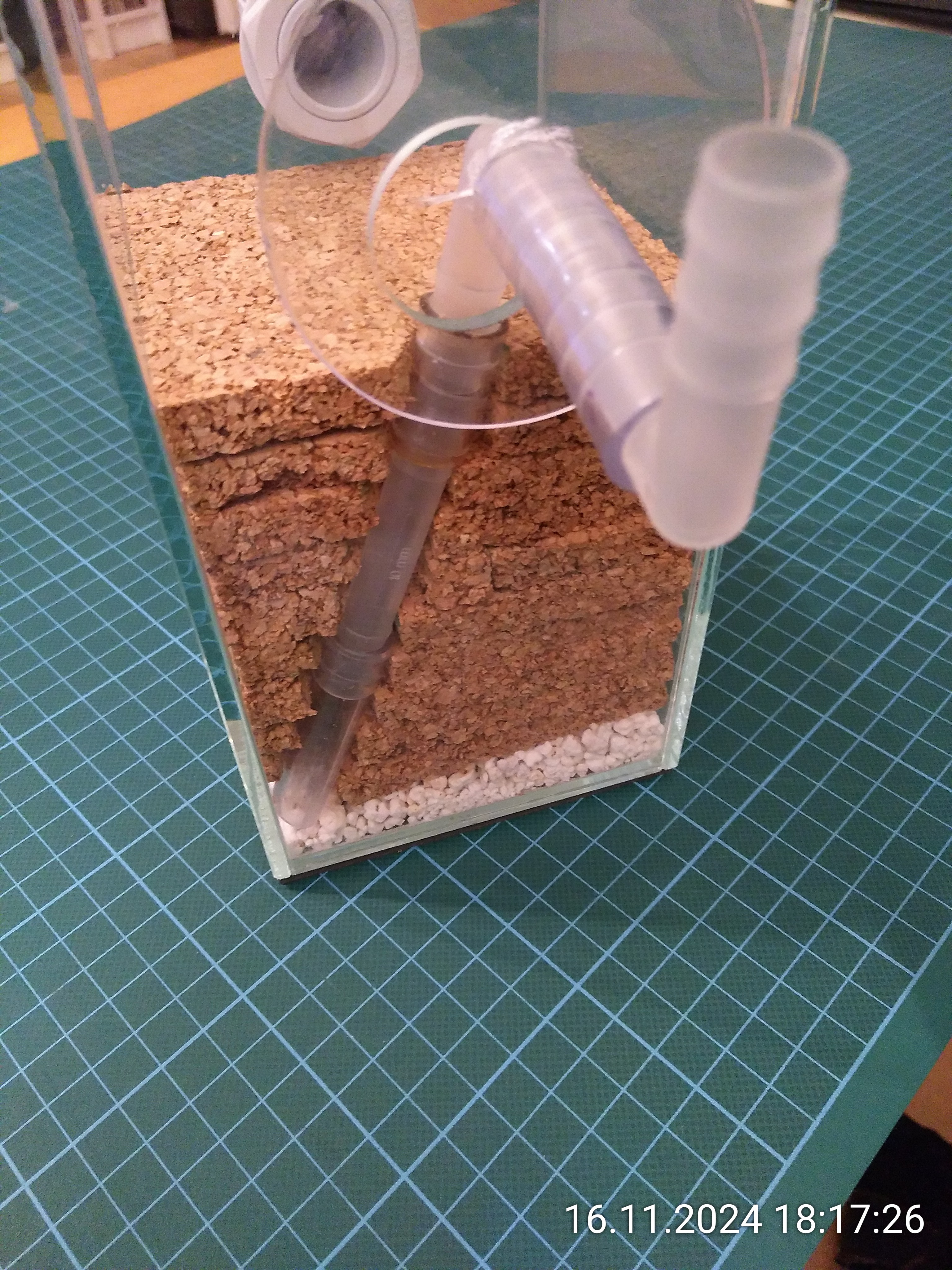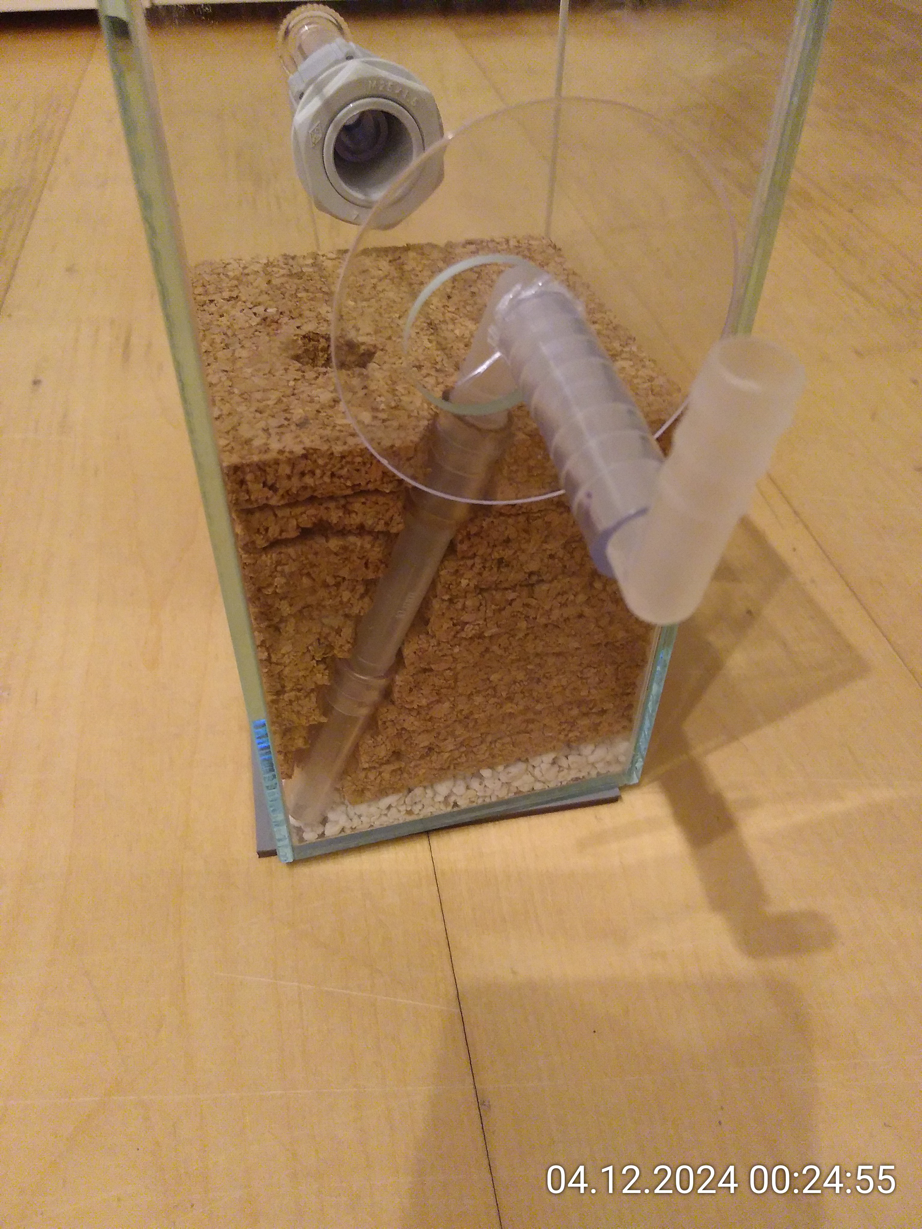 Ihre neue kleine Welt, von unten leicht beheizt auf ca. 25 °C. Die weißen Steinchen sind Perlite (oder so ähnlich) und dienen mir als Wasserspeicher, ihnen evtl. als Baumaterial. Dadurch liegt die LF in der Arena bei 65 - 70 %. In das Riesen-RG habe ich vorne noch einen Wattestopfen um ein kurzes Stück Plastikschlauch gelegt und den Eingang so verkleinert. Der Durchgang sollte auch für die