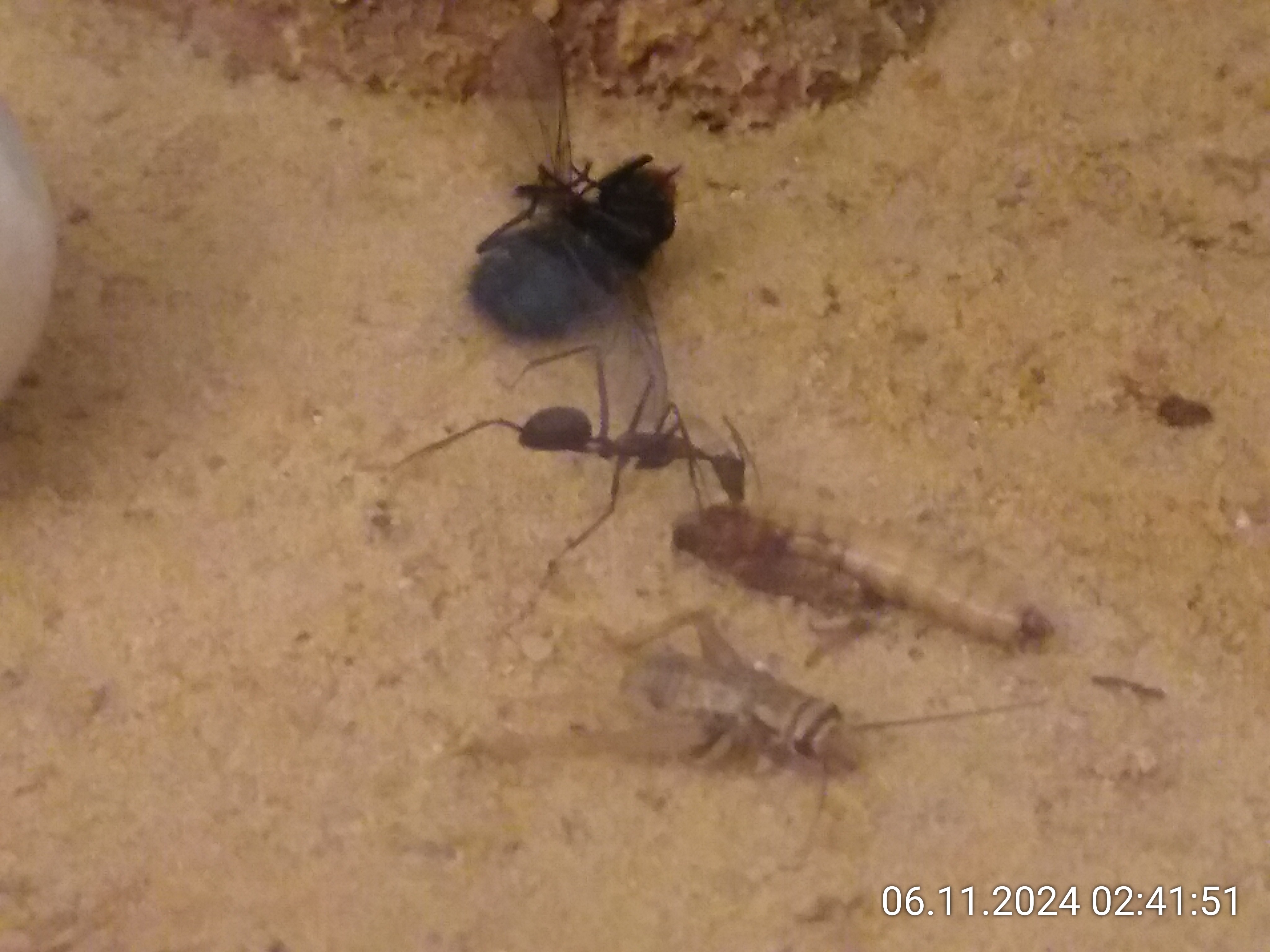 Ihre Zuckerquellen sind vielfältig bis ich weiß, was sie wollen. Bisher haben sie Agavendicksaft bekommen. Den bekommen sie auch bei mir. Außerdem aber immer Invertzucker und auch schon Honig, Ahornsirup, Apfelsüße und Zuckerwasser im Kronkorken. Ein paar unterschiedliche TK-Insekten haben sie auch schon bekommen. Und ab morgen gibts bei Pinco dann auch wieder frische Heimchen (ich habe schon seit Januar keine lebenden mehr gekauft). Ich habe sie an Schokoschaben Interesse zeigen sehen, aber vor allem hat sie ein kleines Stück Schweinefleisch angezogen. Da war eine morgens mehrere Minuten dran.