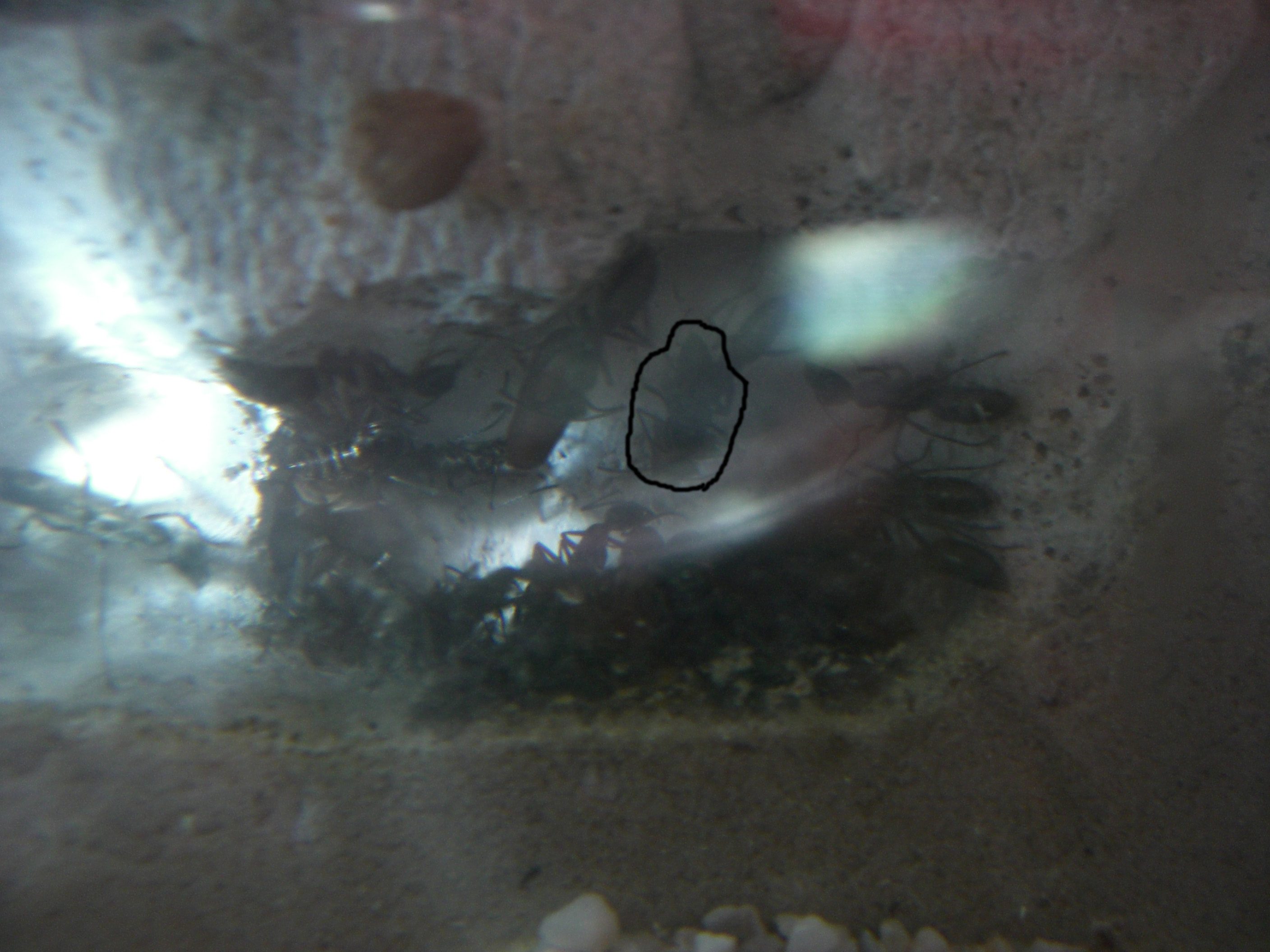 Die Ameisen entdeckten sehr schnell das Y-tong nest und haben auch schnell bezogen, jedoch gab es lange zeit noch eine kleine Randgruppe die das alte Reagensglasnest bevorzugten.:-) Es dauerte eine Woche bis auch der Rest in den Ytong zog. nun war es mir möglich erstmals eine Bestandsaufnahem durchzuführen. es sind so um die 85 Arbeiterinnen und mindestens eine