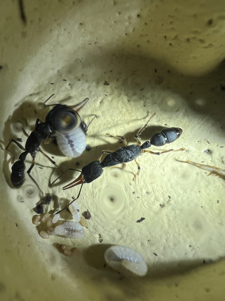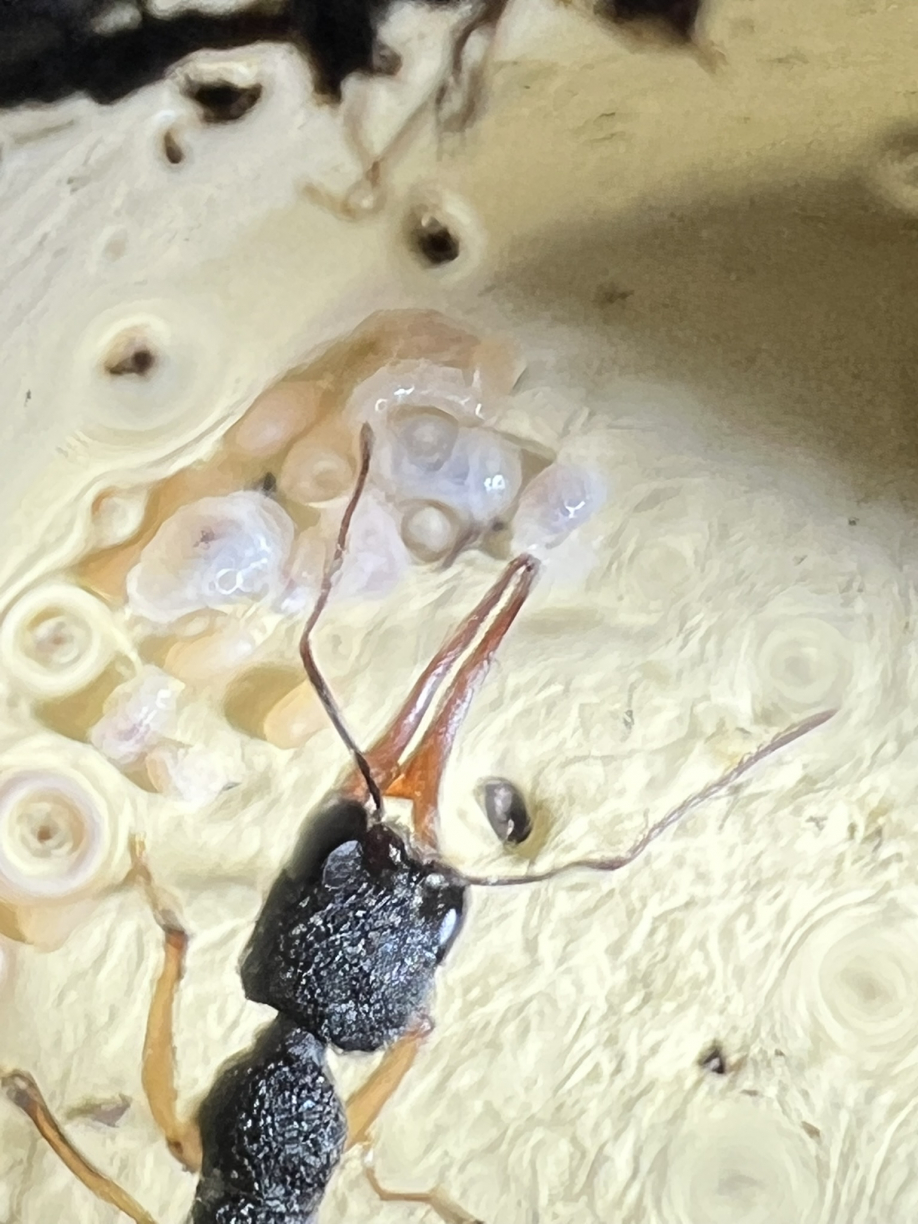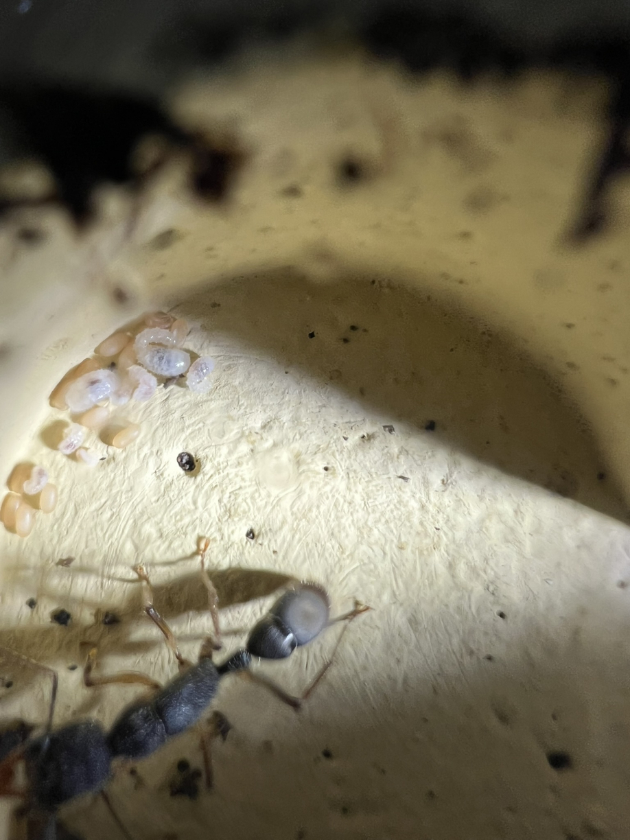 Bei der heutigen Versorgungsrunde habe ich auch mal wieder die rote Abdeckung ĂŒber dem Nest entfernt. Hierbei konnte ich die Chance nutzen und mal genauer nach der Brut und der Kolonie zu schauen. Es ist mittlerweile eine ganz gute Anzahl an Eiern und bereits kleine Larven zu sehen. Jedoch zĂ€hlen ist noch immer schwer, da auch meistens Arbeiterinnen darĂŒber oder in unmittelbarer NĂ€he sind.