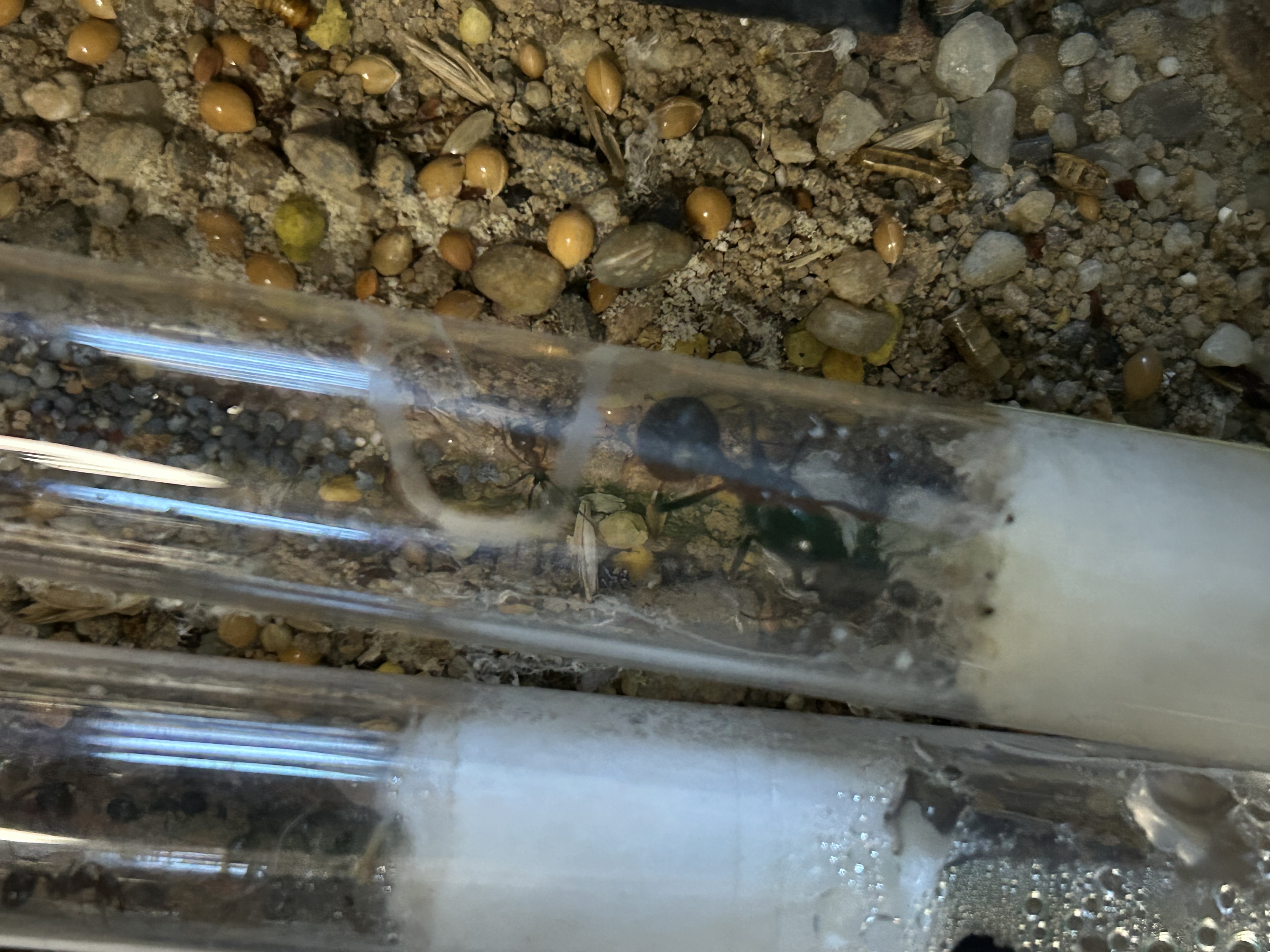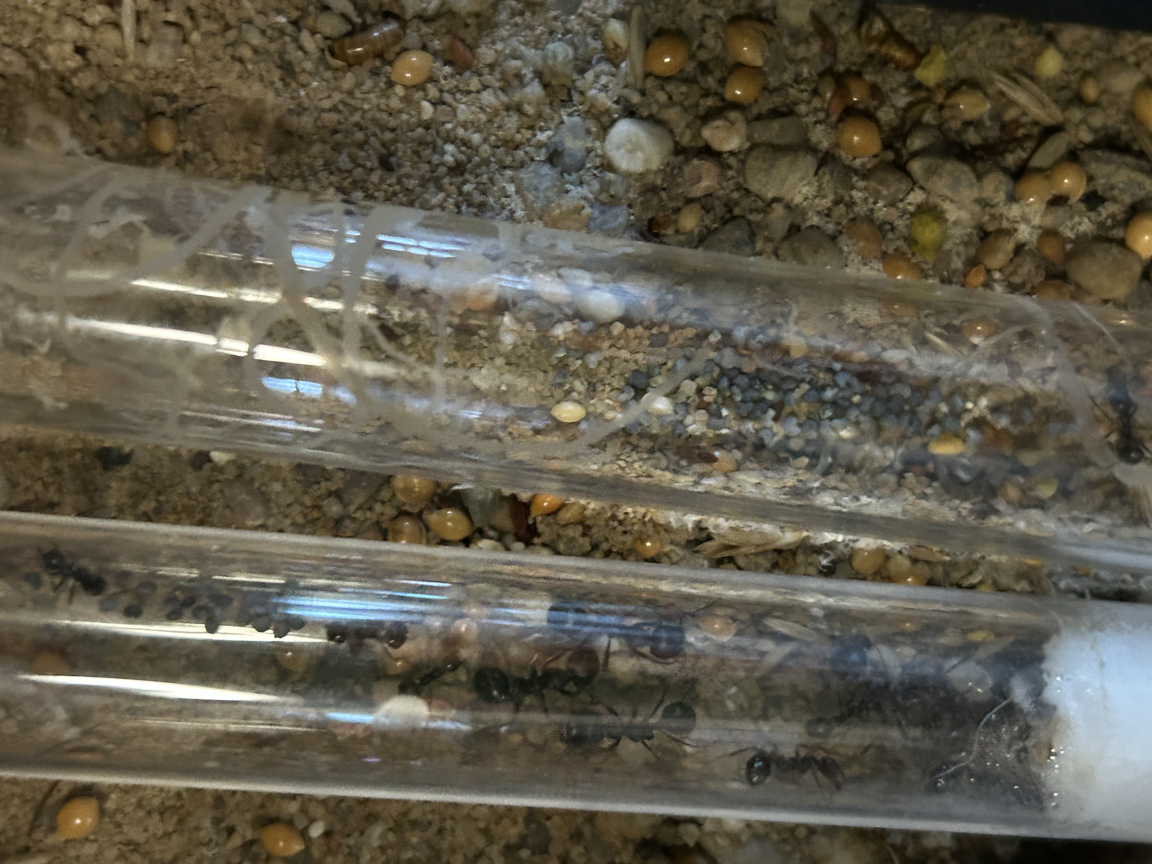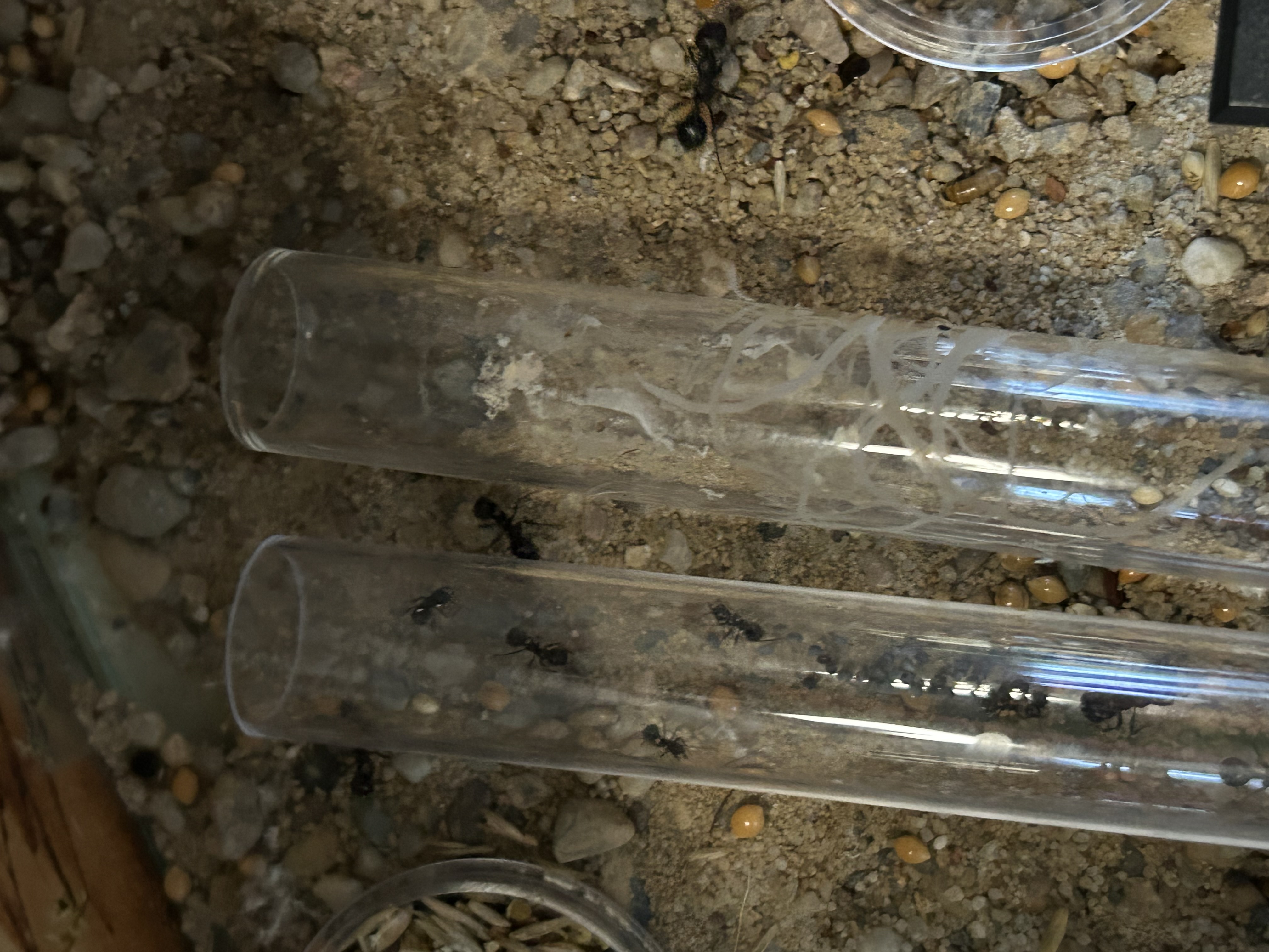 Königin mit aktuell nur 2 kleinen Ameisen. Im unteren (oder linken) sind ein paar kleine, mittlere und auch groĂe. 3 der groĂen waren jetzt schon öfter im angeschlossenem Nest, vorher waren es nur die kleinen. Einen Umzug ins Nest gab es aber noch nicht. Es spielt sich immer noch alles in den ReagenzglĂ€sern ab.
