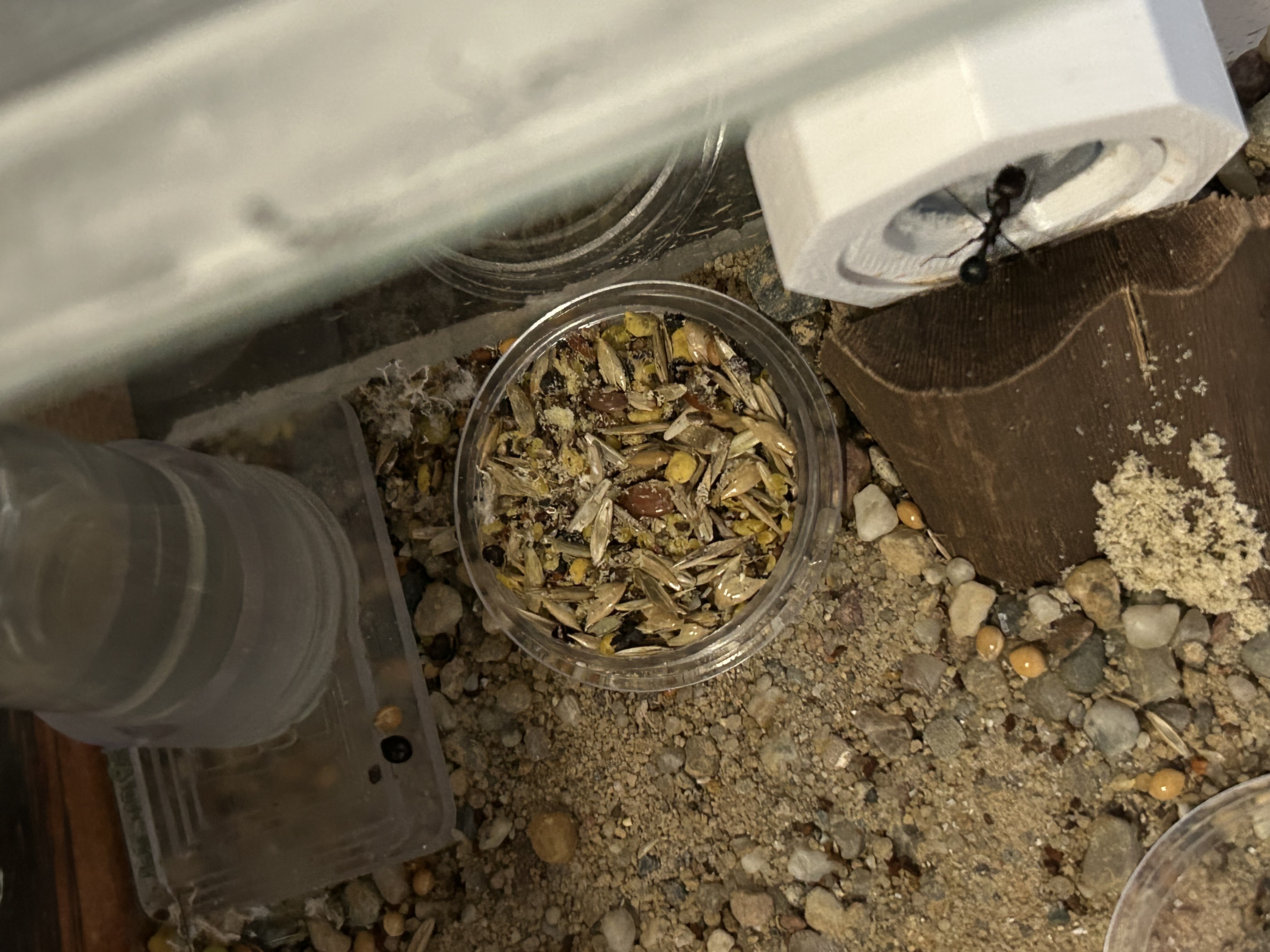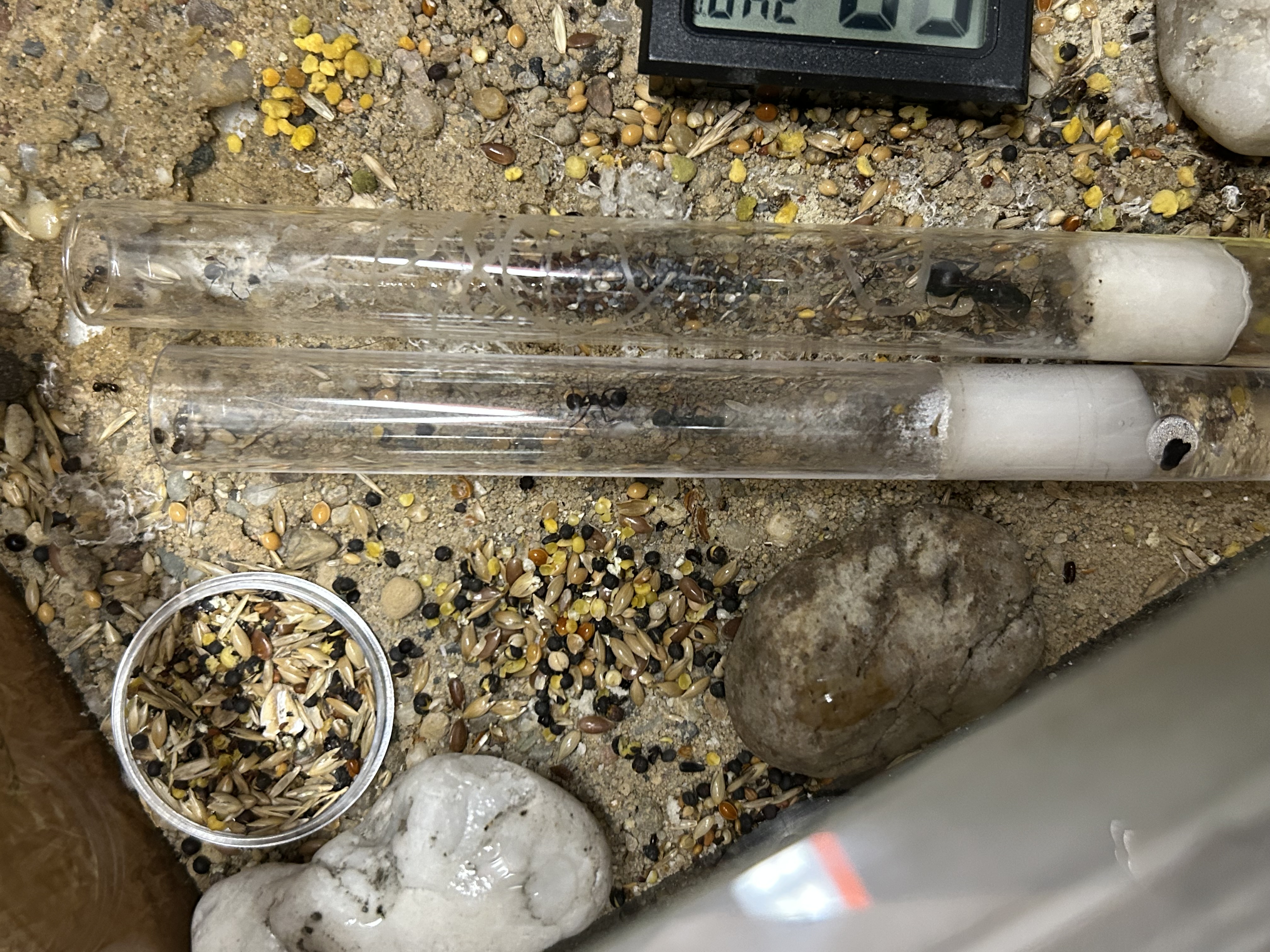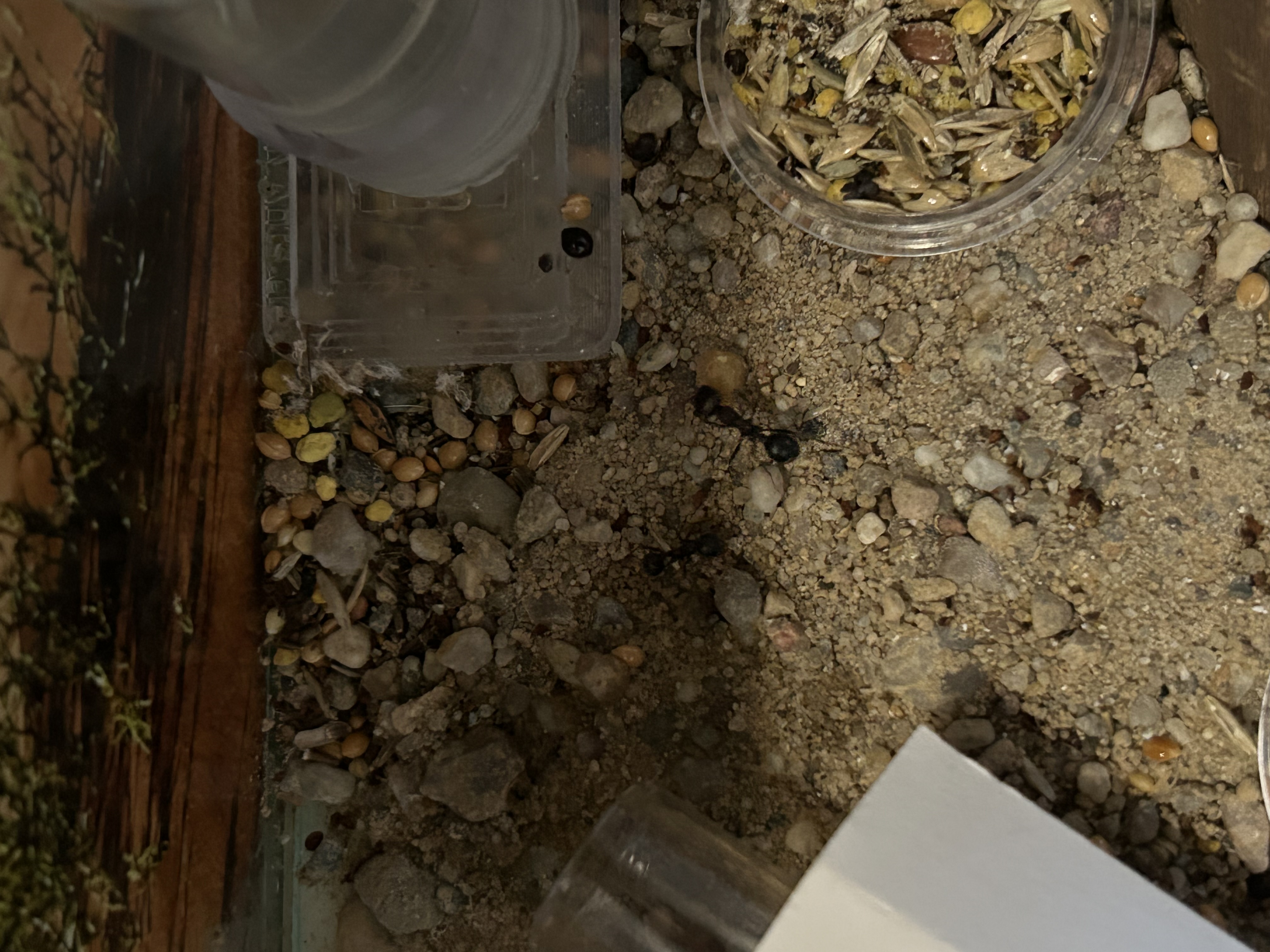 Königin mit aktuell nur 2 kleinen Ameisen. Im unteren (oder linken) sind ein paar kleine, mittlere und auch groĂe. 3 der groĂen waren jetzt schon öfter im angeschlossenem Nest, vorher waren es nur die kleinen. Einen Umzug ins Nest gab es aber noch nicht. Es spielt sich immer noch alles in den ReagenzglĂ€sern ab.