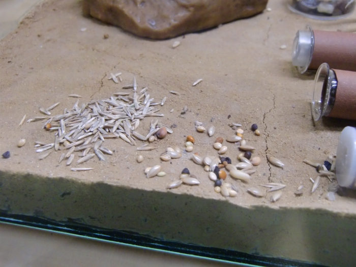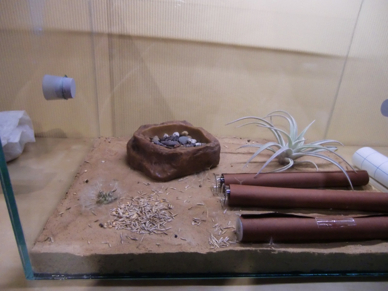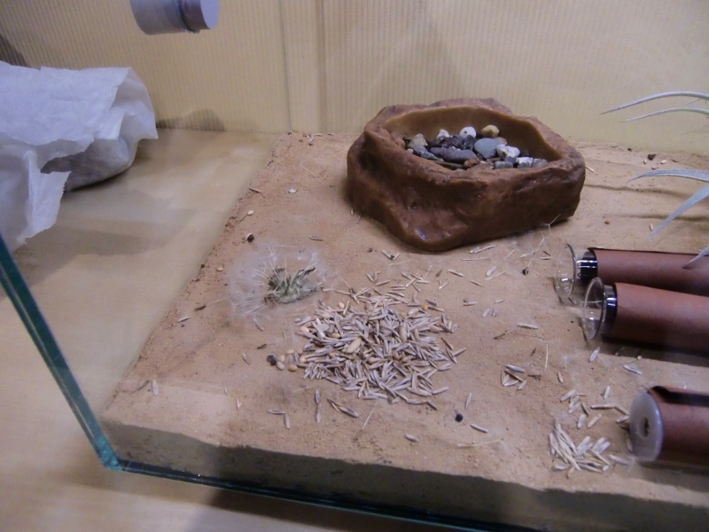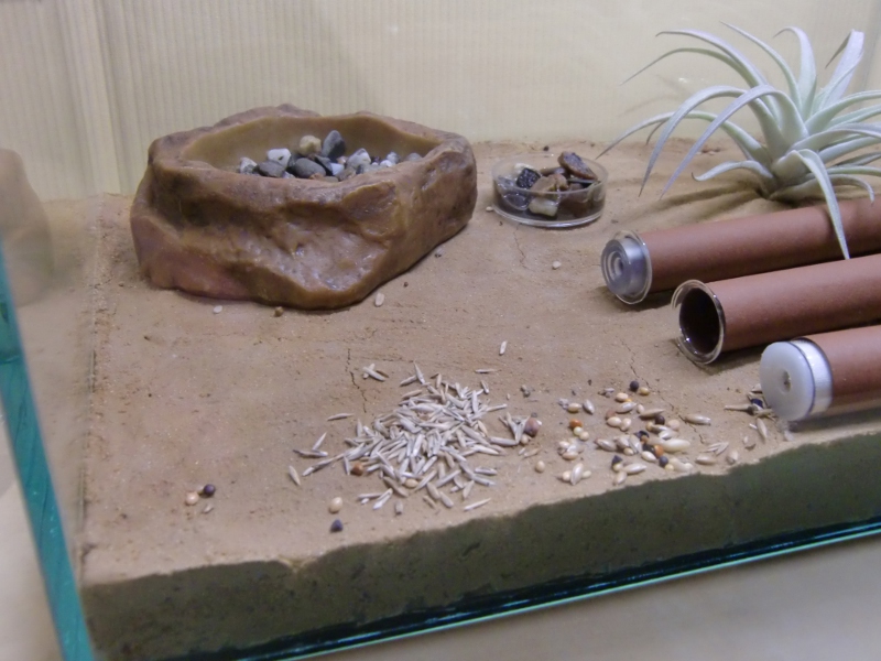 Ich habe das Reagenzglas geöffnet und das Stück Zewa entfernt. Dann habe ich das Reagenzglas mit einen durchbohrten Plastikstopfen versehen, um den Eingang zu verkleinern und das Reagenzglas abgedunkelt. Der Stopfen stammt von einem Plastikröhrchen aus der Apotheke. Angeboten habe ich einige Körner, sowie Wasser in einer mit Kies aufgefüllten Tränke. Bis jetzt konnte ich das Eintragen einiger Samen erkennen. Am Wasser waren sie noch nicht.