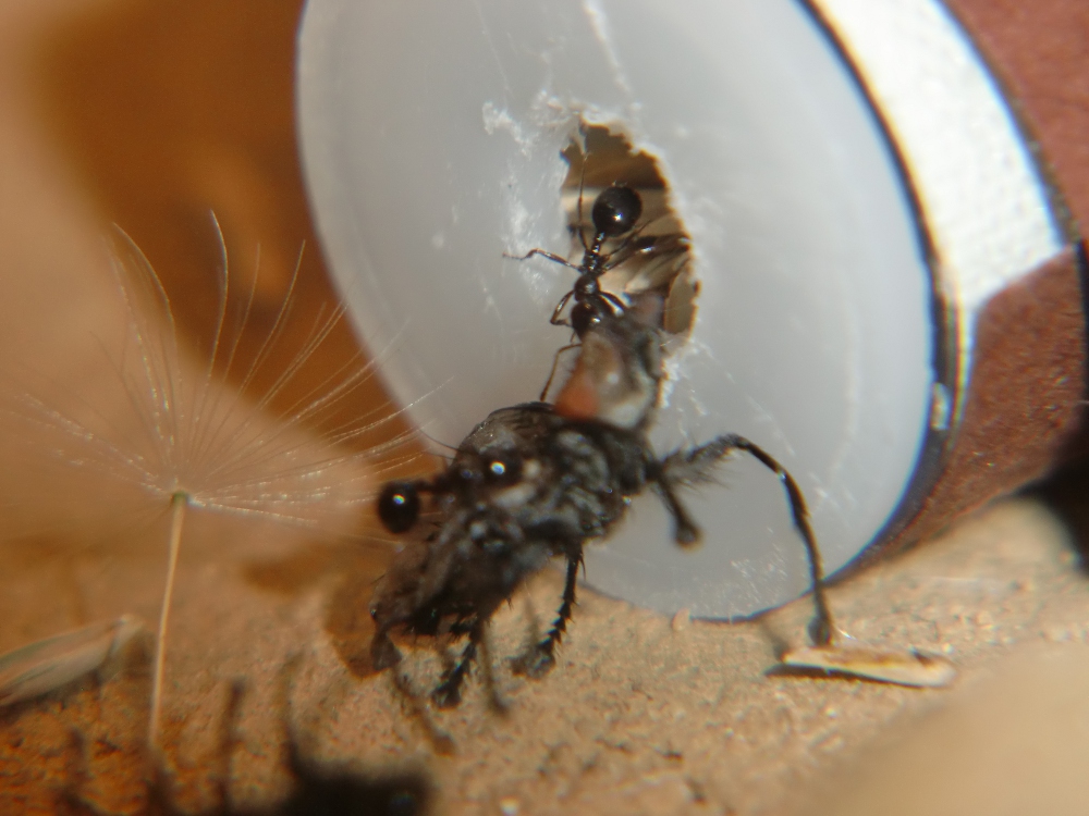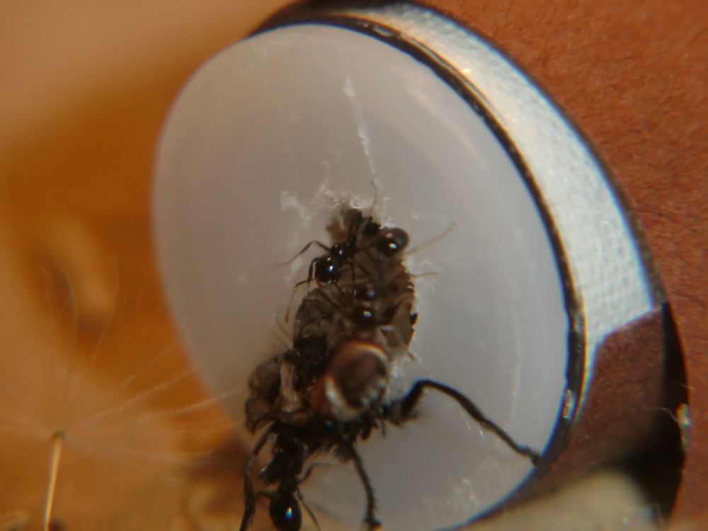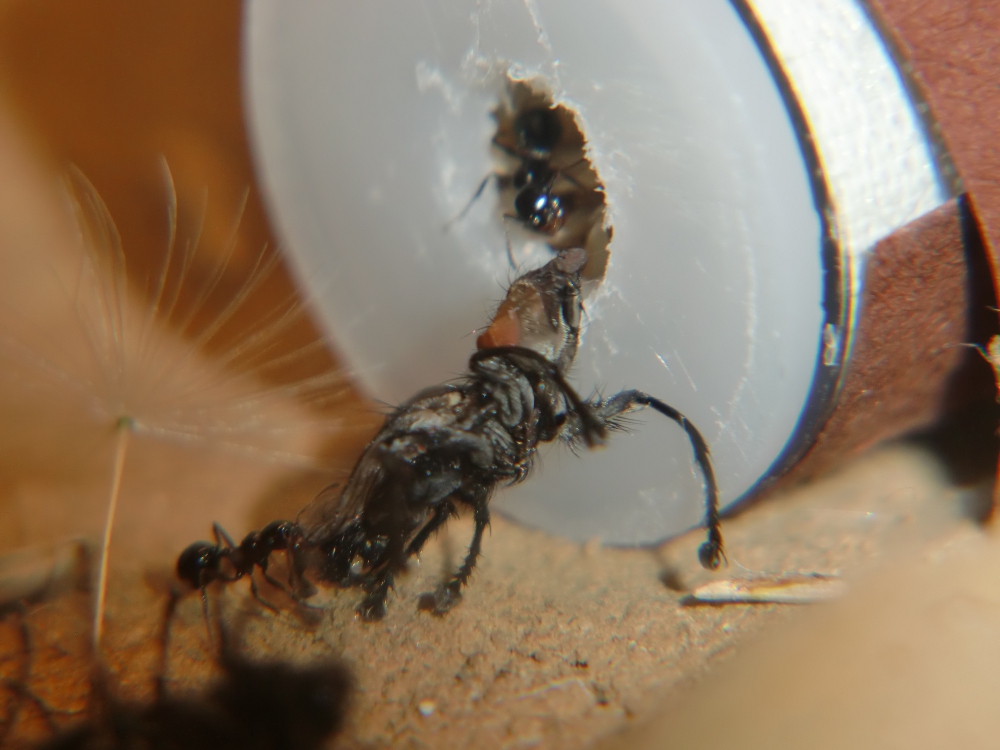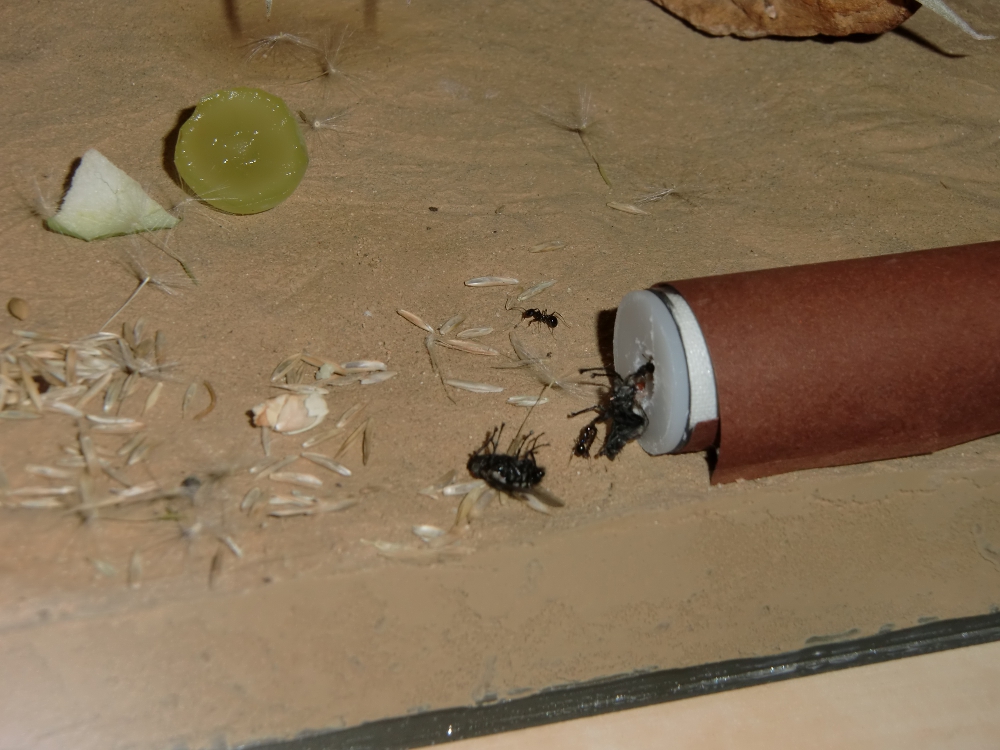 Das Reagenzglas liegt in einer 20x30x20 cm Glasarena von einem Ameisenshop. Bodengrund ist Sand-Lehmmischung, etwa 1:1. Bei der Planze handelt es sich um eine Tillansie. Beheizt wird bislang nicht, somit haben Nest und Arena Zimmerttemperatur. Eventuell werde ich demnächst mit einer Lampe Teile der Arena erwärmen, ich warte noch auf eine Antwort von Herrn Kalytta, da ich ihn nach der genauen Herkunft meiner Kolonie gefragt habe. Als Ausbruchsschutz verwende ich einen Deckel sowie Paraffinöl. Diese Ameisenart kann sehr gut über Glas laufen!