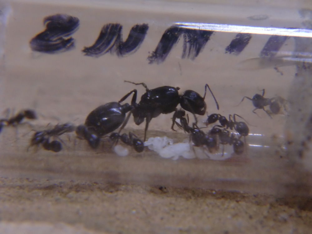 Heute sind meine Ameisen dann angekommen. Geliefert in einem Reagenzglas haben fast alle Ameisen die Reise gut überstanden. Nur eine Arbeiterin ist verstorben, sie wurde zwischen Glas und einen Stück Zewa, das sich im Reagenzglas befand, eingeklemmt und starb vermutlich daran. Die Ameisen hatten einen kleinen Körnervorrat. Nun zu der Kolonie. Ich habe nicht genau zählen können, da ich das Reagenzglas so schnell wie möglich verdunkelt habe, aber geschätzt sind etwa 20 Arbeiterinnen geliefert worden. Bestellt waren 15. Zusätzlich etwas