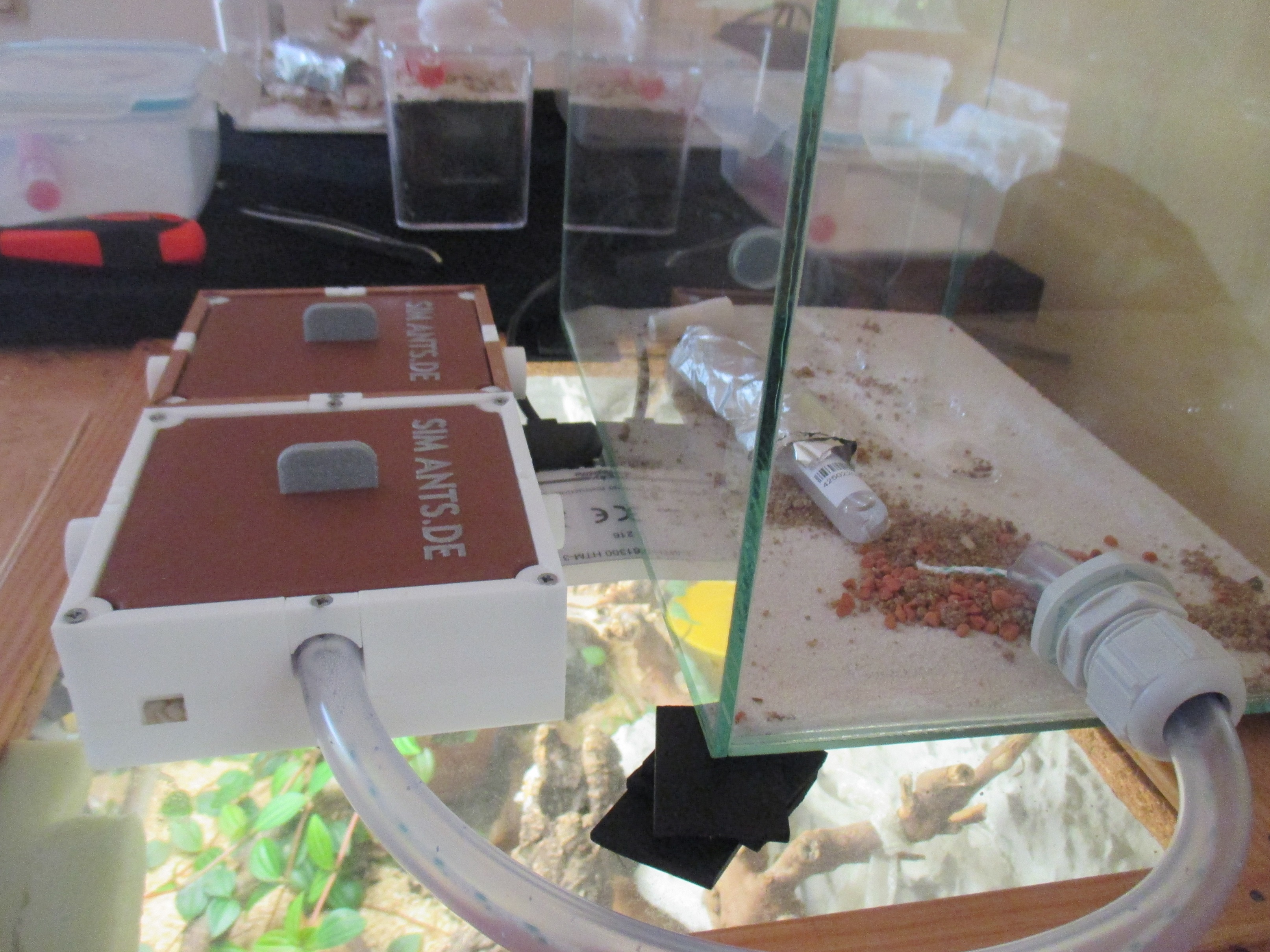 Als Nest habe ich ihnen angeboten 2x Sim-Ants Nest in S. Das rechte Nest, in welchem der Schlauch endet ist feucht, das linke ist komplett trocken. Beide sind innen mit einer Mischung aus Sand und Lehm angepinselt, damit die Ameisen mehr Grip haben und die Feuchtigkeit besser verteilt wird.