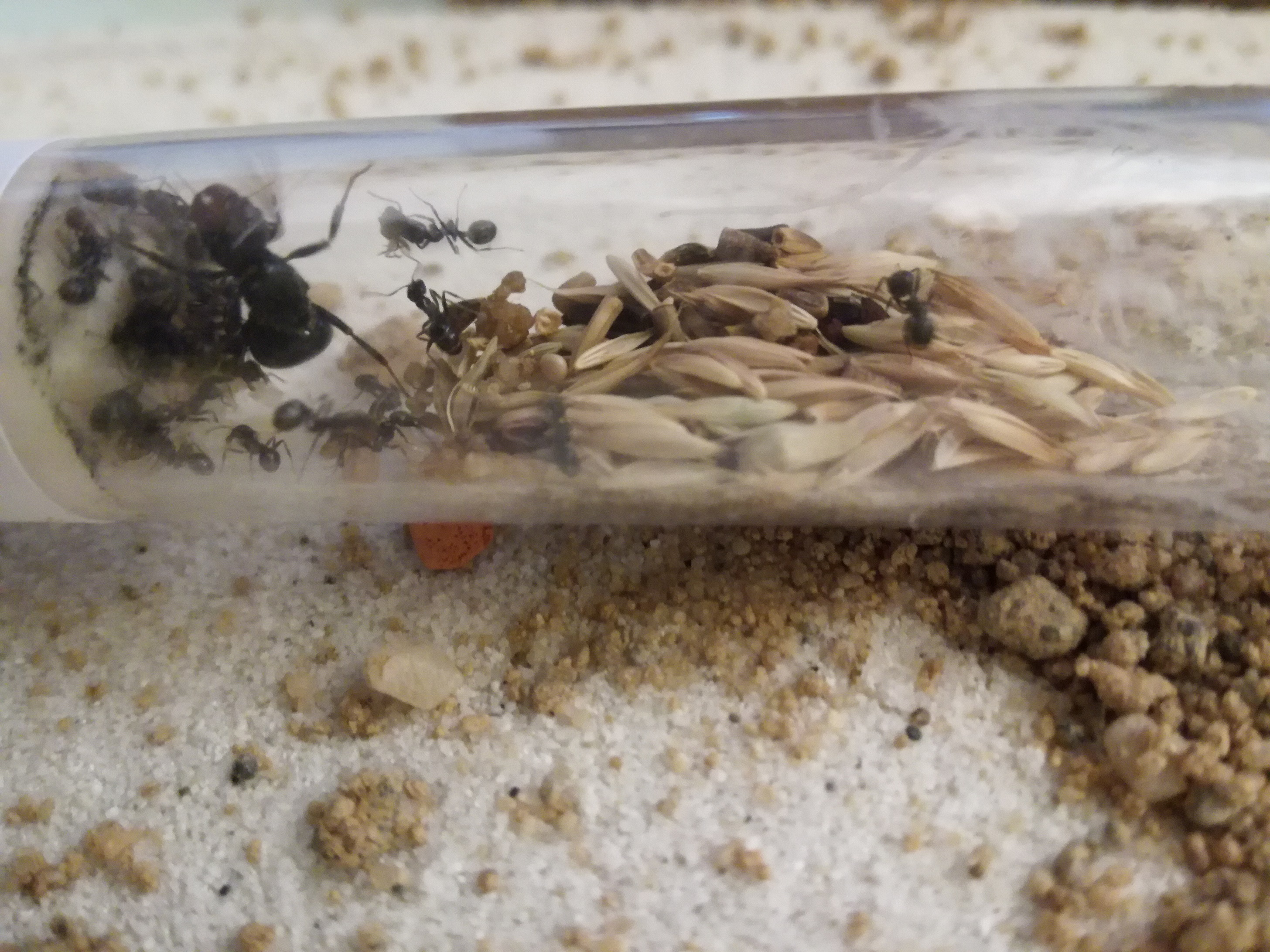 Die Körner wurden zu 80% eingetragen. Ebenso sind die beiden Fruchtfliegen verschwunden. Gestern Abend wurden die einmal durch das komplette Formikarium getragen und ich war mir sicher, dass sie nur den passenden Müllhaufen zur Ablage suchen... Aber ich habe sie im Müll dann doch nicht gefunden.