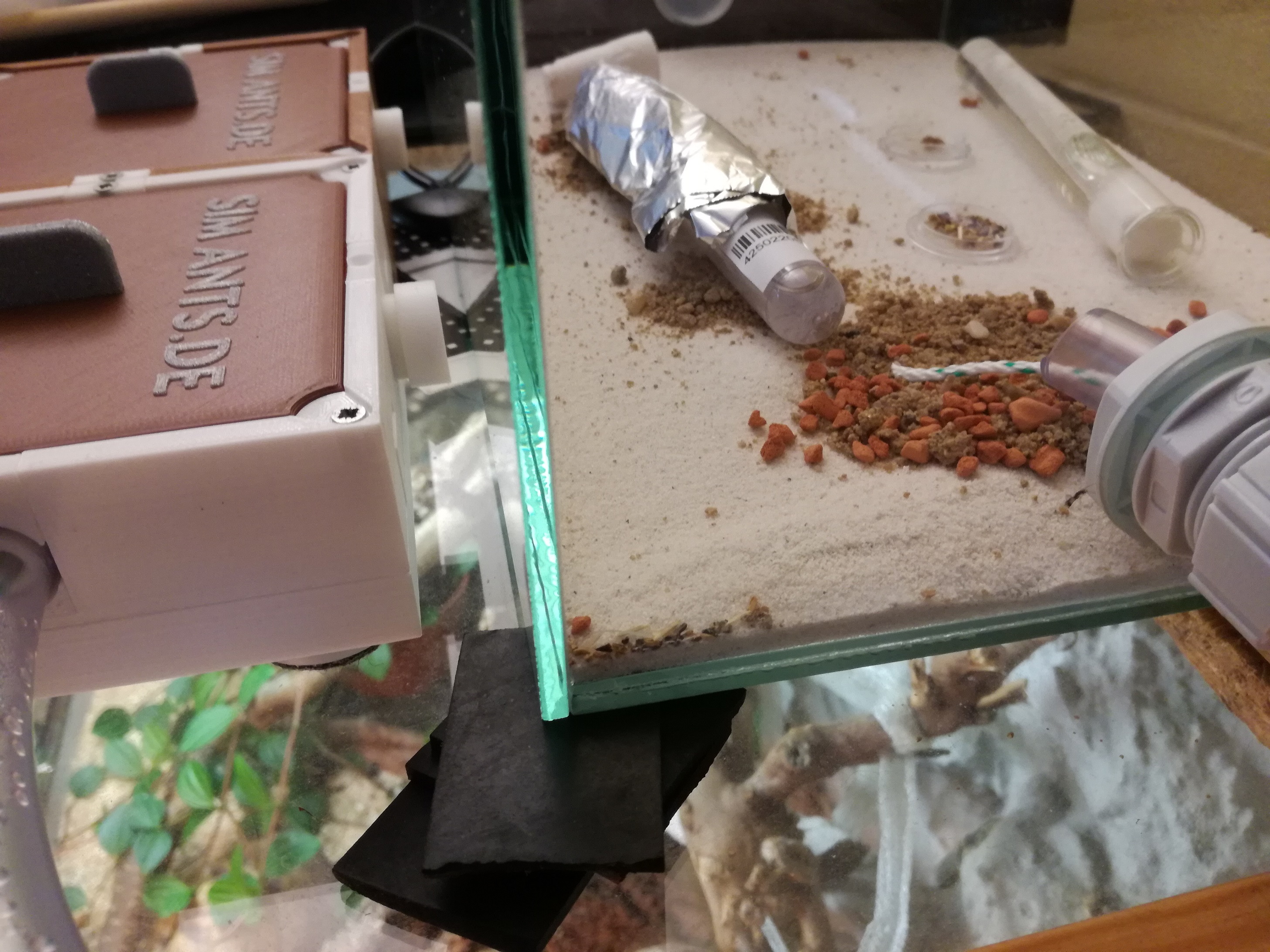 Das externe Nest habe ich zu Beginn leider zu viel befeuchtet. Ich habe immer noch sehr viel Kondenswasser an der Decke im Schlauch, was teilweise von den Arbeiterinnen aber sogar schon aufgenommen wurde. Jetzt ist das Unterteil so gedreht, dass erstmal keine neue Feuchtigkeit direkt in das Nest gelangt.