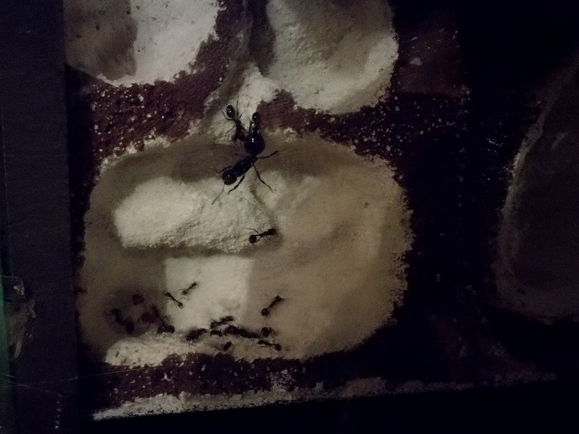 Nachdem die Ameisen die letzten Tage alle Seramis-Steine nutzten um den Eingang des RG immer mehr zu zubauen war heute richtig viel los. Ameisen in allen Größen unterwegs und die Öffnung wurde vergrößert, die Seramis-Steine raus- statt reingetragen. Beim Abendessen ist die Gyne dann umgezogen und ab sofort im neuen Nest. Ich hoffe, sie leben sich gut ein, ich bin sehr gespannt!