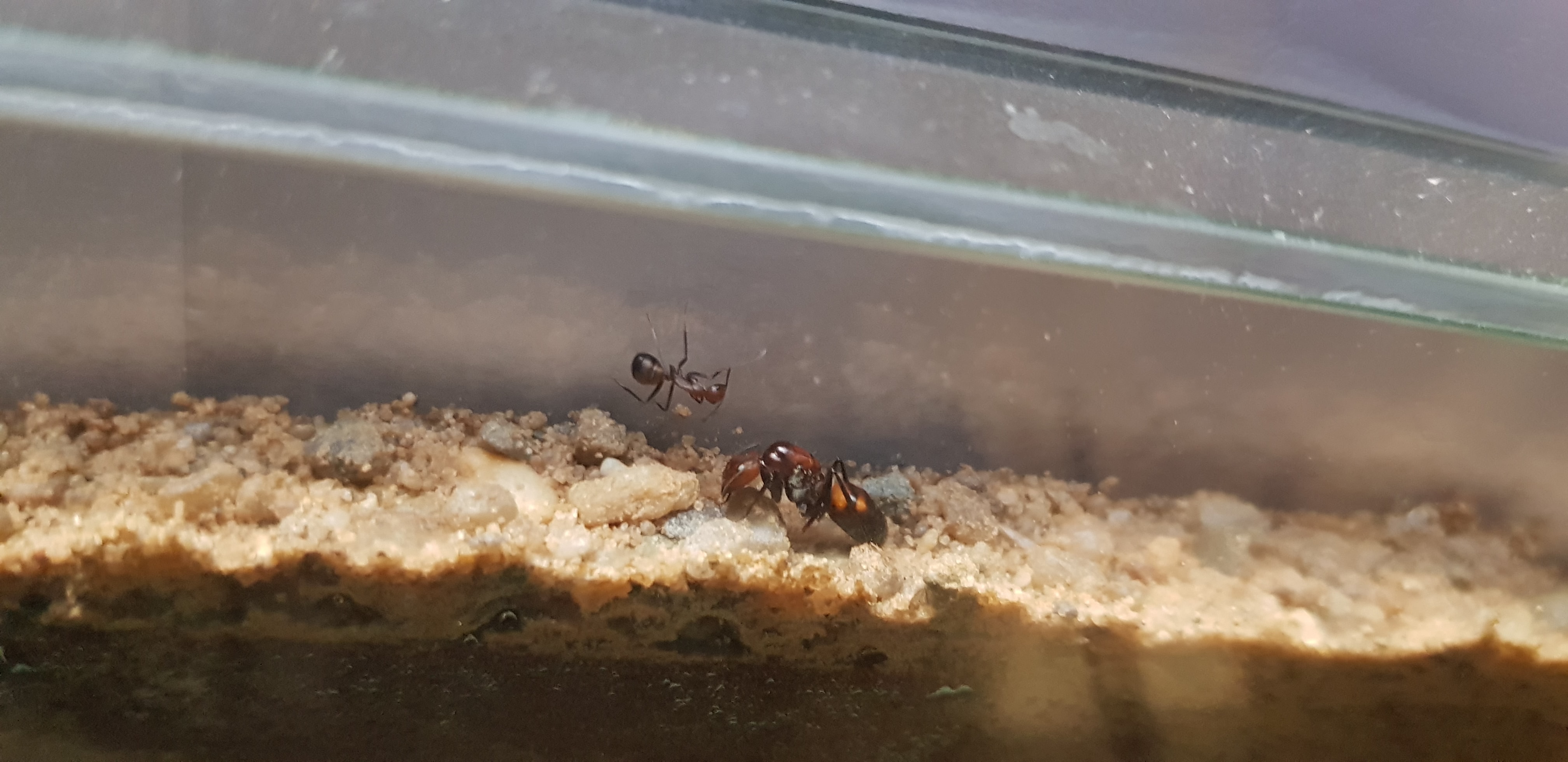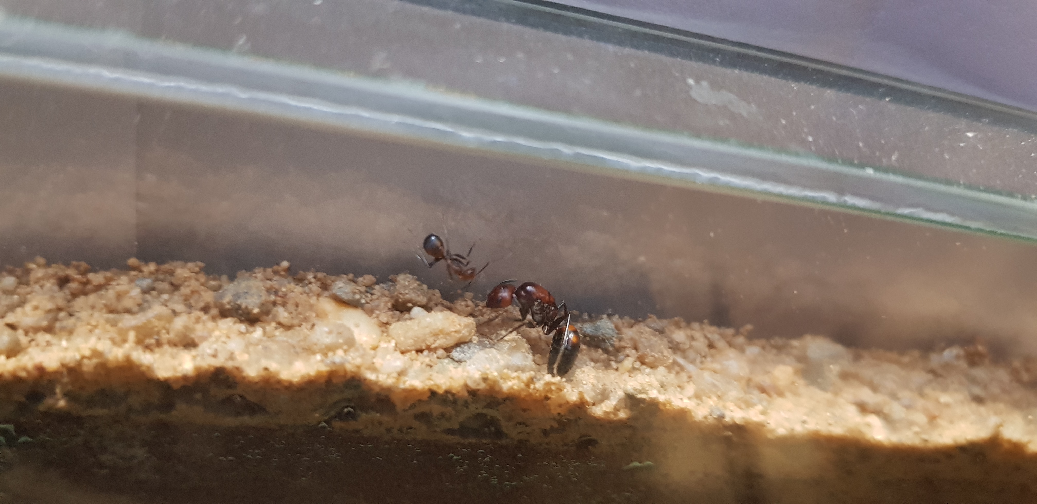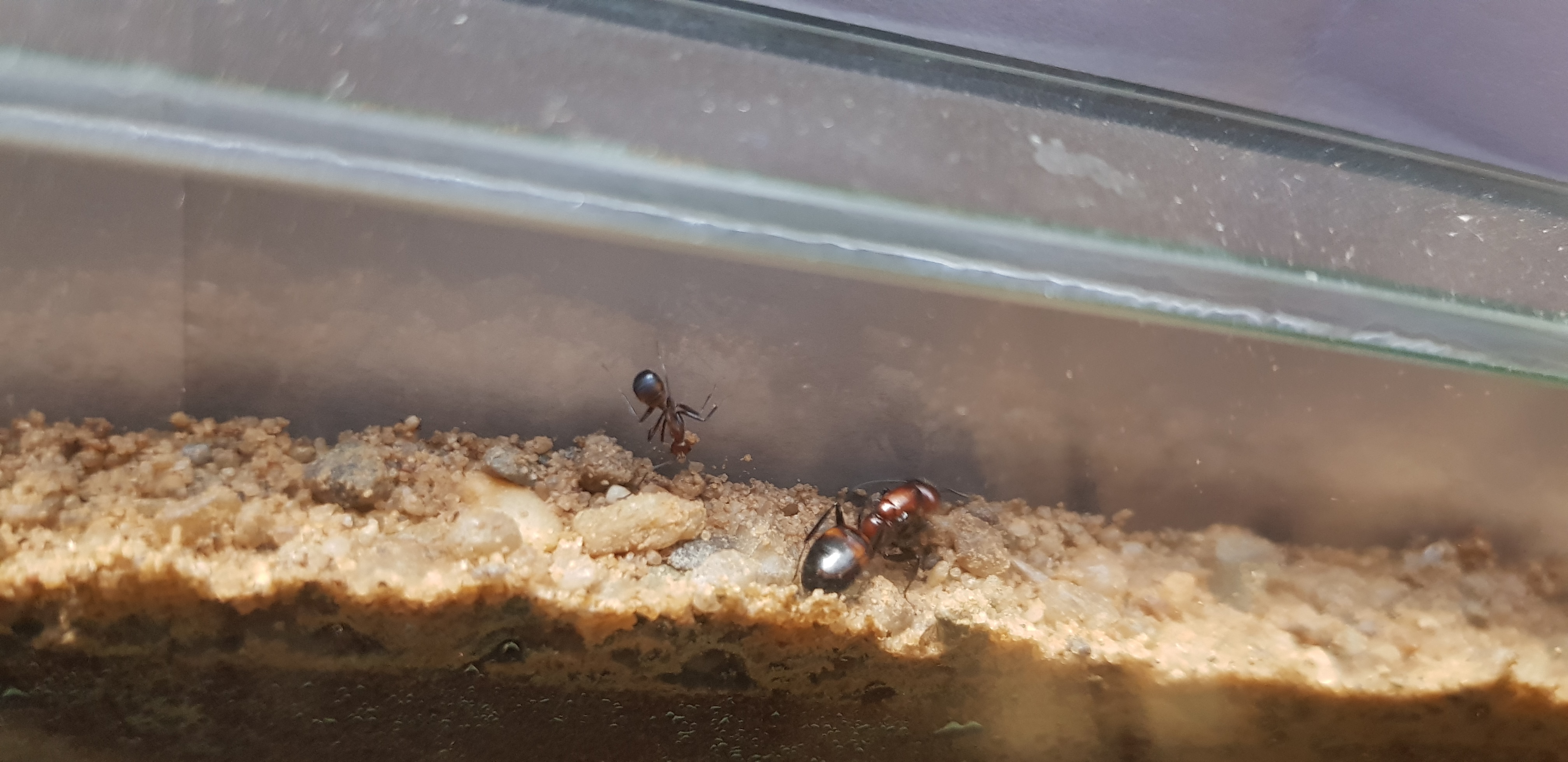 Befeuchten tuhe ich die Nestseite etwa alle 2-3 Wochen. Nach der Befeuchtung hält sich die Königin auch gut und gerne 1 Woche darin auf aber zieht dann wieder in den Mittelgang zwischen Lagerstätte und Nest. Ist es dann wieder zu trocken und soll ich nachfeuchten?
