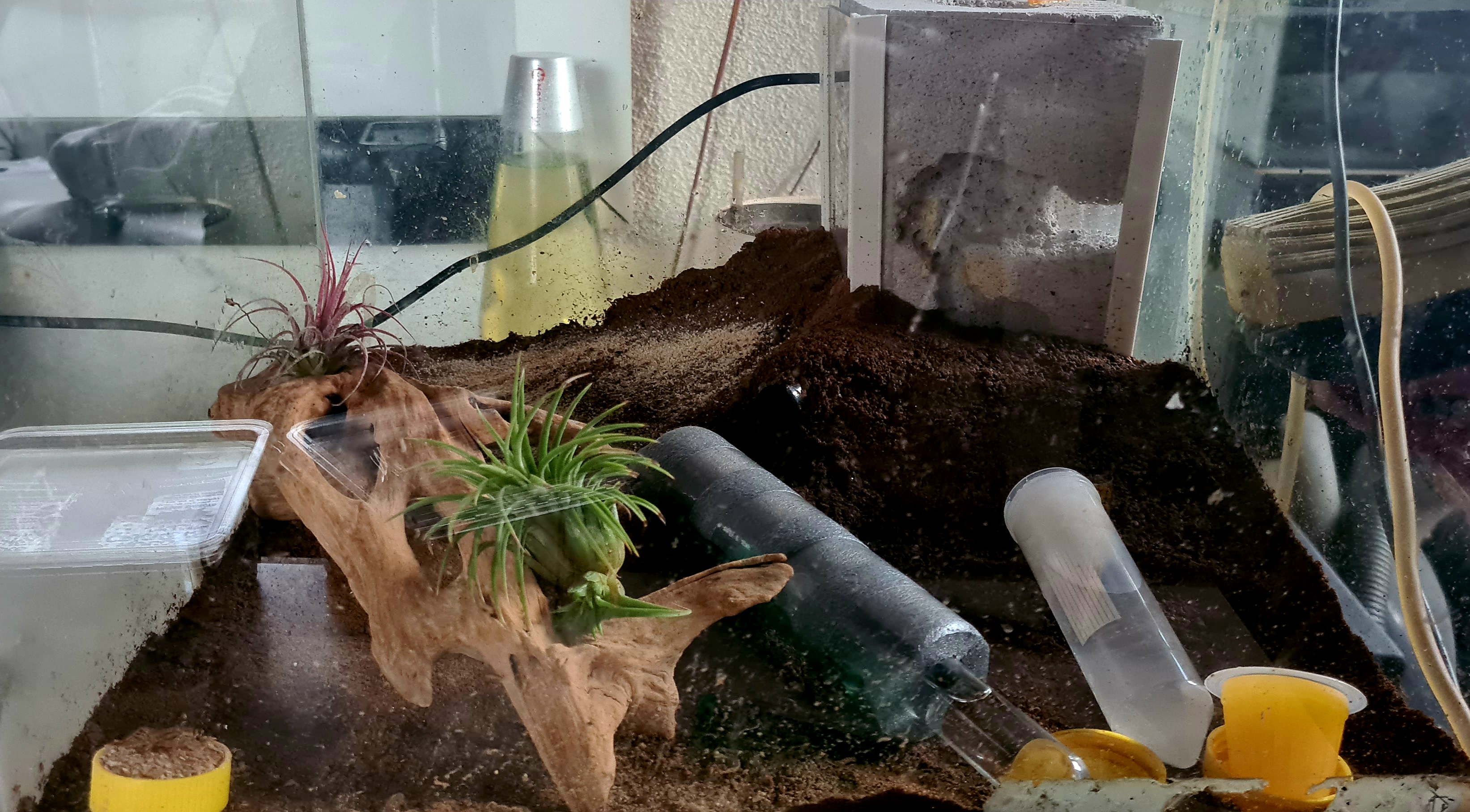 Leider ist die Luftfeuchte noch etwas hoch ( liegt wohl am austrocknenden Sand und dem Yton ) aber die Dame dreht ihre Runden, schaut sich alles an, versuchte schon mal die Glaswände zu erklimmen ( oberer Rand mit Silikonöl ca 3cm breit ) was aber nur bei einem Versuch blieb.