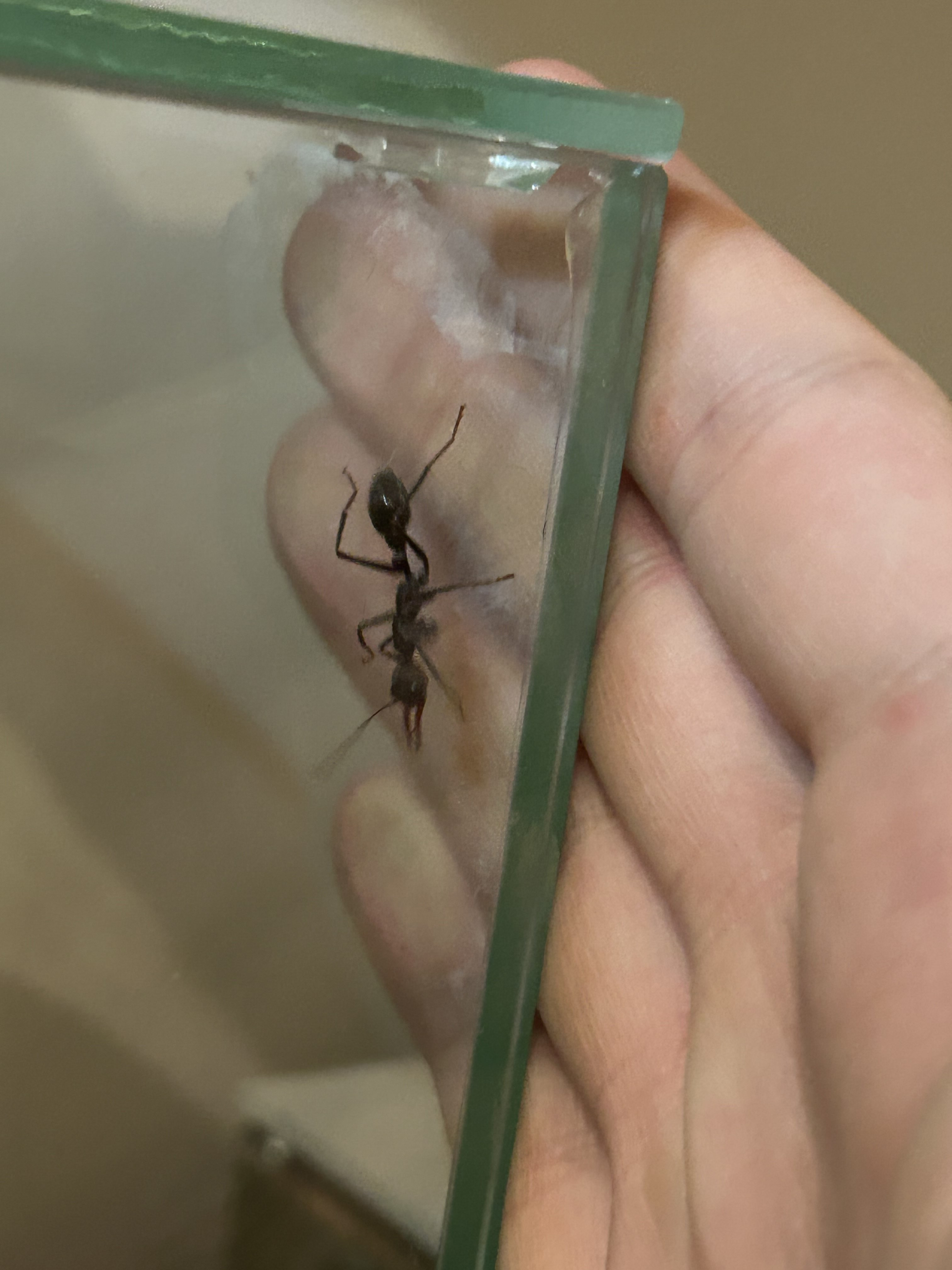 Die Arbeiterin hat mich mit ihren Kletterkünsten sehr überrascht, da ich von vorherigen Ameisen dieser Größe daran gewöhnt war, dass diese Probleme beim Hochklettern an Glas haben.