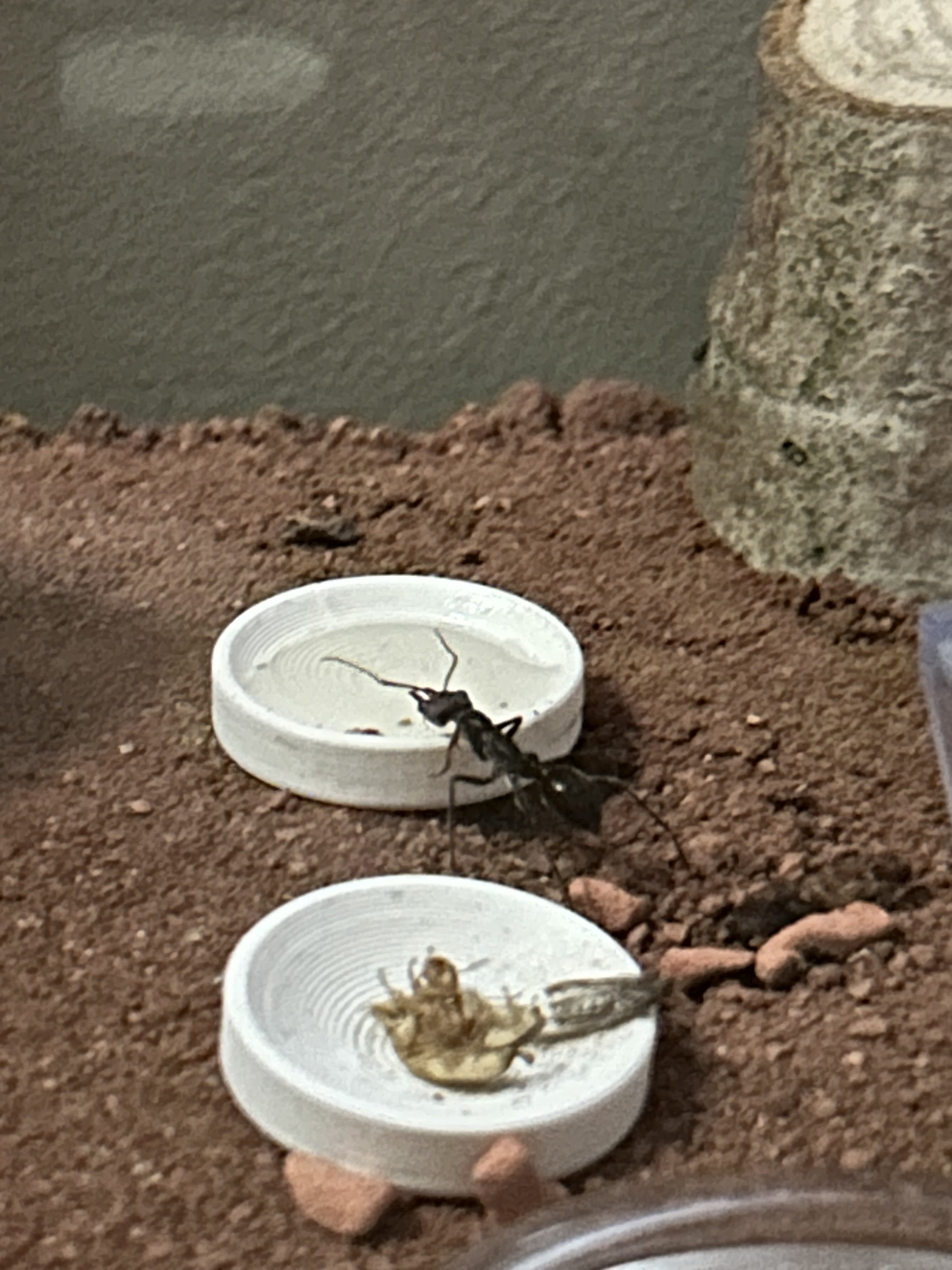 Nur 2 Tage später blieb sie in einem Tropfen Agavendicksaft hängen und verstarb. Seit diesem Vorfall biete ich nur extrem kleine Tropfen Agavendicksaft an und die Kolonie begann, manchmal den Napf mit Steinen aufzufüllen.