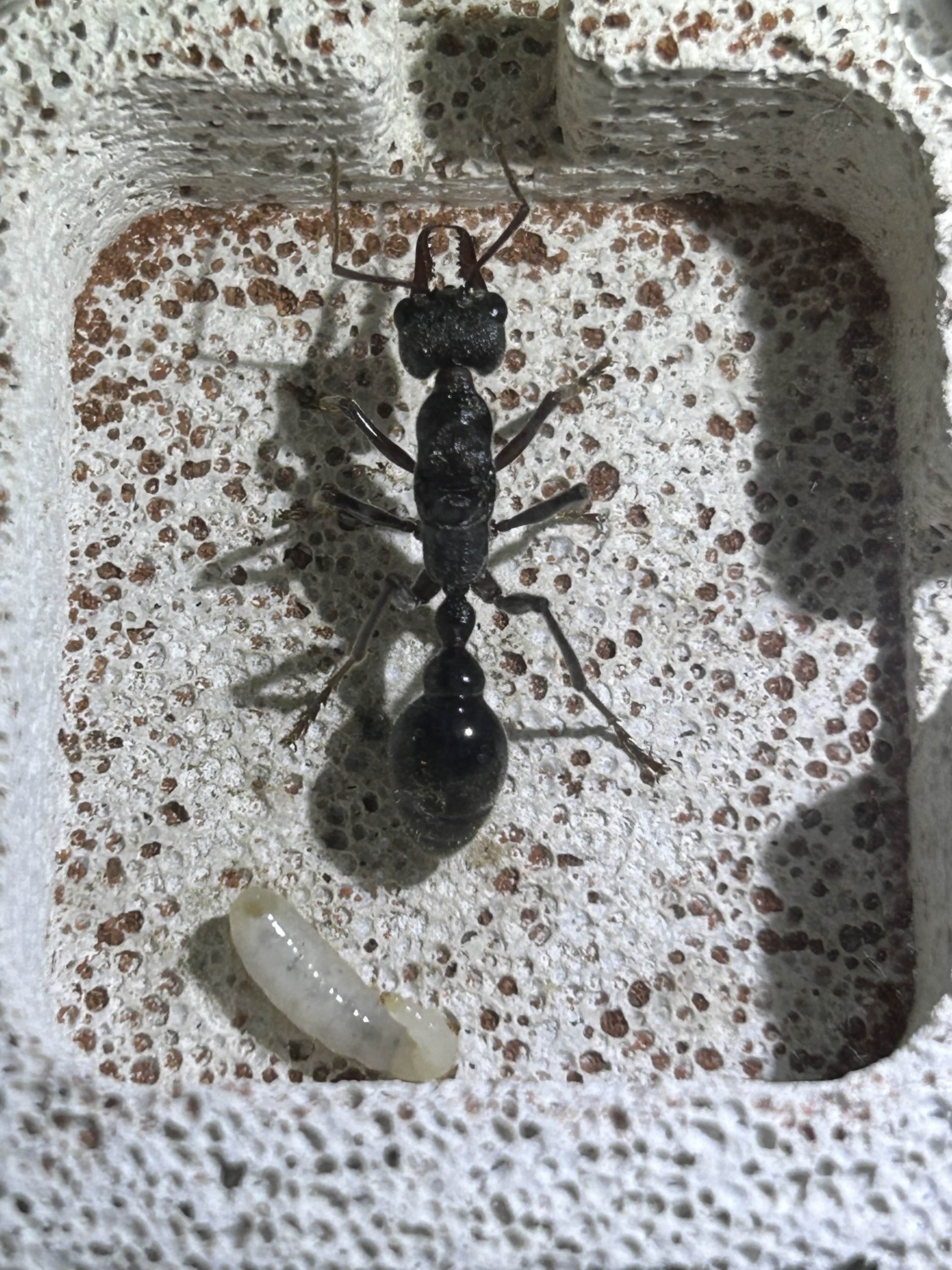 Larve, hier kam es zu einer weiteren Problematik in der Haltung. Als meine erste Myrmecia war mir die wählerische Art der Tiere noch nicht richtig bekannt, ich unterschätzte sie stark und hatte die bisherige Proteinverweigerung darauf geschoben, dass es einfach keine