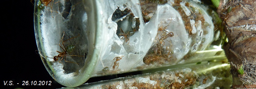 Vorsichtig holte ich ein Reagenzglas aus dem Holzwolle-Gewühl und betrachtete die trägen Ameisen - es gab ein paar Transport-Leichen, doch keine allzu großen Verluste.