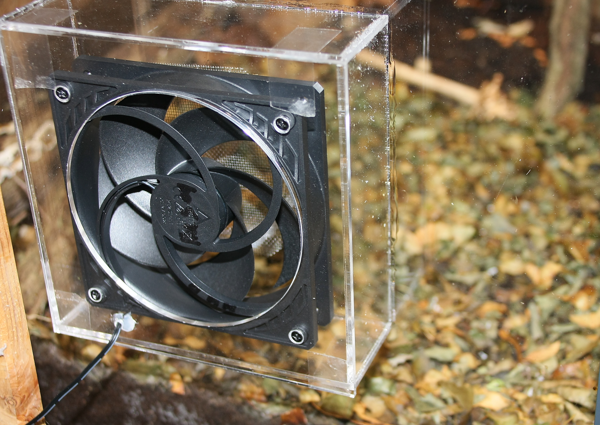Der LĂĽfter ist jetzt fertig eingebaut, ein groĂźer 12 cm LĂĽfter der auch mit geringer Drehzahl ordentlich Luftdurchsatz hinbekommt.