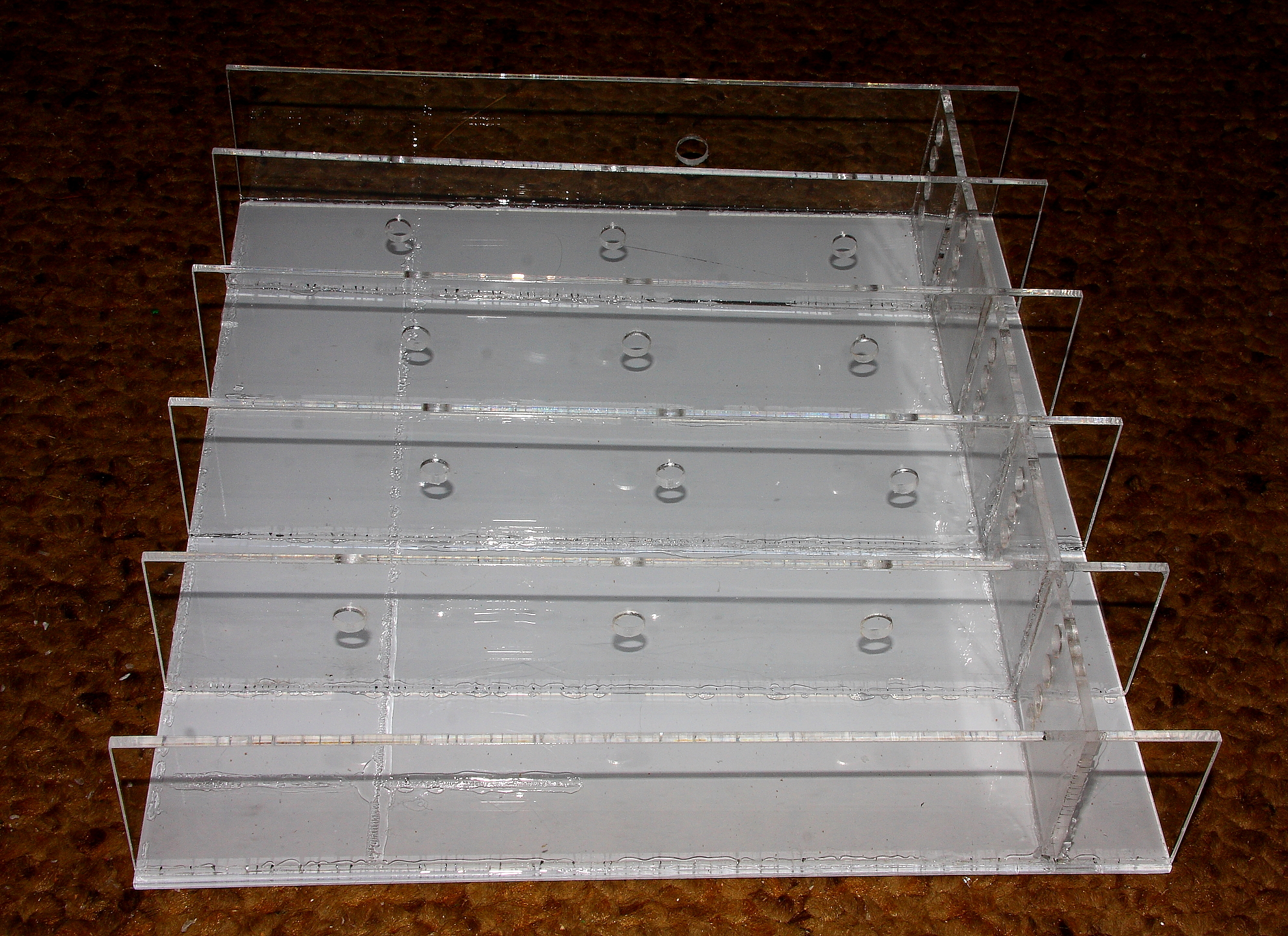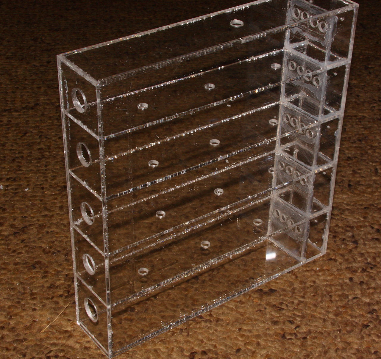 Links die Eingangsöffnungen, diese Seite wird passend in eine der Seitenwände der Arena eingefügt, so dass die Lochplatte bündig mit der Seitenwand abschließt.