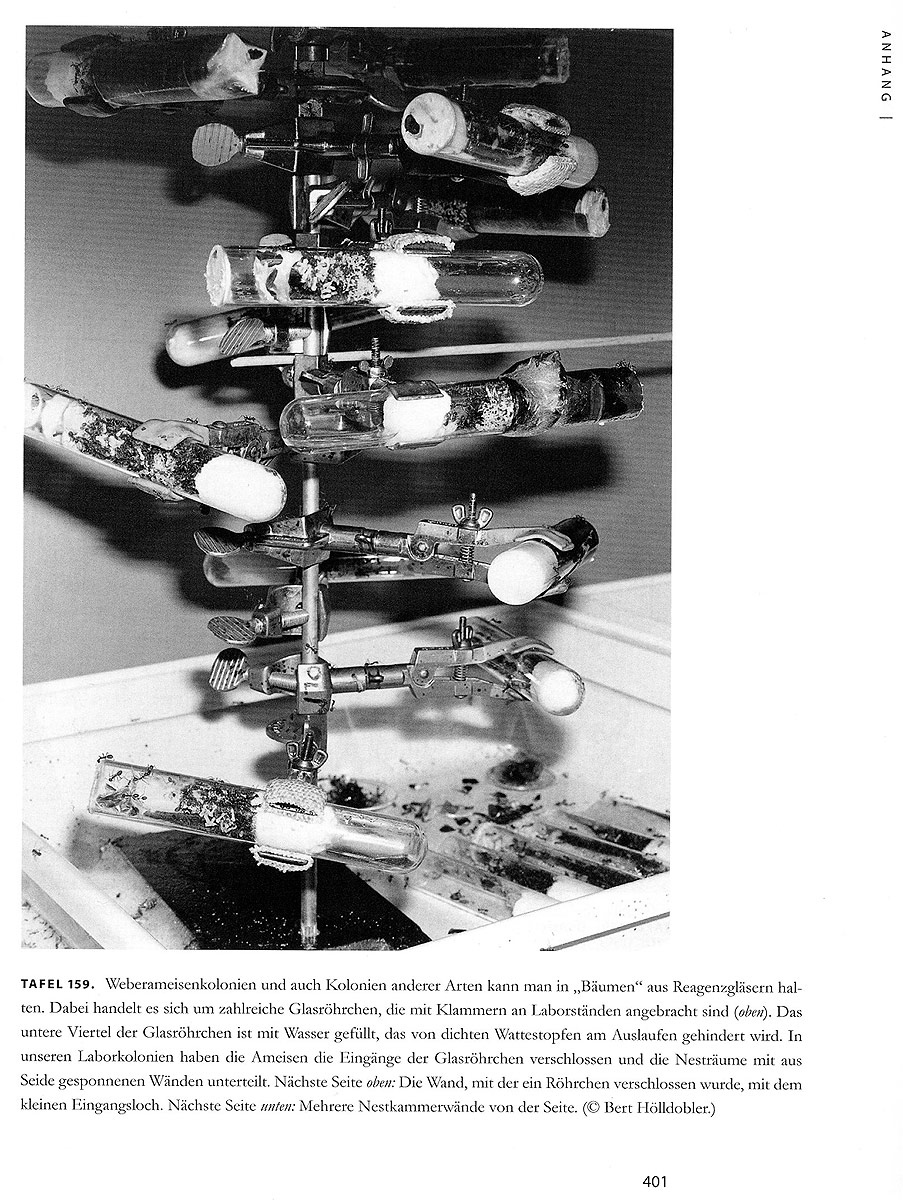 Auf die Idee mit dem Reagenzglasbaum sind Hölldobler & Wilson bereits vor über 30 Jahren gekommen. Publiziert u.a. in „Journey to the Ants“ 1994 und in deutscher Übersetzung 2013 in „Auf den Spuren der Ameisen“, woraus ich eben die 2 Bilder kopiert habe. Erfunden hat das jedenfalls nicht der Antstore (habe das Video nicht ganz angesehen, weiß nicht, ob er auf die Quelle dieser Idee verwiesen hat). Gewiss gibt es noch Veröffentlichung von vor 1994 in der einen oder anderen Arbeit von Hölldobler und/oder Wilson.