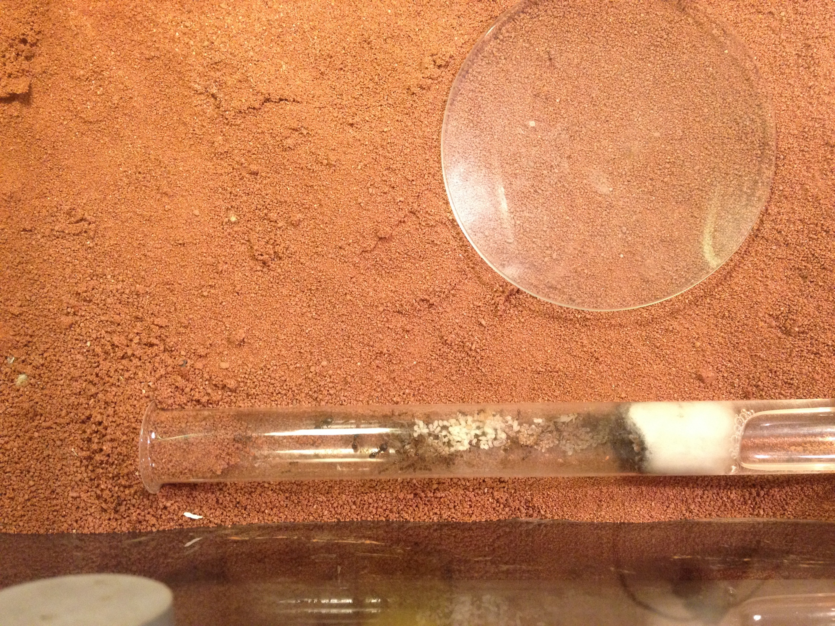 Das Becken wird von mir nicht geheizt, also schwankt die Temperatur je nach Raumtemperatur. Die Luftfeuchtigkeit messe ich nicht, ich sprühe allerdings regelmäßig. Grund hierfür ist einfach, so lange das RG noch ausreichend Platz für die Kolonie bietet und der Wassertank nicht leer ist, möchte ich verhindern das die Kolonie eigenständig beginnt ein Nest zu graben. Deshalb bleibt der Sand erstmal trocken, so muss ich mich nicht darum kümmern das der Nestbereich die nötige Feuchtigkeit hat. Um den Kleinen Wasser anzubieten steht ein RG gefüllt mit Wasser in der Arena.