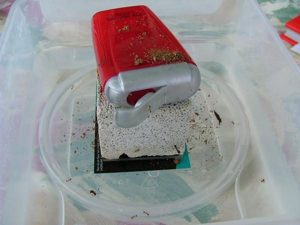 Als wieder Ruhe eingekehrt war, buddelte ich um die Höhle herum, lockerte dann die Decke, packte mit der Pinzette hinein und hebelte einen Teil der Höhle aus. Daran war die Gyne, sowie Brut, Minors und Majors. Schnell hob ich das Erdteil mit der Pinzette haltend hinüber zur Insel. Mein Ziel: Den kleinen Erdbrocken auf der Tic-Tac Dose ablegen. Von dort könnten alle dann in die Dose, bzw. sofort in den schützenden (feuchten) Ytong.