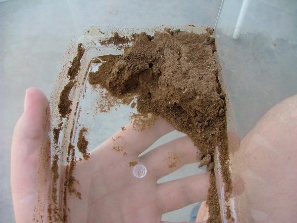 - einem kleinen, neuen PVC-Becken, in dessen Ecke ich nur ein klein Wenig Erd-/ Sandgemisch anhäufte. Der Rand wurde wieder mit Speiseöl bearbeitet (dünn, damit es nicht nach unten läuft), auf den Boden kam ein kleines Papiertaschentuch, das ich in Wasser getränkt hatte.