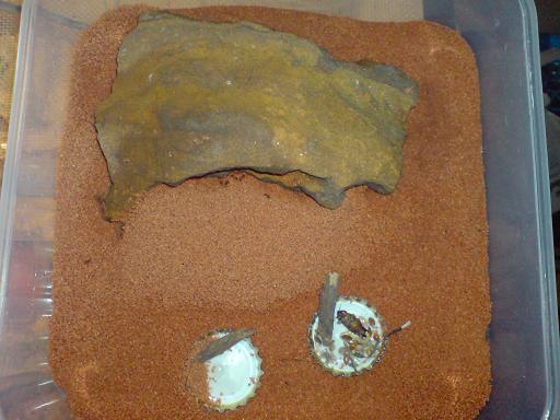 Nun sind sie in einem Formikarium mit rotem Lehm Sand Gemisch, was angefeuchtet ist, und ein Stein ist in der Mitte, Fotos von selbigen werde ich noch im Nachhinein rein editieren.