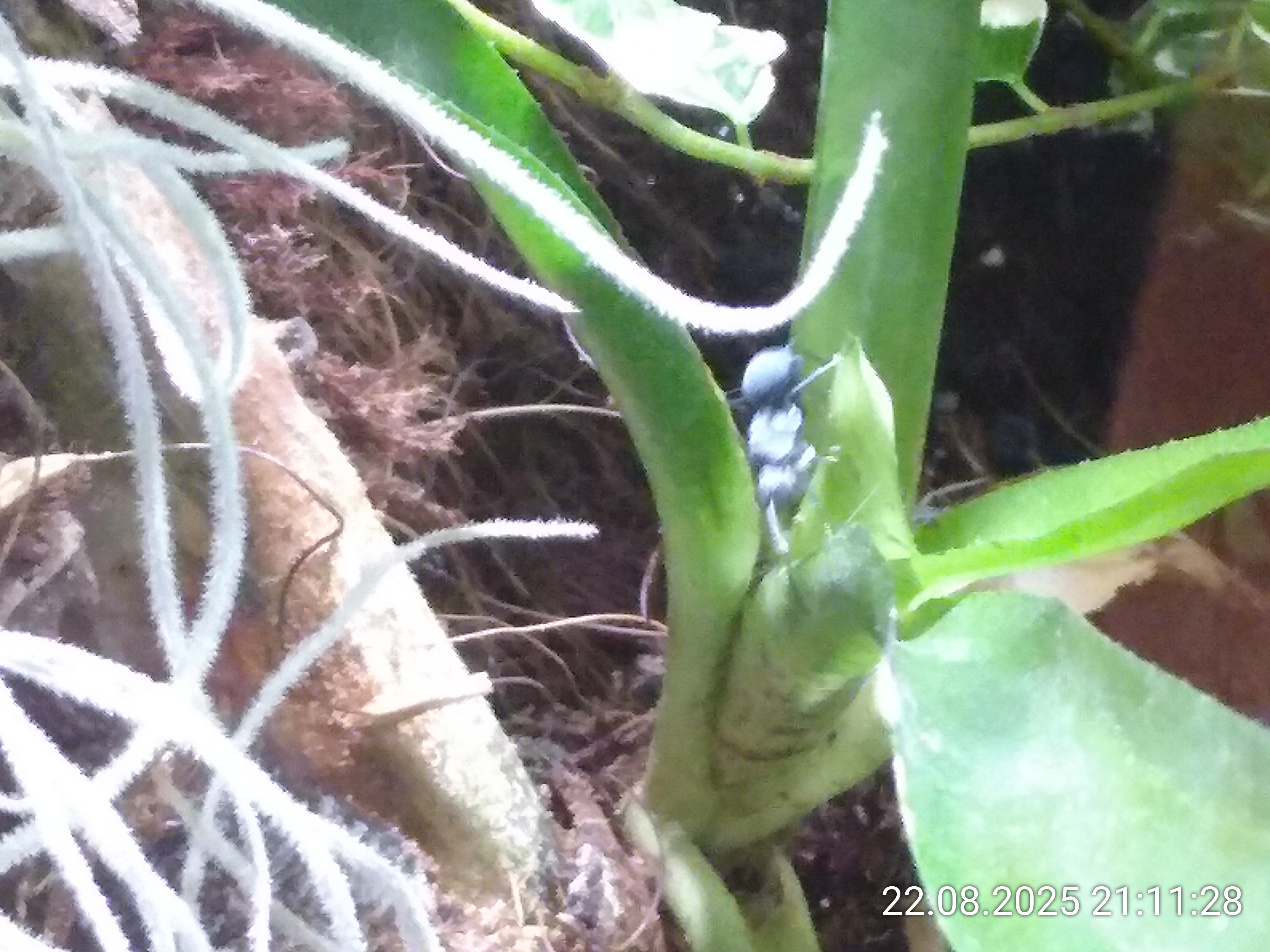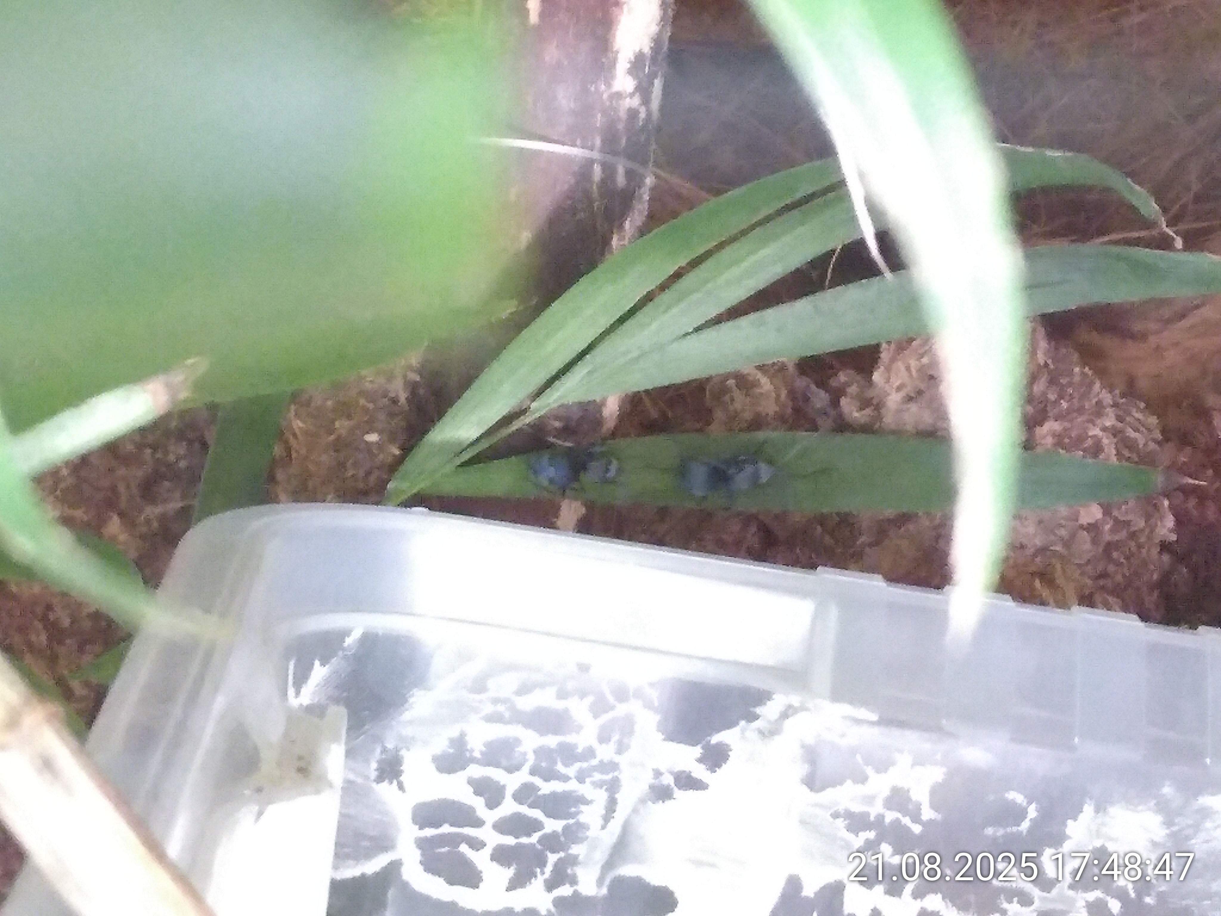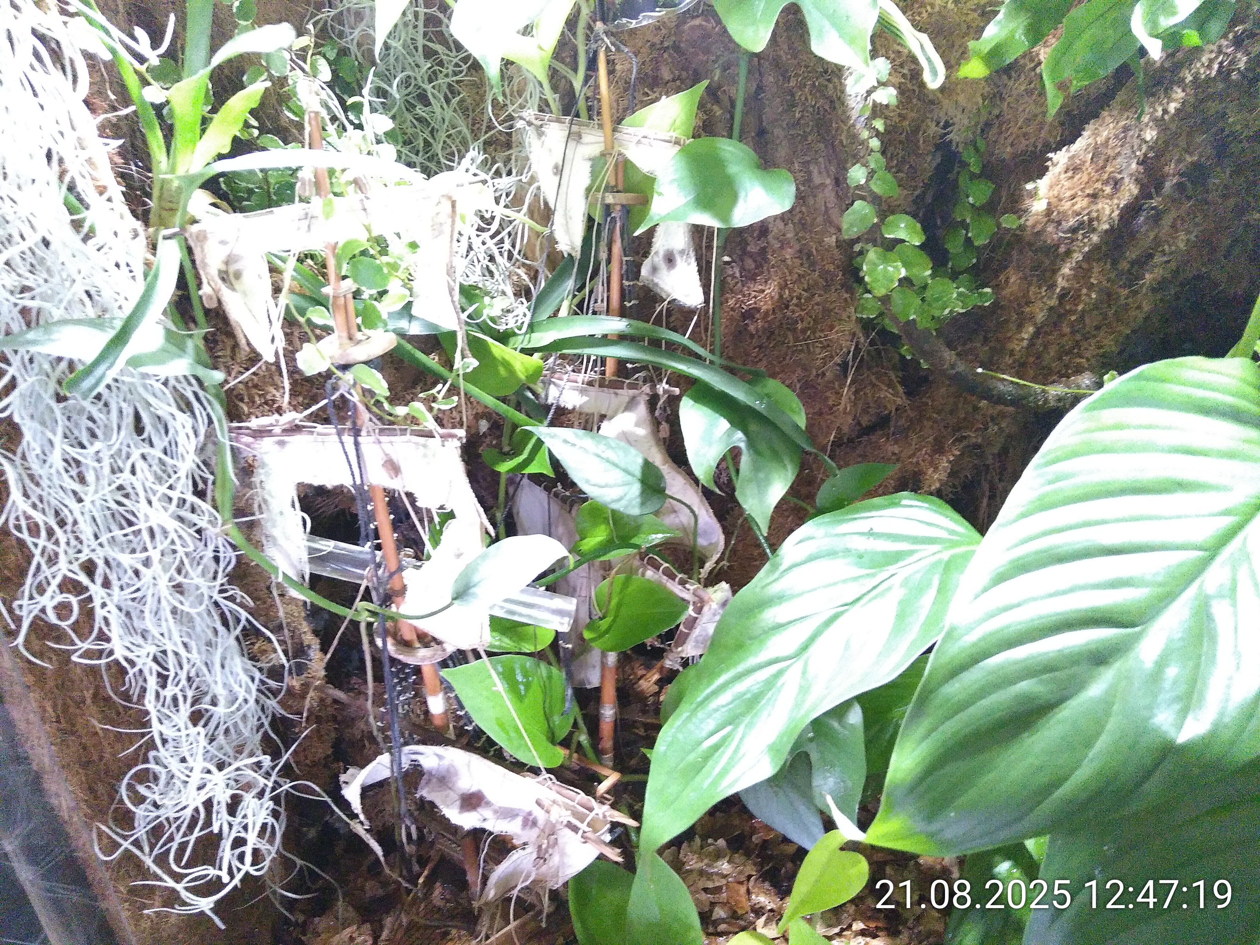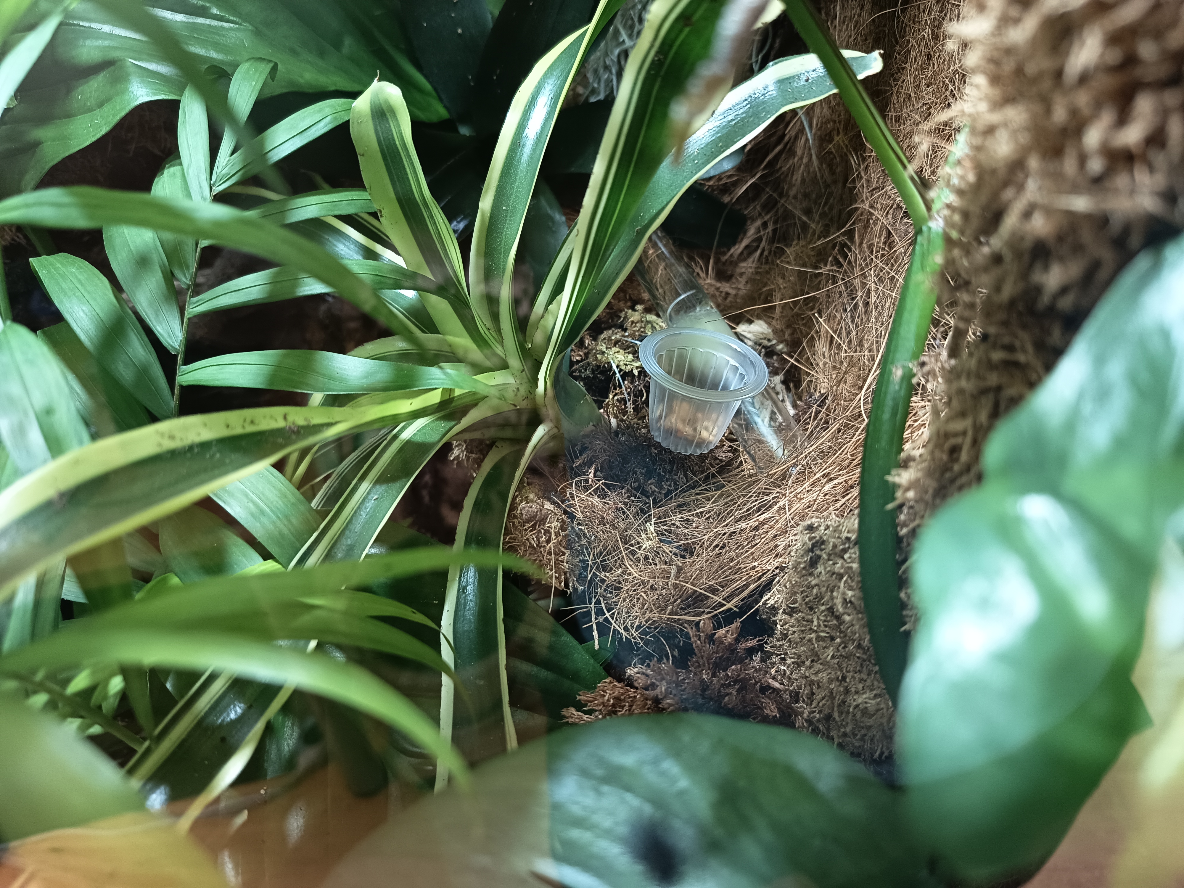 Das lief bisher richtig gut. Ich konnte auch schon mehrmals beobachten, dass sie sich Baumaterial ins Nest geholt haben. Erdklumpen und kleine Perlite(?)-Kugeln aus Blumenerde. DIe Wasserversorgung ist auch gelöst. Ich habe schon eine aus einer Bromelie trinken sehen. Ein schönes Bild :)