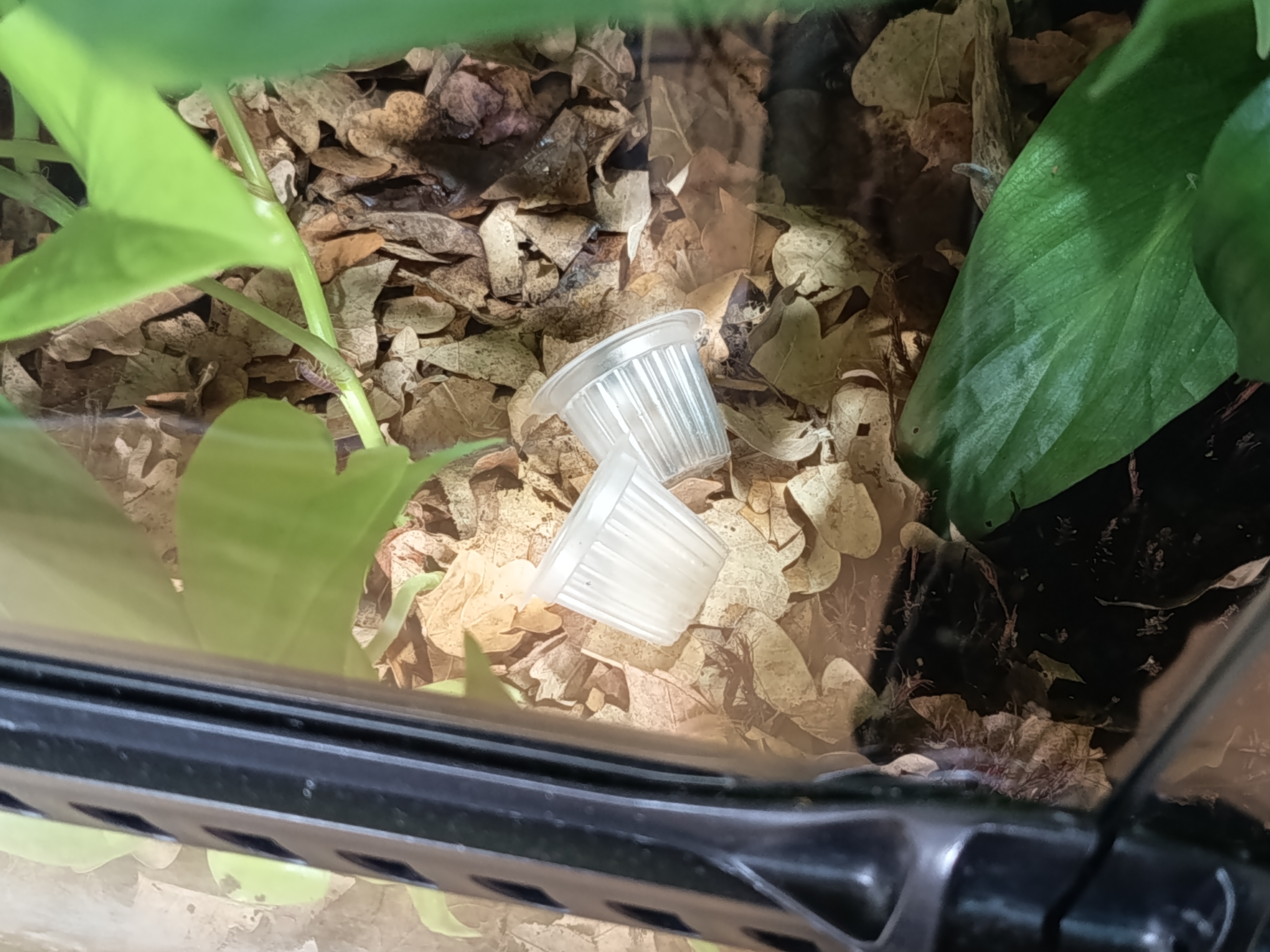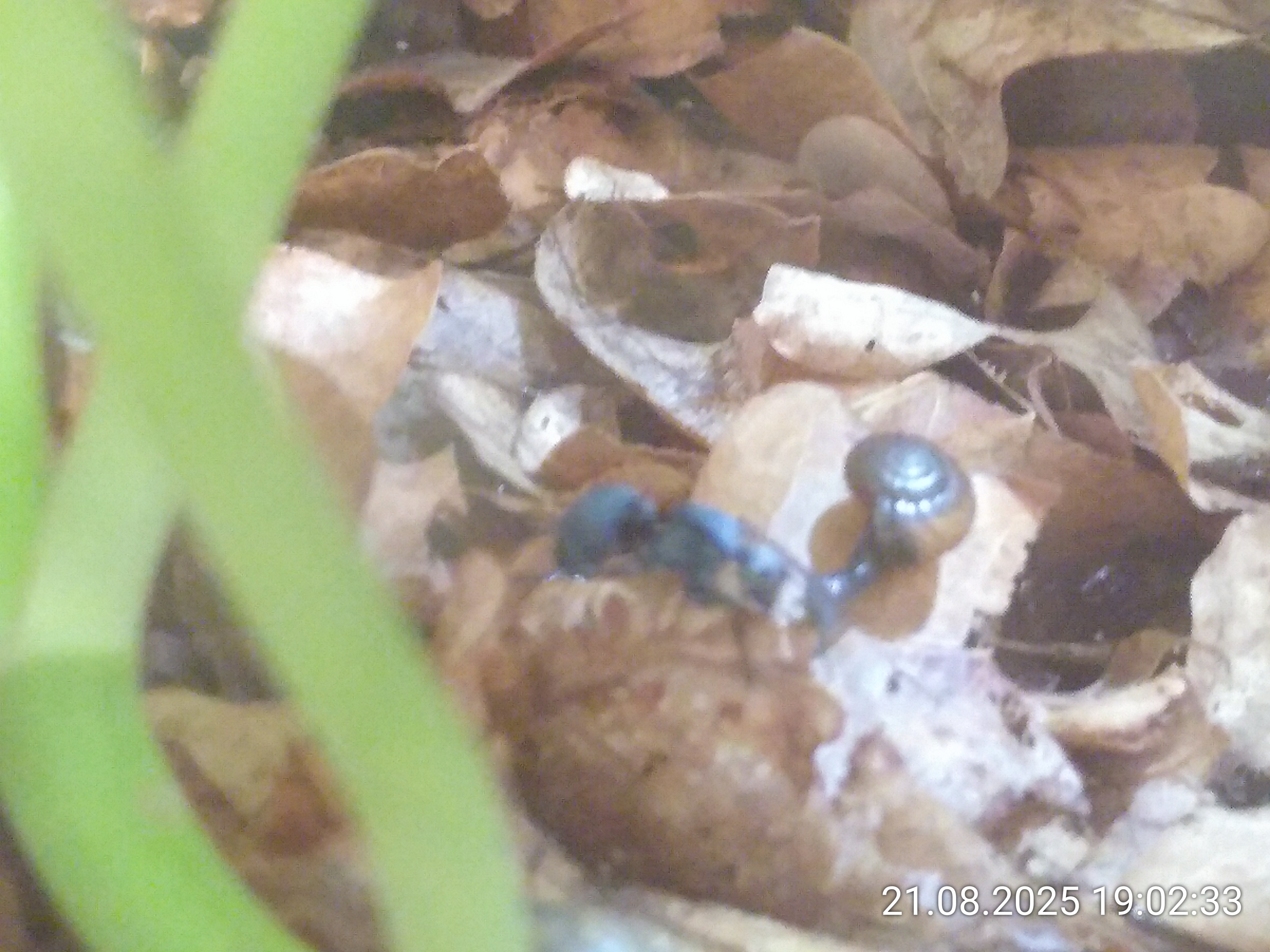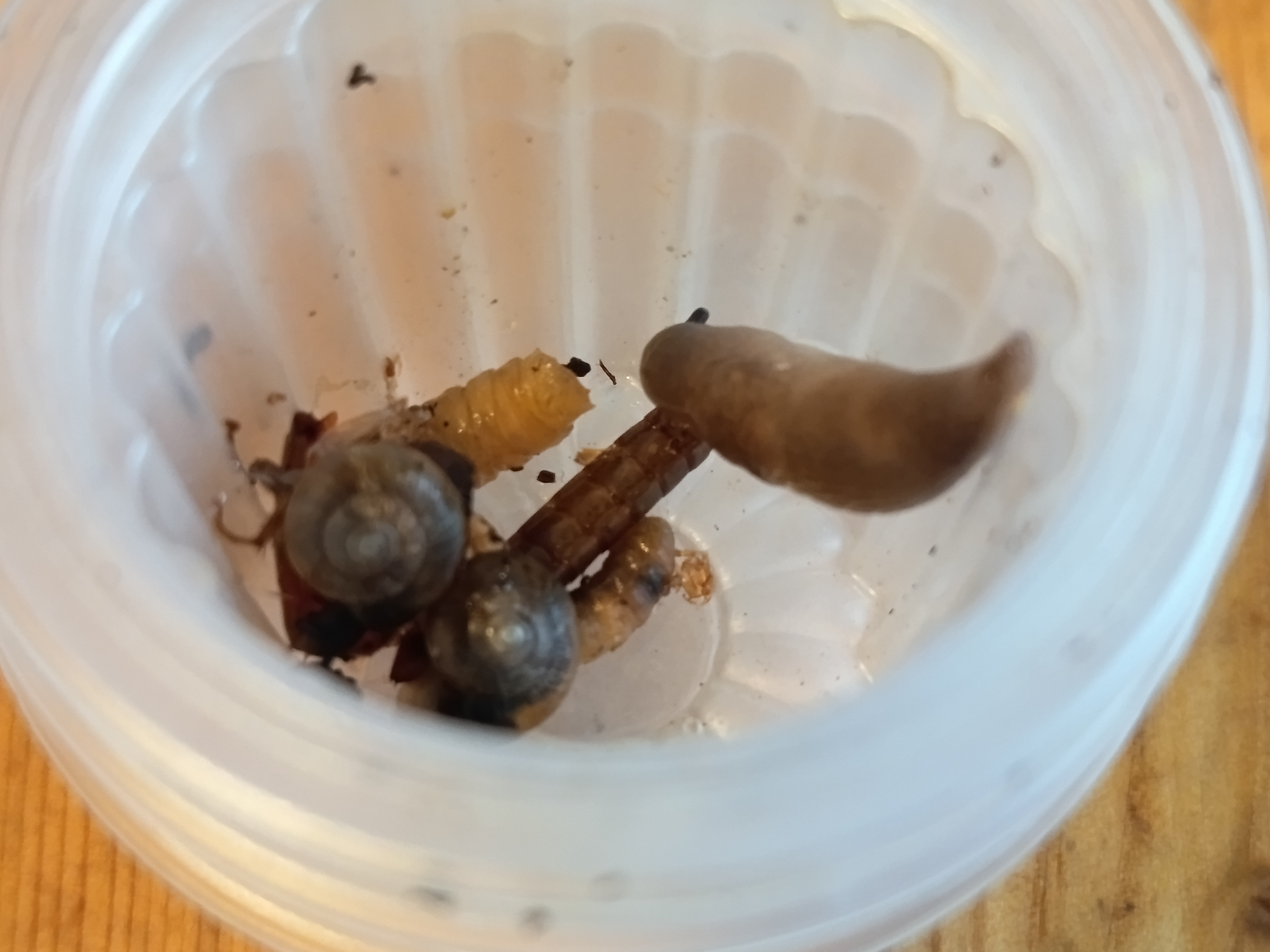 Letzte Woche haben sie ein Stück Mango bekommen, es aber vollkommen ignoriert. Ganz im Gegensatz zu Asseln und Schnecken. Die haben sich darauf gestürzt. Wahrscheinlich liegt das am Angebot von Invertzucker.