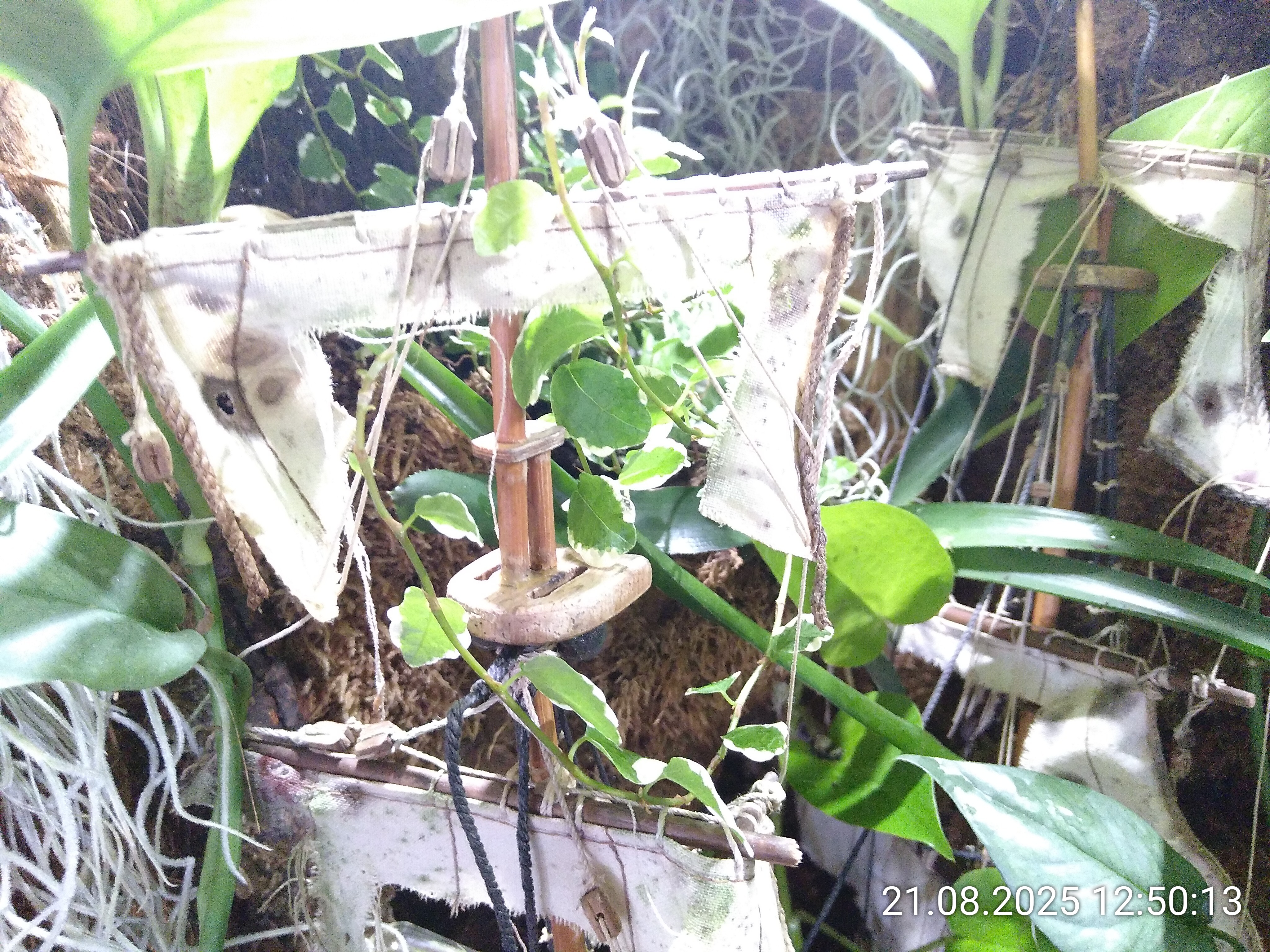 PS: Die Reparatur der Pflanzentasche sieht auch nach zwei Tagen noch stabil aus. Ein erfolgreicher Sonntag! Für diese Maßnahme stand die Tür mindestens 10 Minuten lang offen. Aber da die Piraten bisher zu 100 % (Ausnahme ist die Erkundung ihrer neuen Welt in der ersten Nacht) tagaktiv sind, kann ich so was nach Einbruch der Dunkelheit im Dschungel offenbar problemlos machen.