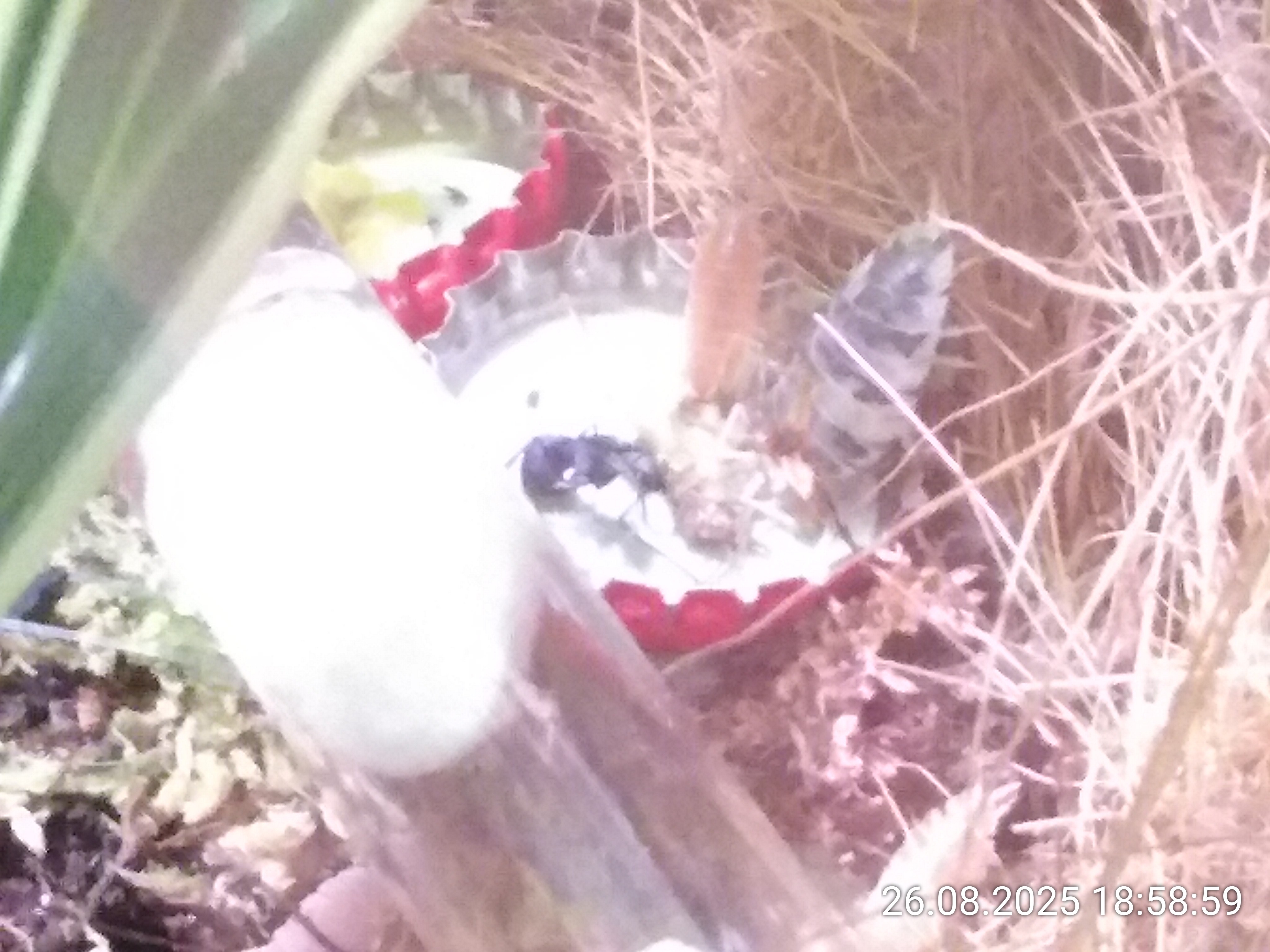 Erfolg! Wie praktisch, sie mögen Ei. dafür hat sich mindestens eine Ameise zwei Stunden lang interessiert. Hoffentlich kann ich sie dauerhaft an Heimchen oder Mehlwürmer gewöhnen. Oder an irgendwelche TK-Insekten. Bisher scheinen sie hauptsächlich Fliegen und Spinnen genommen zu haben. Zwei der drei Invertzucker-RG haben sie auch schon gefunden.