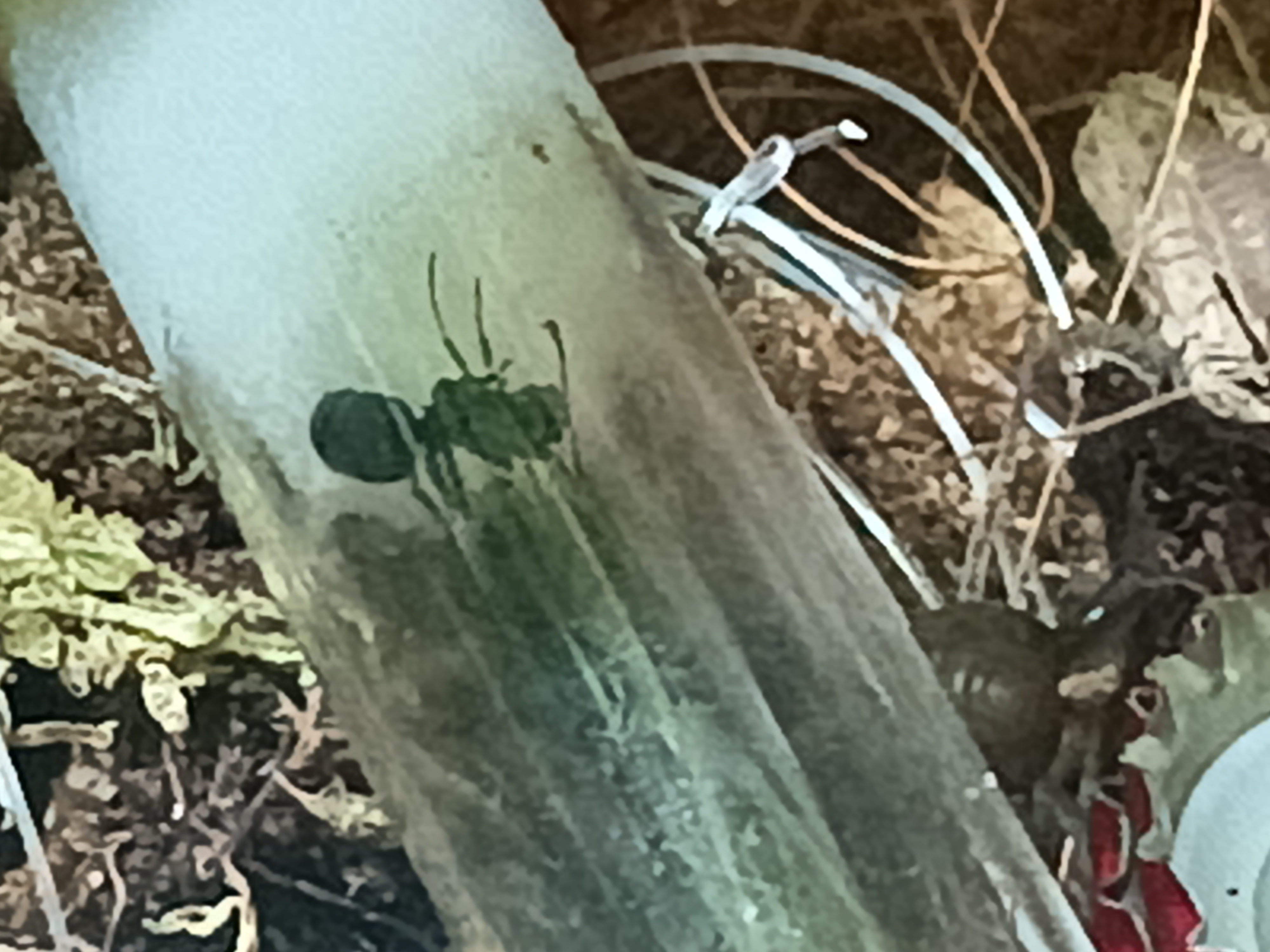Als ich die Kolonie im August ins Terrarium entlassen habe, waren es ungefähr 50 Tiere. Daher kann man auch jetzt noch nicht viele Außenaktivitäten erwarten. Tagsüber sind aber immer ein paar irgendwo zu sehen. Meistens in der Nähe ihrer Futterstelle. Mehr als vier oder fünf sind aber echt eine Ausnahme. Und genau so eine konnte ich letztens beobachten.