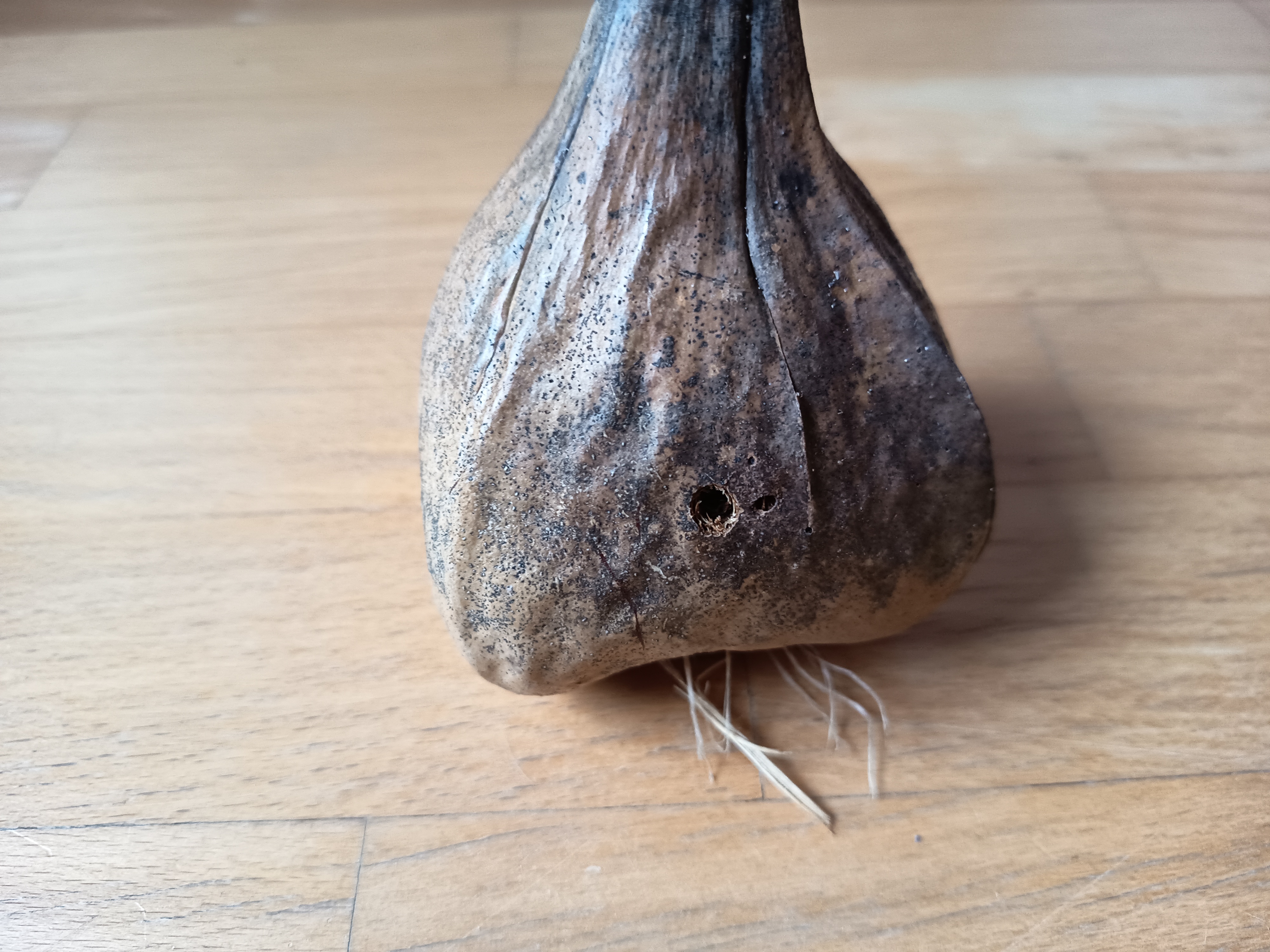 An einem Strand in Thailanf habe ich diese alte vertrocknete Kokosnuss gefunden, die auch schon zwei Löcher hatte. Eins davon habe ich aufgebohrt. Nach zwei Quarantäne-Frostnächten durfte sie dann ins Terrarium.